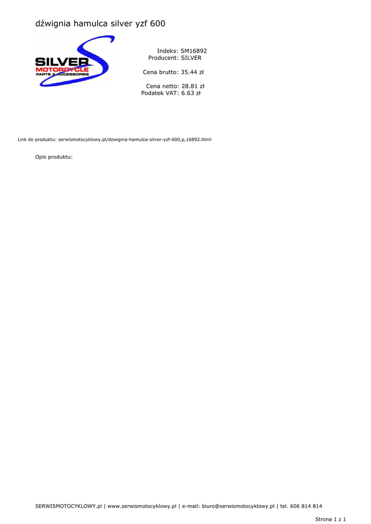 dźwignia hamulca silver yzf 600 Indeks: SM16892 Producent: SILVER Cena brutto: 35.44 zł Cena netto: 28.81 zł Podatek VAT: 6.63 zł Link do produktu: serwismotocyklowy.pl/dzwignia-hamulca-silver-yzf-600,p,16892.html Opis produktu: SERWISMOTOCYKLOWY.pl | www.serwismotocyklowy.pl | e-mail: [email protected] | tel. 606 814 814 Strona 1 z 1