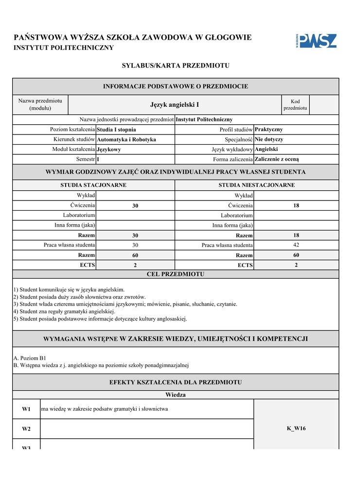 PAŃSTWOWA WYŻSZA SZKOŁA ZAWODOWA W GŁOGOWIE INSTYTUT POLITECHNICZNY SYLABUS/KARTA PRZEDMIOTU INFORMACJE PODSTAWOWE O PRZEDMIOCIE Nazwa przedmiotu (modułu) Kod przedmiotu Język angielski I Nazwa jednostki prowadzącej przedmiot Instytut Politechniczny Poziom kształcenia Studia I stopnia Profil studiów Praktyczny Kierunek studiów Automatyka i Robotyka Specjalność Nie dotyczy Moduł kształcenia Językowy Język wykładowy Angielski Semestr I Forma zaliczenia Zaliczenie z oceną WYMIAR GODZINOWY ZAJĘĆ ORAZ INDYWIDUALNEJ PRACY WŁASNEJ STUDENTA STUDIA STACJONARNE STUDIA NIESTACJONARNE Wykład Ćwiczenia Wykład Ćwiczenia 30 Laboratorium Laboratorium Inna forma (jaka) Inna forma (jaka) 18 Razem 30 Razem 18 Praca własna studenta 30 Praca własna studenta 42 Razem 60 Razem 60 ECTS 2 ECTS 2 CEL PRZEDMIOTU 1) Student komunikuje się w języku angielskim. 2) Student posiada duży zasób słownictwa oraz zwrotów. 3) Student włada czterema umiejętnościami językowymi; mówienie, pisanie, słuchanie, czytanie. 4) Student zna reguły gramatyki angielskiej. 5) Student posiada podstawowe informacje dotyczące kultury anglosaskiej. WYMAGANIA WSTĘPNE W ZAKRESIE WIEDZY, UMIEJĘTNOŚCI I KOMPETENCJI A. Poziom B1 B. Wstępna wiedza z j. angielskiego na poziomie szkoły ponadgimnazjalnej EFEKTY KSZTAŁCENIA DLA PRZEDMIOTU Wiedza W1 W2 W3 ma wiedzę w zakresie podsatw gramatyki i słownictwa K_W16 Umiejętności U1 Potrafi budować zdania w sposób poprawny gramatycznie U2 Potrafi słuchać i czytać ze zrozumieniem U3 Potrafi uzyskiwać informacje i ich udzielać K_U04 Kompetencje społeczne K1 rozumie potrzebę ciągłego doskonalenia umiejętności językowych w zakresie komunikacji społeecznej oraz pozyskiwania wiedzy zawodowej K_K03 K2 K3 TREŚCI KSZTAŁCENIA (PROGRAMOWE) STUDIA STACJONARNE Temat W Liczba godzin C L /P C1-Mood food – present simple and continuous, action and non action verbs, jedzenie i gotowanie 6 C2-Family life – future forms: present continuous, going to, will/won’t, zaimki wzajemne, rodzina, przymiotniki opisujące osobowość 6 C3-Writing-opisywanie osób 2 C4-Practical English – Meeting the parents 2 C5-Spend or save? – present perfect and past simple, pieniądze 6 C6-Changing lives – present perfect + for/since, present perfect continuous, silne formy przymiotnika 6 C7-Writing-nieformalny email 2 RAZEM 0 30 0 STUDIA NIESTACJONARNE Temat W Liczba godzin C L /P C1-Mood food – present simple and continuous, action and non action verbs, jedzenie i gotowanie 4 C2-Family life – future forms: present continuous, going to, will/won’t, zaimki wzajemne, rodzina, przymiotniki opisujące osobowość 4 C3-Writing-opisywanie osób 2 C4-Practical English – Meeting the parents 2 C5-Spend or save? – present perfect and past simple, pieniądze 2 C6-Changing lives – present perfect + for/since, present perfect continuous, silne formy przymiotnika 2 C7-Writing-nieformalny email 2 RAZEM 0 18 0 Egzamin/ Prace kontrolne Projekty Aktywność na zajęciach 70% 20% 10% WERYFIKACJA EFEKTÓW KSZTAŁCENIA Kod Opis Waga w werfikacji efektów kształcenia W1 ma wiedzę w zakresie podsatw gramatyki i słownictwa W2 0 W3 0 U1 Potrafi budować zdania w sposób poprawny gramatycznie U2 Potrafi słuchać i czytać ze zrozumieniem U3 Potrafi uzyskiwać informacje i ich udzielać K1 rozumie potrzebę ciągłego doskonalenia umiejętności językowych w zakresie komunikacji społeecznej oraz pozyskiwania wiedzy zawodowej K2 0 K3 0 OBCIĄŻENIE PRACĄ STUDENTA 1 2 Godziny zajęć dydaktycznych zgodnie z planem studiów Praca własna studenta Suma ECTS Stacjonarne Niestacjonarne 30 30 60 2 18 42 60 2 LITERATURA Podstawowa 1 Oxenden C., Latham-Koenig C. : English File intermediate, third edition, student’s book, , Oxford University Press 2013 2 Oxenden C., Latham-Koenig C. : English File intermediate, third edition, workbook, Oxford University Press 2013 Uzupełniajaca 1 Murphy R.: English Grammar in Use, Cambridge University Press 2012 PAŃSTWOWA WYŻSZA SZKOŁA ZAWODOWA W GŁOGOWIE INSTYTUT POLITECHNICZNY SYLABUS/KARTA PRZEDMIOTU INFORMACJE PODSTAWOWE O PRZEDMIOCIE Nazwa przedmiotu (modułu) Kod przedmiotu Język angielski II Nazwa jednostki prowadzącej przedmiot Instytut Politechniczny Poziom kształcenia Studia I stopnia Profil studiów Praktyczny Kierunek studiów Automatyka i Robotyka Specjalność Nie dotyczy Moduł kształcenia Językowy Język wykładowy Angielski Semestr II Forma zaliczenia Zaliczenie z oceną WYMIAR GODZINOWY ZAJĘĆ ORAZ INDYWIDUALNEJ PRACY WŁASNEJ STUDENTA STUDIA STACJONARNE STUDIA NIESTACJONARNE Wykład Ćwiczenia Wykład Ćwiczenia 30 Laboratorium Laboratorium Inna forma (jaka) Inna forma (jaka) 18 Razem 30 Razem 18 Praca własna studenta 30 Praca własna studenta 42 Razem 60 Razem 60 ECTS 2 ECTS 2 CEL PRZEDMIOTU 1) Student komunikuje się w języku angielskim. 2) Student posiada duży zasób słownictwa oraz zwrotów. 3) Student włada czterema umiejętnościami językowymi; mówienie, pisanie, słuchanie, czytanie. 4) Student zna reguły gramatyki angielskiej. 5) Student posiada podstawowe informacje dotyczące kultury anglosaskiej. WYMAGANIA WSTĘPNE W ZAKRESIE WIEDZY, UMIEJĘTNOŚCI I KOMPETENCJI A. Język angielski I B. Wiedza na poziomie B1 EFEKTY KSZTAŁCENIA DLA PRZEDMIOTU Wiedza W1 W2 W3 posiada specjalistyczną wiedzę w zakresie słownictwa angielskiego w wybranej specjalności K_W16 Umiejętności U1 Posiada elementarne umiejętności w zakresie rozumienia głównych myśli języka standardowego, np. program telewizyjny U2 Posiada elementarne umiejętności w zakresie czytania i pisania tekstów dotyczących życia codziennego i zawodowego U3 Posiada elementarne umiejętności w zakresie w zakresie mówienia – włączenie się do rozmów na znane tematy, radzenie sobie w sytuacjach życia codziennego i zawodowego K1 K_U04 Kompetencje społeczne ma świadomość szybkiej dezaktualizacji nabytej wiedzy w zakresie układów automaty