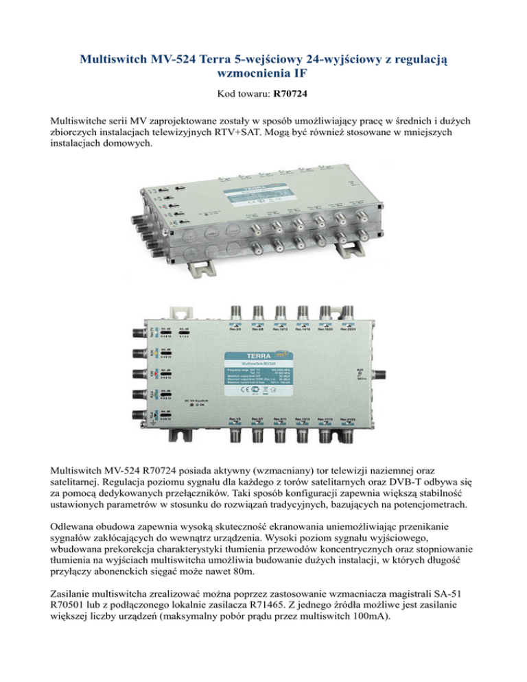 Multiswitch MV-524 Terra 5-wejściowy 24-wyjściowy z regulacją wzmocnienia IF Kod towaru: R70724 Multiswitche serii MV zaprojektowane zostały w sposób umożliwiający pracę w średnich i dużych zbiorczych instalacjach telewizyjnych RTV+SAT. Mogą być również stosowane w mniejszych instalacjach domowych. Multiswitch MV-524 R70724 posiada aktywny (wzmacniany) tor telewizji naziemnej oraz satelitarnej. Regulacja poziomu sygnału dla każdego z torów satelitarnych oraz DVB-T odbywa się za pomocą dedykowanych przełączników. Taki sposób konfiguracji zapewnia większą stabilność ustawionych parametrów w stosunku do rozwiązań tradycyjnych, bazujących na potencjometrach. Odlewana obudowa zapewnia wysoką skuteczność ekranowania uniemożliwiając przenikanie sygnałów zakłócających do wewnątrz urządzenia. Wysoki poziom sygnału wyjściowego, wbudowana prekorekcja charakterystyki tłumienia przewodów koncentrycznych oraz stopniowanie tłumienia na wyjściach multiswitcha umożliwia budowanie dużych instalacji, w których długość przyłączy abonenckich sięgać może nawet 80m. Zasilanie multiswitcha zrealizować można poprzez zastosowanie wzmacniacza magistrali SA-51 R70501 lub z podłączonego lokalnie zasilacza R71465. Z jednego źródła możliwe jest zasilanie większej liczby urządzeń (maksymalny pobór prądu przez multiswitch 100mA). Parametry techniczne Nazwa MV-524 MV-532 Kod R70724 R70732 Ilość wejść 5 5 Ilość wyjść 24 32 Pasmo pracy [MHz] SAT 950 - 2400 DVB-T/Radio 47 - 790 SAT wyjścia 1-8 5...14 wyjścia 9-16 4...12 wyjścia 17-24 3...10 wyjścia 25-32 Wmocnienie (prekorekcja ch-ki tłumienia przewodu) [dB] DVB-T/Radio 2...8 wyjścia 1-8 -1...5 wyjścia 9-16 -2...3 wyjścia 17-24 -3...1 wyjścia 25-32 Regulacja wzmocnienia [dB] - - -4...-1 SAT 12, krok 4dB DVB-T/Radio 15, krok 1dB Max. poziom sygnału SAT (IMD3=35dB)* [dBμV] Max. poziom sygnału DVB-T (IMD3=60dB)* [dBμV] 105 wyjścia 1-8 86 wyjścia 9-16 84 wyjścia 17-24 82 wyjścia 25-32 - 80 Separacja wejść SAT [dB] Separacja wyjść [dB] > 30 pasmo SAT > 30 pasmo DVB-T > 35 Pobór prądu z odbiornika [mA] Maksymalny pobór prądu z linii H oraz zewnętrznego źródła zasilania Sygnały sterujące < 65 18V 100mA 14/18V, 0/22kHz Zakres temperatur pracy [ºC] Wymiary [mm] Masa [kg] -20...+50 227x135x50 267x135x50 1,5 1,9