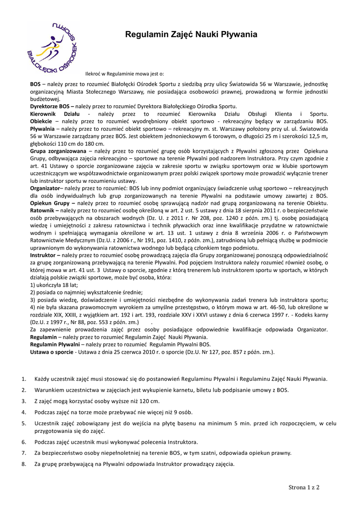 Regulamin Zajęć Nauki Pływania Ilekroć w Regulaminie mowa jest o: BOS – należy przez to rozumieć Białołęcki Ośrodek Sportu z siedzibą przy ulicy Światowida 56 w Warszawie, jednostkę organizacyjną Miasta Stołecznego Warszawy, nie posiadająca osobowości prawnej, prowadzoną w formie jednostki budżetowej. Dyrektorze BOS – należy przez to rozumieć Dyrektora Białołęckiego Ośrodka Sportu. Kierownik Działu - należy przez to rozumieć Kierownika Działu Obsługi Klienta i Sportu. Obiekcie – należy przez to rozumieć wyodrębniony obiekt sportowo - rekreacyjny będący w zarządzaniu BOS. Pływalnia – należy przez to rozumieć obiekt sportowo – rekreacyjny m. st. Warszawy położony przy ul. ul. Światowida 56 w Warszawie zarządzany przez BOS. Jest obiektem jednonieckowym 6 torowym, o długości 25 m i szerokości 12,5 m, głębokości 110 cm do 180 cm. Grupa zorganizowana – należy przez to rozumieć grupę osób korzystających z Pływalni zgłoszoną przez Opiekuna Grupy, odbywająca zajęcia rekreacyjno – sportowe na terenie Pływalni pod nadzorem Instruktora. Przy czym zgodnie z art. 41 Ustawy o sporcie zorganizowane zajęcia w zakresie sportu w związku sportowym oraz w klubie sportowym uczestniczącym we współzawodnictwie organizowanym przez polski związek sportowy może prowadzić wyłącznie trener lub instruktor sportu w rozumieniu ustawy. Organizator– należy przez to rozumieć: BOS lub inny podmiot organizujący świadczenie usług sportowo – rekreacyjnych dla osób indywidualnych lub grup zorganizowanych na terenie Pływalni na podstawie umowy zawartej z BOS. Opiekun Grupy – należy przez to rozumieć osobę sprawującą nadzór nad grupą zorganizowaną na terenie Obiektu. Ratownik – należy przez to rozumieć osobę określoną w art. 2 ust. 5 ustawy z dnia 18 sierpnia 2011 r. o bezpieczeństwie osób przebywających na obszarach wodnych (Dz. U. z 2011 r. Nr 208, poz. 1240 z późn. zm.) tj. osobę posiadającą wiedzę i umiejętności z zakresu ratownictwa i technik pływackich oraz inne kwalifikacje przydatne w ratownictwie wodnym i spełniającą wymagania określone w art. 13 ust. 1 ustawy z dnia 8 września 2006 r. o Państwowym Ratownictwie Medycznym (Dz.U. z 2006 r., Nr 191, poz. 1410, z późn. zm.), zatrudnioną lub pełniącą służbę w podmiocie uprawnionym do wykonywania ratownictwa wodnego lub będącą członkiem tego podmiotu. Instruktor – należy przez to rozumieć osobę prowadzącą zajęcia dla Grupy zorganizowanej ponoszącą odpowiedzialność za grupę zorganizowaną przebywającą na terenie Pływalni. Pod pojęciem Instruktora należy rozumieć również osobę, o której mowa w art. 41 ust. 3 Ustawy o sporcie, zgodnie z którą trenerem lub instruktorem sportu w sportach, w których działają polskie związki sportowe, może być osoba, która: 1) ukończyła 18 lat; 2) posiada co najmniej wykształcenie średnie; 3) posiada wiedzę, doświadczenie i umiejętności niezbędne do wykonywania zadań trenera lub instruktora sportu; 4) nie była skazana prawomocnym wyrokiem za umyślne przestępstwo, o którym mowa w art. 46-50, lub określone w rozdziale XIX, XXIII, z wyjątkiem art. 192 i art. 193, rozdziale XXV i XXVI ustawy z dnia 6 czerwca 1997 r. - Kodeks karny (Dz.U. z 1997 r., Nr 88, poz. 553 z późn. zm.) . Za zapewnienie prowadzenia zajęć przez osoby posiadające odpowiednie kwalifikacje odpowiada Organizator. Regulamin – należy przez to rozumieć Regulamin Zajęć Nauki Pływania. Regulamin Pływalni – należy przez to rozumieć Regulamin Pływalni BOS. Ustawa o sporcie - Ustawa z dnia 25 czerwca 2010 r. o sporcie (Dz.U. Nr 127, poz. 857 z późn. zm.). 1. Każdy uczestnik zajęć musi stosować się do postanowień Regulaminu Pływalni i Regulaminu Zajęć Nauki Pływania. 2. Warunkiem uczestnictwa w zajęciach jest wykupienie karnetu, biletu lub podpisanie umowy z BOS. 3. Z zajęć mogą korzystać osoby wyższe niż 120 cm. 4. Podczas zajęć na torze może przebywać nie więcej niż 9 osób. 5. Uczestnik zajęć zobowiązany jest do wejścia na płytę basenu na minimum 5 min. przed ich rozpoczęciem, w celu przygotowania się do zajęć. 6. Podczas zajęć uczestnik musi wykonywać polecenia Instruktora. 7. Za bezpieczeństwo osoby niepełnoletniej na terenie BOS, w tym szatni, odpowiada opiekun prawny. 8. Za grupę przebywającą na Pływalni odpowiada Instruktor prowadzący zajęcia. Strona 1 z 2 9. W przypadku niepełnoletnich uczestników, na pierwszych zajęciach, po wcześniejszym uzgodnieniu z instruktorem, dopuszczalne jest przebywanie na terenie Pływalni opiekuna prawnego. 10. W szczególnych przypadkach Instruktor może wyrazić zgodę na przebywanie opiekuna prawnego na kolejnych zajęciach. 11. Instruktor ma prawo przenieść uczestnika zajęć do innej grupy ćwiczebnej, jeżeli jego umiejętności pływackie na to wskazują. 12. Uczestnik biorący udział w zajęciach, a w przypadku osób niepełnoletnich opiekun prawny, deklaruje tym samym, iż jego stan zdrowia pozwala na uczestnictwo w zajęciach sportowo-rekreacyjnych i nie ma żadnych przeciwwskazań lekarskich do brania czynnego udziału w zajęciach. 13. Jeżeli uczestnik zajęć poczuje się źle, ma obowiązek zgłosić ten fakt prowadzącemu zajęcia. 14. Karnet jest imienny i nie może być udostępniany osobom trzecim. 15. Karnet jest ważny przez okres trzech miesięcy i upoważnia do uczestnictwa w jednych zajęciach w tygodniu. 16. W przypadku niewykorzystania karnetu nie przysługuje przedłużenie jego ważności ani zwrot dokonanej wpłaty z zastrzeżeniem pkt. 17, 18, 19. 17. W przypadku remontów, przerw technologicznych etc. uniemożliwiających korzystanie z zajęć nauki pływania zakupione karnety przedłużają swoją ważność o czas w którym Uczestnik nie mógł korzystać z zajęć. 18. Uczestnikowi zajęć przysługuje zwrot kosztów zakupu karnetu wyłącznie w przypadku całkowite