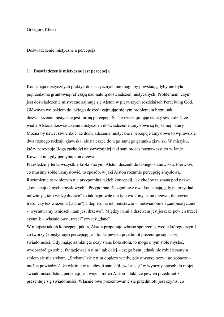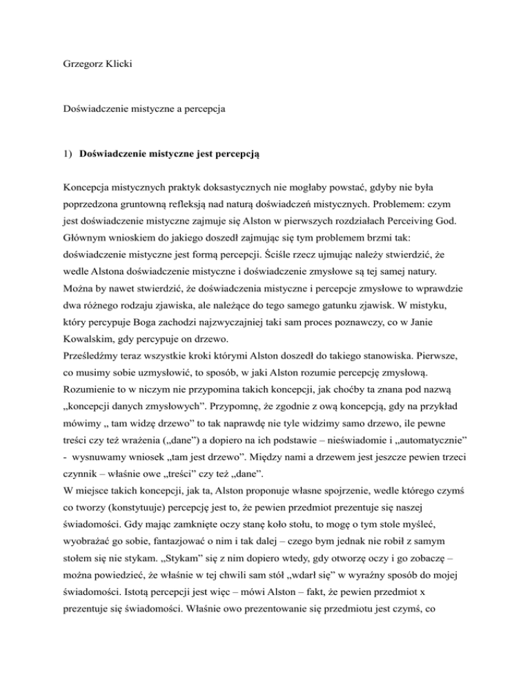 Grzegorz Klicki Doświadczenie mistyczne a percepcja 1) Doświadczenie mistyczne jest percepcją Koncepcja mistycznych praktyk doksastycznych nie mogłaby powstać, gdyby nie była poprzedzona gruntowną refleksją nad naturą doświadczeń mistycznych. Problemem: czym jest doświadczenie mistyczne zajmuje się Alston w pierwszych rozdziałach Perceiving God. Głównym wnioskiem do jakiego doszedł zajmując się tym problemem brzmi tak: doświadczenie mistyczne jest formą percepcji. Ściśle rzecz ujmując należy stwierdzić, że wedle Alstona doświadczenie mistyczne i doświadczenie zmysłowe są tej samej natury. Można by nawet stwierdzić, że doświadczenia mistyczne i percepcje zmysłowe to wprawdzie dwa różnego rodzaju zjawiska, ale należące do tego samego gatunku zjawisk. W mistyku, który percypuje Boga zachodzi najzwyczajniej taki sam proces poznawczy, co w Janie Kowalskim, gdy percypuje on drzewo. Prześledźmy teraz wszystkie kroki którymi Alston doszedł do takiego stanowiska. Pierwsze, co musimy sobie uzmysłowić, to sposób, w jaki Alston rozumie percepcję zmysłową. Rozumienie to w niczym nie przypomina takich koncepcji, jak choćby ta znana pod nazwą „koncepcji danych zmysłowych”. Przypomnę, że zgodnie z ową koncepcją, gdy na przykład mówimy „ tam widzę drzewo” to tak naprawdę nie tyle widzimy samo drzewo, ile pewne treści czy też wrażenia („dane”) a dopiero na ich podstawie – nieświadomie i „automatycznie” - wysnuwamy wniosek „tam jest drzewo”. Między nami a drzewem jest jeszcze pewien trzeci czynnik – właśnie owe „treści” czy też „dane”. W miejsce takich koncepcji, jak ta, Alston proponuje własne spojrzenie, wedle którego czymś co tworzy (konstytuuje) percepcję jest to, że pewien przedmiot prezentuje się naszej świadomości. Gdy mając zamknięte oczy stanę koło stołu, to mogę o tym stole myśleć, wyobrażać go sobie, fantazjować o nim i tak dalej – czego bym jednak nie robił z samym stołem się nie stykam. „Stykam” się z nim dopiero wtedy, gdy otworzę oczy i go zobaczę – można powiedzieć, że właśnie w tej chwili sam stół „wdarł się” w wyraźny sposób do mojej świadomości. Istotą percepcji jest więc – mówi Alston – fakt, że pewien przedmiot x prezentuje się świadomości. Właśnie owo prezentowanie się przedmiotu jest czymś, co tworzy percepcję i pozwala odróżnić ją od innych zjawisk świadomych, takich jak na przykład wyobrażanie sobie czegoś. Tylko w percepcji jest tak, że prezentuje się nam pewien przedmiot. Można powiedzieć, że tylko percepcja pozwala na to, by to sam przedmiot x jakoś się nam zademonstrował. W innych aktach świadomych to raczej my coś z tym przedmiotem robimy. Gdy – przykładowo – wyobrażam sobie przedmiot x, to sam ten przedmiot nie pojawia się wcale. Jest tylko moja wyobraźnia, która może niejako wedle własnego upodobania przedstawiać sobie przedmiot x. Podobnie jest, gdy tylko rozmyślam o tym przedmiocie, czy też gdy fantazjuję sobie na jego temat. Tak więc fakt, że coś jest dane czy też prezentowane świadomości jest czymś, co tworzy (konstytuuje) percepcję. Podobne myśli w tej sprawie mieli na przykład Moore i Russell – mówi Alston – ale dominujący trend w rozważaniach nad percepcją był inny. Ujmował on percepcję raczej jako identyfikację przedmiotu x, a więc akt, w którym kluczową rolę odgrywają pojęcia, jakimi dysponujemy. Zgodnie z tym stanowiskiem nie mogę – na przykład – widzieć drzewa jeśli nie wiem co to jest drzewo. Gdy spojrzałem w stronę drzewa odebrałem pewne treści zmysłowe, ale nie mógłbym powiedzieć, że tym samym „widzę drzewo” jeśli nie umiałbym tych danych odpowiednio nazwać, kierując się – oczywiście – pewnymi pojęciami (tu: pojęciem „drzewo”). Alston mówi, że taki pogląd na percepcję – można go nazwać „kantowskim” – może mieć tylko ktoś, kto myli ze sobą dwie rzeczy: (a) świadomość samego przedmiotu x z (b) świadomością przedmiotu x jako posiadającego cechę y (ściśle to z wiedzą, że przedmiot x posiada cechę y). Najprościej mówiąc wedle tego „kantowskiego” poglądu nie można postrzegać przedmiotu x nie wiedząc – nie mając odpowiednich pojęć - czym jest (jakie cechy posiada) ten przedmiot. Tymczasem – mówi Alston – właśnie takie przypadki są możliwe i można widzieć (postrzegać) drzewo nie wiedząc, że postrzega się drzewo. Nie można – rzecz jasna – przeczyć że wiedza (pojęcia) jakoś wpływa na to co percypujemy. Nigdy jednak – mówi Alston – owa wiedza nie jest tym, co podstawowe (konstytutywne) dla widzenia czy w ogóle percepcji. Podstawowe natomiast jest tu to, że coś się w percepcji prezentuje (demonstruje, przedstawia). Zadajmy teraz pytanie: czy doświadczenie mistyczne spełnia ten podstawowy warunek bycia percepcją (jakim jest, powtórzmy, prezentowanie się czegoś). ? Odpowiedź Alstona jest jednoznacznie twierdząca. Przywołuje on liczne zapisy mistycznych doświadczeń i stwierdza, że nie świadczą one o niczym innym, jak o tym, że pewien przedmiot – Bóg – prezentował się autorom tychże zapisów. Przeciw takiemu ich odczytaniu można by wysunąć zarzut, ze wcale nie opisują one prezentowania się jakiegoś bytu, ale tylko uwieczniają jakieś wrażenia (przewidzenia, przesłyszenia itp.) pojawiające się pod wpływem emocji czy tęsknot. Jest całkiem do pomyślenia, że kiedy człowiek jest mocno przekonany, że coś jest prawdą (tak, jak mistyk jest przekonany, że Bóg jest w Trójcy), a dodatkowo mocno i długo pragnie tego czegoś doświadczyć, w końcu – na tle psychicznym – pojawi się w nim pewne „widzenie” czy „słyszenie”. Skoro jednak doświadczenie te wytworzone są przez psychikę, to nie mogą prezentować żadnego obiektywnie istniejącego przedmiotu (Boga). Alston mówi jednak, że a
