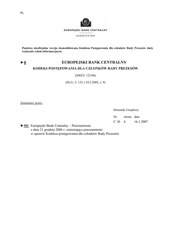 PL Poniższa nieoficjalna wersja skonsolidowana Kodeksu Postępowania dla członków Rady Prezesów służy wyłącznie celom informacyjnym. EUROPEJSKI BANK CENTRALNY ►B KODEKS POSTĘPOWANIA DLA CZŁONKÓW RADY PREZESÓW (2002/C 123/06) (Dz.U. C 123 z 24.5.2002, s. 9) Zmieniony przez: Dziennik Urzędowy Nr strona data C 10 6 ►M1 Europejski Bank Centralny – Porozumienie z dnia 21 grudnia 2006 r. zmieniające porozumienie w sprawie Kodeksu postępowania dla członków Rady Prezesów 16.1.2007 ▼B EUROPEJSKI BANK CENTRALNY KODEKS POSTĘPOWANIA DLA CZŁONKÓW RADY PREZESÓW (2002/C 123/06) CZŁONKOWIE RADY PREZESÓW EUROPEJSKIEGO BANKU CENTRALNEGO mając na uwadze, co następuje: (1) Szczególną powinnością członków Rady Prezesów jest ochrona standardów etycznych w ramach Europejskiego Systemu Banków Centralnych (ESBC) i Europejskiego Banku Centralnego (EBC) oraz ochrona dobrego imienia i efektywności działania ESCB i EBC; członkowie Rady Prezesów obowiązani są zatem zapewnić, aby ich postępowanie było zgodne z tą szczególną powinnością. (2) Członkowie Rady Prezesów wzięli pod uwagę postanowienia Kodeksu Postępowania Europejskiego Banku Centralnego przyjętego przez Zarząd EBC w dniu 10 października 2000 r., którego adresatami są wszystkie osoby zatrudnione przez EBC, PRZYJMUJĄ W DNIU 16 MAJA 2002 R. PONIŻSZE POROZUMIENIE W SPRAWIE KODEKSU POSTĘPOWANIA: 1. Zakres zastosowania Kodeks Postępowania zawiera wskazówki i określa zasady etyczne, standardy i wzorce postępowania dla członków Rady Prezesów i ich zastępców powoływanych zgodnie z art. 4 ust. 4 Regulaminu Europejskiego Banku Centralnego (zwanych dalej „członkami Rady Prezesów”) w zakresie wykonywania ich funkcji jako członków Rady Prezesów EBC. Kodeks nie wyłącza zastosowania innych zasad postępowania, których adresatami są prezesi banków centralnych oraz Kodeksu Postępowania Europejskiego Banku Centralnego, który zawiera wskazówki dla członków Zarządu EBC. 2. Zasady podstawowe Członkowie Rady Prezesów powinni przestrzegać najwyższych standardów etycznego postępowania. Oczekuje się od nich, by zachowywali się w sposób uczciwy, niezależny i bezstronny oraz by zachowywali poufność i nie kierowali się interesem własnym, jak również by unikali sytuacji wywołujących konflikt interesów z przyczyn związanych z ich stosunkami osobistymi. Oczekuje się od nich także, by byli świadomi wagi swoich obowiązków i powinności, by brali pod uwagę publiczny 2 charakter pełnionej funkcji oraz by zachowywali się w sposób podtrzymujący i propagujący zaufanie publiczne do EBC. 3. Niezależność 3.1 Zgodnie z art. 108 Traktatu ustanawiającego Wspólnotę Europejską oraz art. 7 Statutu ESBC w wykonywaniu powierzonych im uprawnień oraz zadań i obowiązków członkowie Rady Prezesów nie zwracają się o instrukcje ani ich nie przyjmują od instytucji czy organów wspólnotowych, rządów państw członkowskich ani jakiegokolwiek innego organu, w tym jakiegokolwiek organu wykonującego kompetencje władcze, którego są członkami. 3.2 Członkowie Rady Prezesów powinni działać w ogólnym interesie obszaru euro. W przypadku decyzji podejmowanych na podstawie art. 10 ust. 3 Statutu ESBC, Prezesi mogą także uwzględniać interes ich odpowiedniego banku centralnego jako udziałowca. ▼M1 3.3 Poszanowanie zasady niezależności jest niemożliwe do pogodzenia z występowaniem o przyznanie, otrzymywaniem lub akceptowaniem z jakiegokolwiek źródła, z wyjątkiem ESBC, jakichkolwiek korzyści, nagród, wynagrodzeń lub podarunków związanych w jakikolwiek sposób z funkcją członka Rady Prezesów, o wartości przekraczającej 200 EUR, niezależnie od tego, czy mają one charakter finansowy czy niefinansowy. 3.4 Członkowie Rady Prezesów mogą jednakże przyjmować zaproszenia na konferencje, przyjęcia lub wydarzenia kulturalne, wraz z oferowanym w ich ramach programem rozrywkowym, korzystając także z okazywanej gościnności, o ile uczestnictwo w danym wydarzeniu jest możliwe do pogodzenia z wykonywaniem ich obowiązków jako członków Rady Prezesów. W powyższym przypadku członkowie Rady Prezesów mogą korzystać, w zakresie odpowiadającym okresowi ich uczestnictwa w wydarzeniu, z opłacania przez organizatorów kosztów podróży i zakwaterowania, z wyjątkiem jednak przypadków, gdy organizatorem jest instytucja podlegająca ich nadzorowi. Członkowie Rady Prezesów powinni w szczególności zachowywać wzmożoną rozwagę w odniesieniu do zaproszeń indywidualnych. Powyższe zasady dotyczą w takim samym stopniu współmałżonków lub partnerów członków Rady Prezesów, jeżeli zaproszenia są skierowane także do nich, a ich uczestnictwo odpowiada międzynarodowo przyjętym zwyczajom. 3.5 Członkowie Rady Prezesów nie mogą przyjmować na własny rachunek wynagrodzeń za wykłady i wystąpienia wygłaszane w ramach ich urzędowej funkcji członka Rady Prezesów. ▼B ►M1 3.6◄ Członkowie Rady Prezesów powinni zapewnić, by wszelkie ich ewentualne działania niezwiązane z ESBC, niezależnie od tego, czy podejmowane są one za wynagrodzeniem czy 3 bez wynagrodzenia, nie miały negatywnego wpływu na ich obowiązki i nie szkodziły wizerunkowi EBC. W przypadku działalności naukowej lub akademickiej, członkowie Rady Prezesów powinni wyraźnie zastrzec, iż przedstawiając swoje stanowisko działają oni jako osoby prywatne i nie reprezentują Rady Prezesów lub EBC. Wypowiadając się publicznie w kwestiach związanych z ESBC, członkowie Rady Prezesów powinni mieć wzgląd na swoją funkcję oraz obowiązki w Radzie Prezesów. ►M1 3.7◄ Kontakty członków Rady Prezesów z grupami interesów powinny przebiegać w sposób zapewniający zachowanie niezależności członków Rady Prezesów oraz poszanowanie standardów etycznych. ►M1 3.8◄ Członkowie Rady Prezesów powinni raz do roku przesyłać wykaz prywatnych i publicznych
