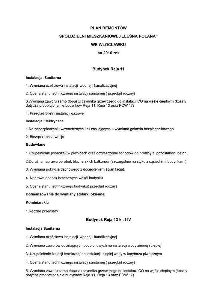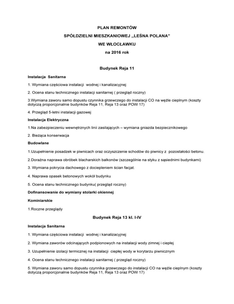 PLAN REMONTÓW SPÓŁDZIELNI MIESZKANIOWEJ ,,LEŚNA POLANA” WE WŁOCŁAWKU na 2016 rok Budynek Reja 11 Instalacja Sanitarna 1. Wymiana częściowa instalacji wodnej i kanalizacyjnej 2. Ocena stanu technicznego instalacji sanitarnej ( przegląd roczny) 3.Wymiana zaworu samo dopustu czynnika grzewczego do instalacji CO na węźle cieplnym (koszty dotyczą proporcjonalnie budynków Reja 11, Reja 13 oraz POW 17) 4. Przegląd 5-letni instalacji gazowej Instalacja Elektryczna 1.Na zabezpieczeniu wewnętrznych linii zasilających – wymiana gniazda bezpiecznikowego 2. Bieżąca konserwacja Budowlane 1.Uzupełnienie posadzek w piwnicach oraz oczyszczenie schodów do piwnicy z pozostałości betonu. 2.Doraźna naprawa obróbek blacharskich balkonów (szczególnie na styku z sąsiednimi budynkami) 3. Wymiana pokrycia dachowego z dociepleniem ścian facjat. 4. Naprawa opasek betonowych wokół budynku 5. Ocena stanu technicznego budynku( przegląd roczny) Dofinansowanie do wymiany stolarki okiennej Kominiarskie 1.Roczne przeglądy Budynek Reja 13 kl. I-IV Instalacja Sanitarna 1. Wymiana częściowa instalacji wodnej i kanalizacyjnej 2. Wymiana zaworów odcinających podpionowych na instalacji wody zimnej i ciepłej 3. Uzupełnienie izolacji termicznej na instalacji ciepłej wody w korytarzu piwnicznym 4. Ocena stanu technicznego instalacji sanitarnej ( przegląd roczny) 5. Wymiana zaworu samo dopustu czynnika grzewczego do instalacji CO na węźle cieplnym (koszty dotyczą proporcjonalnie budynków Reja 11, Reja 13 oraz POW 17) 6. Przegląd 5-letni instalacji gazowej Instalacja Elektryczna 1. Bieżąca konserwacja 2. Wymiana kasety domofonowej Budowlane 1. Podniesienie poziomu opaski betonowej przy szafce elektrycznej 2.Oczyszczenie i malowanie szafki gazowej 3. Ocena stanu technicznego budynku (przegląd roczny) Kominiarskie 1.Roczne przeglądy 2. Wyczyszczenie i udrożnienie przewodów kominowych wentylacyjnych Dofinansowanie do wymiany stolarki okiennej Budynek Reja 13 kl. V – VII Instalacje Sanitarne 1. Wymiana częściowa instalacji wodnej i kanalizacyjnej 2. Wymiana zaworów odcinających podpionowych na instalacji wody zimnej i ciepłej 3. Uzupełnienie izolacji termicznej na instalacji ciepłej wody w korytarzu piwnicznym 4. Ocena stanu technicznego instalacji sanitarnej ( przegląd roczny) 5. Wymiana zaworu samo dopustu czynnika grzewczego do instalacji CO na węźle cieplnym (koszty dotyczą proporcjonalnie budynków Reja 11, Reja 13 oraz POW 17 6. Przegląd 5-letni instalacji gazowej Instalacja Elektryczna 1. Bieżąca konserwacja 2. Wymiana kasety domofonowej Budowlane 1. Docieplenie części mieszkań poddaszowych nr XX i XX od strony południowej 2. Naprawa opasek betonowych z uzupełnieniem humusu 3.Podniesienie poziomu posadzki przed 1 stopniem zejścia do piwnicy 4. Ocena stanu technicznego budynku ( przegląd roczny) Kominiarskie 1.Roczne przeglądy 2. Wyczyszczenie i udrożnienie przewodów kominowych Dofinansowanie do wymiany stolarki okiennej Budynek POW 17 Instalacja Sanitarna 1. Wymiana częściowa instalacji wodnej i kanalizacyjnej 2 Uzupełnienie izolacji termicznej na instalacji ciepłej wody w pomieszczeniu gospodarczym 3. Wymiana zaworu samo dopustu czynnika grzewczego do instalacji CO na węźle cieplnym (koszty dotyczą proporcjonalnie budynków Reja 11, Reja 13 oraz POW 17) 4. Ocena stanu technicznego instalacji sanitarnej ( przegląd roczny) 5. Przegląd 5-letni instalacji gazowej Instalacja Elektryczna 1. Bieżąca konserwacja Budowlane 1.Naprawa powierzchni płytek chodnikowych przed biegami schodów do lokali usługowych w obrębie działki należącej do spółdzielni 2.Oczyszczenie i malowanie szafki gazowej 3. Ocena stanu technicznego budynku (przegląd roczny) 4. Uzupełnienie zaślepień w stropie piwnicznym Dofinansowanie do wymiany stolarki okiennej Kominiarskie 1.Roczne przeglądy Budynek Prusa 7 Instalacja Sanitarna 1. Wymiana częściowa instalacji wodnej i kanalizacyjnej 2. Wymiana elementów automatyki na węźle cieplnym, (koszty dot. dwóch budynków tj. Prusa 7 i Prusa 9 3. Ocena stanu technicznego instalacji sanitarnej ( przegląd roczny) 4. Przegląd 5-letni instalacji gazowej Instalacja Elektryczna 1. Klatka II – wymiana wyłącznika przeciwpożarowego 2. Bieżąca konserwacja Instalacja odgromowa 1. Przy uziomie nr 3 , pomiędzy klatką 1 a 3 wbicie sondy pionowej odgromowej, 2. Podłączenie przewodu przy bramie wjazdowej od strony garaży Prusa 9 Budowlane 1. Uzupełnienie opaski betonowej 2. Oczyszczenie powierzchni gontów bitumicznych nad wejściami do klatek schodowych z pomocowaniem obróbek blacharskich 3. Uzupełnienie okuć zewnętrznych drzwi stalowych (wyjście ewakuacyjne) wraz z malowaniem, dokonanie napraw schodów betonowych na gruncie 4. Naprawa i uzupełnienie okuć stolarki okiennej 5. Ocena stanu technicznego budynku (przegląd roczny) Dofinansowanie do wymiany stolarki okiennej Kominiarskie 1.Roczne przeglądy 2. Inwentaryzacja przewodów kominowych wentylacyjnych w pionie kuchni i łazienki mieszkania nr XX Budynek Prusa 9 Instalacja Sanitarna 1. Wymiana częściowa instalacji wodnej i kanalizacyjnej 2 Wymiana elementów automatyki na węźle cieplnym (koszty dot. dwóch budynków tj. Prusa 7 i Prusa 9 3. Ocena stanu technicznego instalacji sanitarnej ( przegląd roczny) 4. Przegląd 5-letni instalacji gazowej Instalacja Elektryczna 1. Bieżąca konserwacja Budowlane 1. Mocowanie blacharki nad szafką elektryczną wraz z naprawą tynków wokół niej 2. Oczyszczenie ręczne i malowanie szafki i rury gazowej 3. Wyprofilowanie odpływu wody od rury spustowej przy V kl schodowej wraz z uzupełnieniem tynku przy drzwiach wejściowych do V kl 4.Usunięcie resztek zbrojenia w stropach piwnicznych 5. Naprawa i uzupełnienie okuć stolarki okiennej 6. Ocena stanu technicznego budynku przegląd roczny) Dofinansowanie do wymiany stolarki okiennej Kominiarskie 1. Roczne przeglądy 2.Czyszczenie przewodu kominowego nad mieszkani