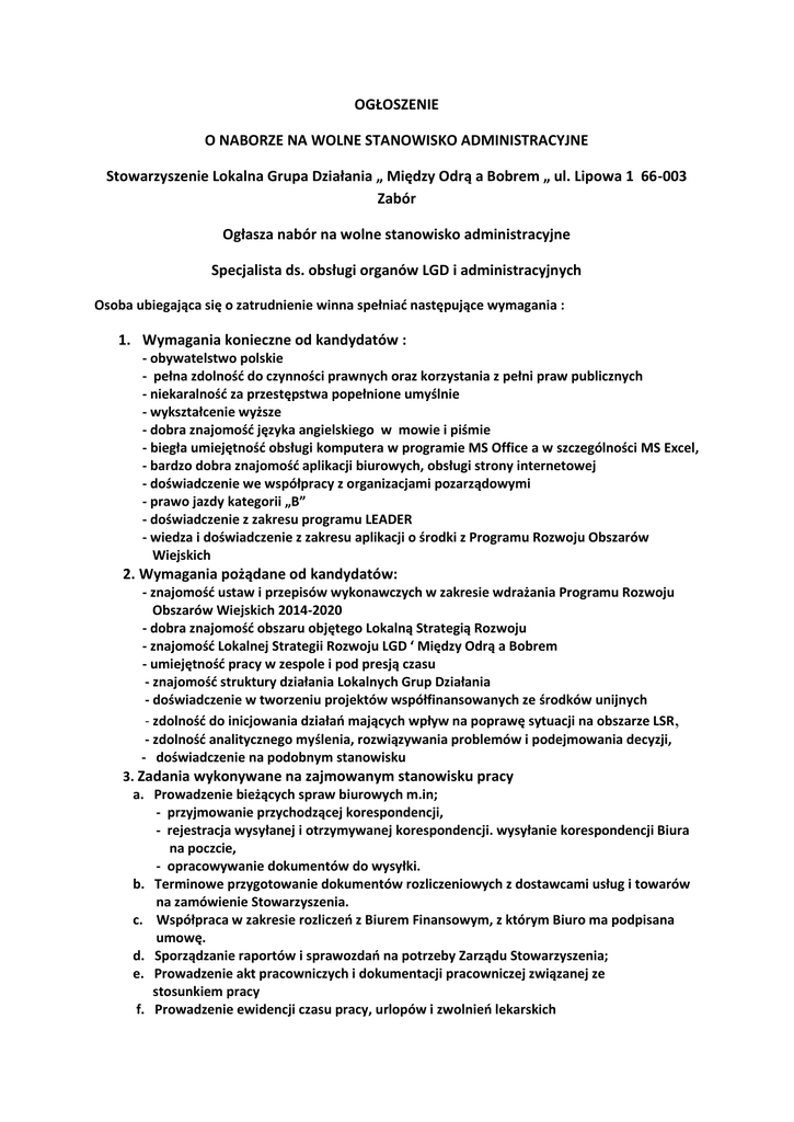 OGŁOSZENIE O NABORZE NA WOLNE STANOWISKO ADMINISTRACYJNE Stowarzyszenie Lokalna Grupa Działania „ Między Odrą a Bobrem „ ul. Lipowa 1 66-003 Zabór Ogłasza nabór na wolne stanowisko administracyjne Specjalista ds. obsługi organów LGD i administracyjnych Osoba ubiegająca się o zatrudnienie winna spełniać następujące wymagania : 1. Wymagania konieczne od kandydatów : - obywatelstwo polskie - pełna zdolność do czynności prawnych oraz korzystania z pełni praw publicznych - niekaralność za przestępstwa popełnione umyślnie - wykształcenie wyższe - dobra znajomość języka angielskiego w mowie i piśmie - biegła umiejętność obsługi komputera w programie MS Office a w szczególności MS Excel, - bardzo dobra znajomość aplikacji biurowych, obsługi strony internetowej - doświadczenie we współpracy z organizacjami pozarządowymi - prawo jazdy kategorii „B” - doświadczenie z zakresu programu LEADER - wiedza i doświadczenie z zakresu aplikacji o środki z Programu Rozwoju Obszarów Wiejskich 2. Wymagania pożądane od kandydatów: - znajomość ustaw i przepisów wykonawczych w zakresie wdrażania Programu Rozwoju Obszarów Wiejskich 2014-2020 - dobra znajomość obszaru objętego Lokalną Strategią Rozwoju - znajomość Lokalnej Strategii Rozwoju LGD ‘ Między Odrą a Bobrem - umiejętność pracy w zespole i pod presją czasu - znajomość struktury działania Lokalnych Grup Działania - doświadczenie w tworzeniu projektów współfinansowanych ze środków unijnych - zdolność do inicjowania działań mających wpływ na poprawę sytuacji na obszarze LSR, - zdolność analitycznego myślenia, rozwiązywania problemów i podejmowania decyzji, - doświadczenie na podobnym stanowisku 3. Zadania wykonywane na zajmowanym stanowisku pracy a. Prowadzenie bieżących spraw biurowych m.in; - przyjmowanie przychodzącej korespondencji, - rejestracja wysyłanej i otrzymywanej korespondencji. wysyłanie korespondencji Biura na poczcie, - opracowywanie dokumentów do wysyłki. b. Terminowe przygotowanie dokumentów rozliczeniowych z dostawcami usług i towarów na zamówienie Stowarzyszenia. c. Współpraca w zakresie rozliczeń z Biurem Finansowym, z którym Biuro ma podpisana umowę. d. Sporządzanie raportów i sprawozdań na potrzeby Zarządu Stowarzyszenia; e. Prowadzenie akt pracowniczych i dokumentacji pracowniczej związanej ze stosunkiem pracy f. Prowadzenie ewidencji czasu pracy, urlopów i zwolnień lekarskich g. Dbałość o właściwe warunki przechowywania i archiwizowania dokumentów kadrowych oraz finansowych; h. Udzielanie wsparcia Specjaliście ds. aktywizacji, projektów LSR i obsługi Rady, w okresach naboru a więc przy: - rejestracji składanych wniosków zgodnie z przyjętą procedurą, - udział w przygotowywaniu dokumentów dla właściwej pracy Rady, - przygotowywania dokumentów po posiedzeniach Rady / protokołów, uchwał, list /, - prowadzenia spraw związanych z odwołaniami zgodnie z przyjętą procedurą, i. Protokółowanie posiedzeń Walnego Zebrania Członków i Zarządu. j. Prowadzenie doradztwa dla beneficjentów w sprawie warunków i możliwości otrzymania dofinansowania k. prowadzenie dokumentacji Stowarzyszenia, l. sprawowanie pieczy nad sprzętem biurowym oraz zlecanie przeprowadzenia jego konserwacji lub naprawy ł. przygotowanie i prezentacja informacji na temat operacji, m. przygotowanie sprawozdań z realizacji LSR dla Zarządu, n. monitorowanie podpisywania i realizacji umów o. koordynowanie projektów współpracy p. sporządzanie opinii dotyczących problemów związanych z realizacją projektów 4. Wymagane dokumenty: a) b) c) d) e) f) list motywacyjny życiorys – curriculum vitaea kopie dokumentów potwierdzających wykształcenie, kserokopie dokumentów poświadczających staż pracy, kopie zaświadczeń o ukończonych kursach, szkoleniach, oświadczenie kandydata o posiadaniu pełnej zdolności do czynności prawnych i o korzystaniu z pełni praw publicznych g) oświadczenie kandydata o niekaralności za przestępstwo popełnione umyślnie h) oświadczenie o wyrażeniu zgody na przetwarzanie danych osobowych dla potrzeb procesu rekrutacji w Stowarzyszeniu Lokalnej Grupie Działania „Miedzy Odr a Bobrem” zgodnie z ustawą z dnia 29 sierpnia 1997r. o ochronie danych osobowych (tekst jednolity z 2002 roku, Dz. U. Nr 101, poz. 926 ze zm.) poświadczone własnoręcznym podpisem 5. Etapy konkursu: • Złożenie dokumentów przez Kandydata i ich weryfikacja • Rozmowa kwalifikacyjna 6. Wymagane dokumenty aplikacyjne należy przesyłać pocztą na adres; Stowarzyszenie Lokalna Grupa Działania -„Miedzy Odra a Bobrem”, ul. Lipowa 1, 66-003 Zabór z wyraźnym dopiskiem „Dotyczy naboru na stanowisko w LGD- „Miedzy Odra a Bobrem” w terminie do 20 czerwca 2016 r. do godz. 12.00. Decyduje data wpływu do biura Stowarzyszenia. Aplikacje, które wpłyną do Stowarzyszenia LGD „Miedzy Odra a Bobrem” po określonym wyżej terminie nie będą rozpatrywane. Informacja o wyniku naboru będzie dostępna w biurze LGD –„ Miedzy Odra a Bobrem” oraz na stronie stowarzyszenia LGD -„ Miedzy Odra a Bobrem ’’ www.miedzyodraabobrem.pl