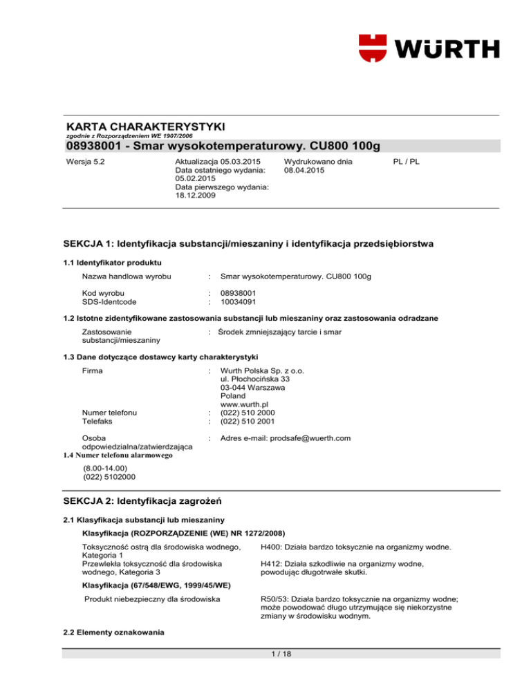 KARTA CHARAKTERYSTYKI zgodnie z Rozporządzeniem WE 1907/2006 08938001 - Smar wysokotemperaturowy. CU800 100g Wersja 5.2 Aktualizacja 05.03.2015 Data ostatniego wydania: 05.02.2015 Data pierwszego wydania: 18.12.2009 Wydrukowano dnia 08.04.2015 PL / PL SEKCJA 1: Identyfikacja substancji/mieszaniny i identyfikacja przedsiębiorstwa 1.1 Identyfikator produktu Nazwa handlowa wyrobu : Smar wysokotemperaturowy. CU800 100g Kod wyrobu SDS-Identcode : : 08938001 10034091 1.2 Istotne zidentyfikowane zastosowania substancji lub mieszaniny oraz zastosowania odradzane Zastosowanie substancji/mieszaniny : Środek zmniejszający tarcie i smar 1.3 Dane dotyczące dostawcy karty charakterystyki Firma : Numer telefonu Telefaks : : Wurth Polska Sp. z o.o. ul. Płochocińska 33 03-044 Warszawa Poland www.wurth.pl (022) 510 2000 (022) 510 2001 : Adres e-mail: [email protected] Osoba odpowiedzialna/zatwierdzająca 1.4 Numer telefonu alarmowego (8.00-14.00) (022) 5102000 SEKCJA 2: Identyfikacja zagrożeń 2.1 Klasyfikacja substancji lub mieszaniny Klasyfikacja (ROZPORZĄDZENIE (WE) NR 1272/2008) Toksyczność ostrą dla środowiska wodnego, Kategoria 1 Przewlekła toksyczność dla środowiska wodnego, Kategoria 3 H400: Działa bardzo toksycznie na organizmy wodne. H412: Działa szkodliwie na organizmy wodne, powodując długotrwałe skutki. Klasyfikacja (67/548/EWG, 1999/45/WE) Produkt niebezpieczny dla środowiska R50/53: Działa bardzo toksycznie na organizmy wodne; może powodować długo utrzymujące się niekorzystne zmiany w środowisku wodnym. 2.2 Elementy oznakowania 1 / 18 KARTA CHARAKTERYSTYKI zgodnie z Rozporządzeniem WE 1907/2006 08938001 - Smar wysokotemperaturowy. CU800 100g Wersja 5.2 Aktualizacja 05.03.2015 Data ostatniego wydania: 05.02.2015 Data pierwszego wydania: 18.12.2009 Wydrukowano dnia 08.04.2015 PL / PL Oznakowanie (ROZPORZĄDZENIE (WE) NR 1272/2008) Piktogramy określające rodzaj zagrożenia : Hasło ostrzegawcze : Uwaga Zwroty wskazujące rodzaj zagrożenia : H410 Zwroty wskazujące środki ostrożności : Zapobieganie: P273 Reagowanie: P391 Usuwanie: P501 Działa bardzo toksycznie na organizmy wodne, powodując długotrwałe skutki. Unikać uwolnienia do środowiska. Zebrać wyciek. Zawartość/ pojemnik usuwać do autoryzowanego zakładu utylizacji odpadów. Oznakowanie ograniczone (<= 125 ml) Piktogramy określające rodzaj zagrożenia : Hasło ostrzegawcze : Uwaga Zwroty wskazujące rodzaj zagrożenia : H410 Działa bardzo toksycznie na organizmy wodne, powodując długotrwałe skutki. 2.3 Inne zagrożenia Ta substancja/mieszanina nie zawiera składników uważanych albo za trwałe, podlegające bioakumulacji i toksyczne, albo bardzo trwałe i podlegające bardzo silnej bioakumulacji (vPvB) na poziomie 0,1% bądź powyżej. Ta substancja/mieszanina nie zawiera składników uważanych albo za trwałe, podlegające bioakumulacji i toksyczne, albo bardzo trwałe i podlegające bardzo silnej bioakumulacji (vPvB) na poziomie 0,1% bądź powyżej. SEKCJA 3: Skład/informacja o składnikach 3.2 Mieszaniny Składniki niebezpieczne 2 / 18 KARTA CHARAKTERYSTYKI zgodnie z Rozporządzeniem WE 1907/2006 08938001 - Smar wysokotemperaturowy. CU800 100g Wersja 5.2 Nazwa Chemiczna Miedź Aktualizacja 05.03.2015 Data ostatniego wydania: 05.02.2015 Data pierwszego wydania: 18.12.2009 Nr CAS Nr WE Numer rejestracji 7440-50-8 231-159-6 Wydrukowano dnia 08.04.2015 Klasyfikacja (67/548/EWG) Xn; R22 N; R50/53 Klasyfikacja (1272/2008/WE) Acute Tox. 4; H302 Aquatic Acute 1; H400 Aquatic Chronic 2; H411 PL / PL Stężenie [%] >= 7 - < 10 Pełen tekst zwrotów R zawartych w tej sekcji umieszczono w sekcji 16. Pełny tekst zwrotów H przytoczonych w tej Sekcji znajduje się w Sekcji 16. SEKCJA 4: Środki pierwszej pomocy 4.1 Opis środków pierwszej pomocy Porady ogólne : W razie złego samopoczucia zasięgnąć porady lekarza (w miarę możliwości pokazać etykietę). Udzielający pierwszej pomocy powinien zapewnić sobie pomoc. Usunąć z zagrożonej strefy. Nieprzytomnej osobie nigdy nie podawać nic doustnie. Natychmiast zdjąć skażone obuwie i ubranie. W przypadku wdychania : Jeżeli osoba poszkodowana oddycha, przenieść na świeże powietrze. Jeśli objawy utrzymują się, wezwać lekarza. Zapewnić poszkodowanemu ciepło i spokój. Jeżeli osoba poszkodowana nie oddycha, zastosować sztuczne oddychanie. W przypadku trudności w oddychaniu, podać tlen. W przypadku kontaktu ze skórą : W razie kontaktu, niezwłocznie spłukać skórę dużą ilością wody z mydłem. NIE stosować rozpuszczalników lub rozcieñczalników. Jeśli utrzymują się podrażnienia skóry, wezwać lekarza. Myć glikolem polietylenowym, a następnie dużą ilością wody. W przypadku kontaktu z oczami : Zabezpieczyć nieuszkodzone oko. Jeżeli to możliwe, usunąć szkła kontaktowe, jeżeli są stosowane/ W przypadku kontaktu produktu z oczami niezwłocznie przemyć je dużą ilością wody i zasięgnąć pomocy lekarskiej. W przypadku połknięcia : W razie połknięcia niezwłocznie zasięgnij porady lekarza - pokaż opakowanie lub etykietę. Przy połknięciu NIE wywoływać wymiotów. Jeśli wymiotujący leży na plecach, ułożyć go twarzą w dół. 4.2 Najważniejsze ostre i opóźnione objawy oraz skutki narażenia Brak dostępnych danych 3 / 18 KARTA CHARAKTERYSTYKI zgodnie z Rozporządzeniem WE 1907/2006 08938001 - Smar wysokotemperaturowy. CU800 100g Wersja 5.2 Aktualizacja 05.03.2015 Data ostatniego wydania: 05.02.2015 Data pierwszego wydania: 18.12.2009 Wydrukowano dnia 08.04.2015 PL / PL 4.3 Wskazania dotyczące wszelkiej natychmiastowej pomocy lekarskiej i szczególnego postępowania z poszkodowanym Brak dostępnych danych SEKCJA 5: Postępowanie w przypadku pożaru 5.1 Środki gaśnicze Odpowiednie środki gaśnicze : Piana, Suche proszki gaśnicze, Dwutlenek węgla (CO2) Niewłaściwe środki gaśnicze : Silny strumień wody 5.2 Szczególne zagrożenia związane z substancją lub mieszaniną Specy