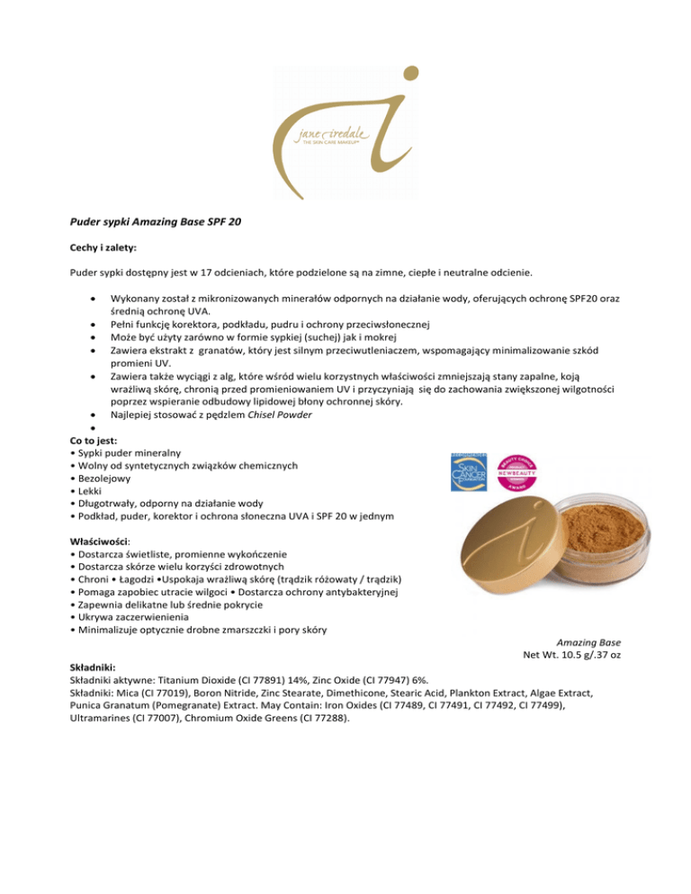 Puder sypki Amazing Base SPF 20 Cechy i zalety: Puder sypki dostępny jest w 17 odcieniach, które podzielone są na zimne, ciepłe i neutralne odcienie. • • • • • Wykonany został z mikronizowanych minerałów odpornych na działanie wody, oferujących ochronę SPF20 oraz średnią ochronę UVA. Pełni funkcję korektora, podkładu, pudru i ochrony przeciwsłonecznej Może być użyty zarówno w formie sypkiej (suchej) jak i mokrej Zawiera ekstrakt z granatów, który jest silnym przeciwutleniaczem, wspomagający minimalizowanie szkód promieni UV. Zawiera także wyciągi z alg, które wśród wielu korzystnych właściwości zmniejszają stany zapalne, koją wrażliwą skórę, chronią przed promieniowaniem UV i przyczyniają się do zachowania zwiększonej wilgotności poprzez wspieranie odbudowy lipidowej błony ochronnej skóry. Najlepiej stosować z pędzlem Chisel Powder • • Co to jest: • Sypki puder mineralny • Wolny od syntetycznych związków chemicznych • Bezolejowy • Lekki • Długotrwały, odporny na działanie wody • Podkład, puder, korektor i ochrona słoneczna UVA i SPF 20 w jednym Właściwości: • Dostarcza świetliste, promienne wykończenie • Dostarcza skórze wielu korzyści zdrowotnych • Chroni • Łagodzi •Uspokaja wrażliwą skórę (trądzik różowaty / trądzik) • Pomaga zapobiec utracie wilgoci • Dostarcza ochrony antybakteryjnej • Zapewnia delikatne lub średnie pokrycie • Ukrywa zaczerwienienia • Minimalizuje optycznie drobne zmarszczki i pory skóry Amazing Base Net Wt. 10.5 g/.37 oz Składniki: Składniki aktywne: Titanium Dioxide (CI 77891) 14%, Zinc Oxide (CI 77947) 6%. Składniki: Mica (CI 77019), Boron Nitride, Zinc Stearate, Dimethicone, Stearic Acid, Plankton Extract, Algae Extract, Punica Granatum (Pomegranate) Extract. May Contain: Iron Oxides (CI 77489, CI 77491, CI 77492, CI 77499), Ultramarines (CI 77007), Chromium Oxide Greens (CI 77288). Kluczowe składniki: • Nadtlenek tytanu (Titanium Dioxide) o Zapewnia pokrycie i kolor, oraz aktywną ochronę przeciwsłoneczną o Łagodzi stany zapalne • Tlenek cynku ( Zinc Oxide) o Zapewnia ochronę przeciwbakteryjną o Łagodzi stany zapalne • Azotek boru (Boron Nitride) o Przyleganie o Poślizg o Rozproszenie światła • Ekstrakt z minerałów morza - Plankton, ekstrakt z alg (Extracts of Sea Minerals – Plankton Extract, Algae Extract) o Łagodzi o Odżywia o Pomaga w nawilżeniu • Ekstrakt z granatu (Pomegranate Extract) o Chroni o Pomaga minimalizować zniszczenia UV Rodzaje skóry: • Przeznaczony dla skóry normalnej I suchej, bądź jej kombinacji System: • Pędzel Chisel Powder • Woda nawilżająca (D2O, Balance, POMMISST) Zalecane przygotowanie: • Oczyść skórę twarzy rękawicą Magic Mitt bądź innym wybranym zmywaczem. • Zastosuj odpowiedni produkt nawilżający i poczekaj do całkowitego wchłonięcia. • Jeżeli jest to niezbędne, spryskaj skórę twarz odpowiednią wodą. nawilżającą, następnie poczekaj do całkowitego wyschnięcia. • Wykonaj aplikację pudru sypkiego Amazing Base według instrukcji. Aplikacja: 1. Odkręć wieczko. Przebij punktowo dziurki w plastikowej ochronnej warstwie, pozwalające kontrolować ilości pudru. Dokręć pokrywę. 2. Przekręć opakowanie do góry spodem i mocno stuknij dno słoiczka 6 razy. Przekręć słoiczek wieczkiem do góry i odkręć. 3. Delikatnie zanurz jedną stronę pędzla Chisel Powder w pudrze. Obróć pędzel i delikatnie zanurz w pudrze drugą jego stronę. Uderz w bok dwa razy pędzel, aby nadmiar pudru spadł do przesiewacza. 4. Za pomocą średniego ucisku, naciśnij i poruszaj każdą ze stron pędzla do wewnętrznej krawędzi pokrywy, aby równomiernie puder pokrył całe włosie. Uderz w bok dwa razy pędzel, aby nadmiar pudru spadł do pokrywy. 5. Za pomocą średniego ucisku, aplikuj puder na prawym policzku ruchem kolistym, następnie rozprowadź puder za pomocą posuwistych ruchów w dół. 6. Powtórz kroki 3 i 4. Za pomocą średniego ucisku, aplikuj puder na lewym policzku ruchem kolistym, następnie rozprowadź puder za pomocą posuwistych ruchów w dół. 7. Powtórz kroki 3 i 4. Za pomocą średniego ucisku, aplikuj puder ruchem kolistym na czoło i skroń, na nos i jego okolice, wokół ust i podbródka, a następnie rozprowadź puder za pomocą posuwistych ruchów w dół. 8. Powtórz kroki 3 i 4. Za pomocą średniego ucisku, aplikuj od ucha do szczęki i brody, tak aby pokryć obydwie strony szyi. 9. Jeżeli istnieje taka potrzeba, nałóż puder na uszy i dekolt. 10. Spryskaj twarz i dekolt odpowiednią wodą nawilżającą. • • Jeśli potrzebne jest dodatkowe pokrycie, należy powtórzyć powyższe kroki tylko do niezbędnych obszarów twarzy, ciała. W razie potrzeby należy rozetrzeć puder czystą, suchą gąbką Flocked Sponge Ze względu na to, iż pigment jest bardzo skoncentrowany, przy pierwszym użyciu łatwo jest przesadzić z ilością pudru. Jeżeli nałożysz zbyt dużo pudru, użyj gąbki Flocked Sponge aby usunąć jego nadmiar. Jeżeli potrzebujesz dodatkowego pokrycia, nanieś puder z gąbki na wybrane miejsce. Efekt to gładkie, czyste wykończenie bez żadnej skazy. Wskazówki: Skórą tłustym, przed zastosowaniem minerałów, polecamy puder Absence. Jeżeli minerały nie wtopiły się w skórę, są sproszkowane, poczekaj parę minut aż na skórze pojawi się naturalny olej lub spryskaj skórę wodą D2O, Balance lub POMMISST. Możesz również połączyć puder sypki ze swoim ulubionym kremem, aby stworzyć kremowy podkład.