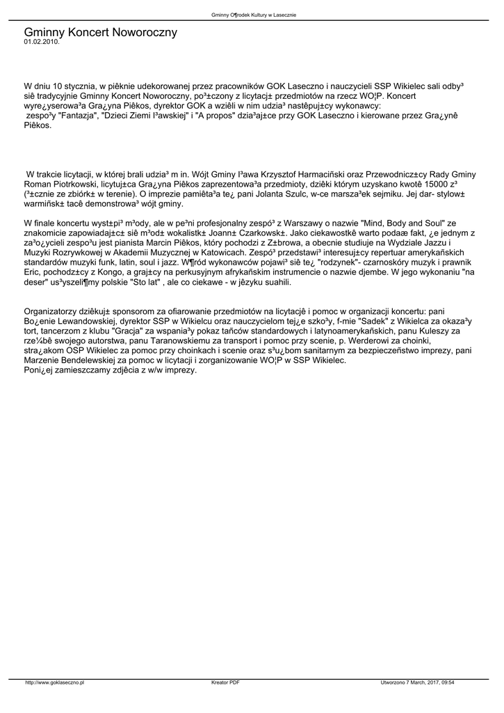 Gminny O¶rodek Kultury w Lasecznie Gminny Koncert Noworoczny 01.02.2010. W dniu 10 stycznia, w piêknie udekorowanej przez pracowników GOK Laseczno i nauczycieli SSP Wikielec sali odby³ siê tradycyjnie Gminny Koncert Noworoczny, po³±czony z licytacj± przedmiotów na rzecz WO¦P. Koncert wyre¿yserowa³a Gra¿yna Piêkos, dyrektor GOK a wziêli w nim udzia³ nastêpuj±cy wykonawcy: zespo³y "Fantazja", "Dzieci Ziemi I³awskiej" i "A propos" dzia³aj±ce przy GOK Laseczno i kierowane przez Gra¿ynê Piêkos. W trakcie licytacji, w której brali udzia³ m in. Wójt Gminy I³awa Krzysztof Harmaciñski oraz Przewodnicz±cy Rady Gminy Roman Piotrkowski, licytuj±ca Gra¿yna Piêkos zaprezentowa³a przedmioty, dziêki którym uzyskano kwotê 15000 z³ (³±cznie ze zbiórk± w terenie). O imprezie pamiêta³a te¿ pani Jolanta Szulc, w-ce marsza³ek sejmiku. Jej dar- stylow± warmiñsk± tacê demonstrowa³ wójt gminy. W finale koncertu wyst±pi³ m³ody, ale w pe³ni profesjonalny zespó³ z Warszawy o nazwie "Mind, Body and Soul" ze znakomicie zapowiadaj±c± siê m³od± wokalistk± Joann± Czarkowsk±. Jako ciekawostkê warto podaæ fakt, ¿e jednym z za³o¿ycieli zespo³u jest pianista Marcin Piêkos, który pochodzi z Z±browa, a obecnie studiuje na Wydziale Jazzu i Muzyki Rozrywkowej w Akademii Muzycznej w Katowicach. Zespó³ przedstawi³ interesuj±cy repertuar amerykañskich standardów muzyki funk, latin, soul i jazz. W¶ród wykonawców pojawi³ siê te¿ "rodzynek"- czarnoskóry muzyk i prawnik Eric, pochodz±cy z Kongo, a graj±cy na perkusyjnym afrykañskim instrumencie o nazwie djembe. W jego wykonaniu "na deser" us³yszeli¶my polskie "Sto lat" , ale co ciekawe - w jêzyku suahili. Organizatorzy dziêkuj± sponsorom za ofiarowanie przedmiotów na licytacjê i pomoc w organizacji koncertu: pani Bo¿enie Lewandowskiej, dyrektor SSP w Wikielcu oraz nauczycielom tej¿e szko³y, f-mie "Sadek" z Wikielca za okaza³y tort, tancerzom z klubu "Gracja" za wspania³y pokaz tañców standardowych i latynoamerykañskich, panu Kuleszy za rze¼bê swojego autorstwa, panu Taranowskiemu za transport i pomoc przy scenie, p. Werderowi za choinki, stra¿akom OSP Wikielec za pomoc przy choinkach i scenie oraz s³u¿bom sanitarnym za bezpieczeñstwo imprezy, pani Marzenie Bendelewskiej za pomoc w licytacji i zorganizowanie WO¦P w SSP Wikielec. Poni¿ej zamieszczamy zdjêcia z w/w imprezy. http://www.goklaseczno.pl Kreator PDF Utworzono 7 March, 2017, 09:54