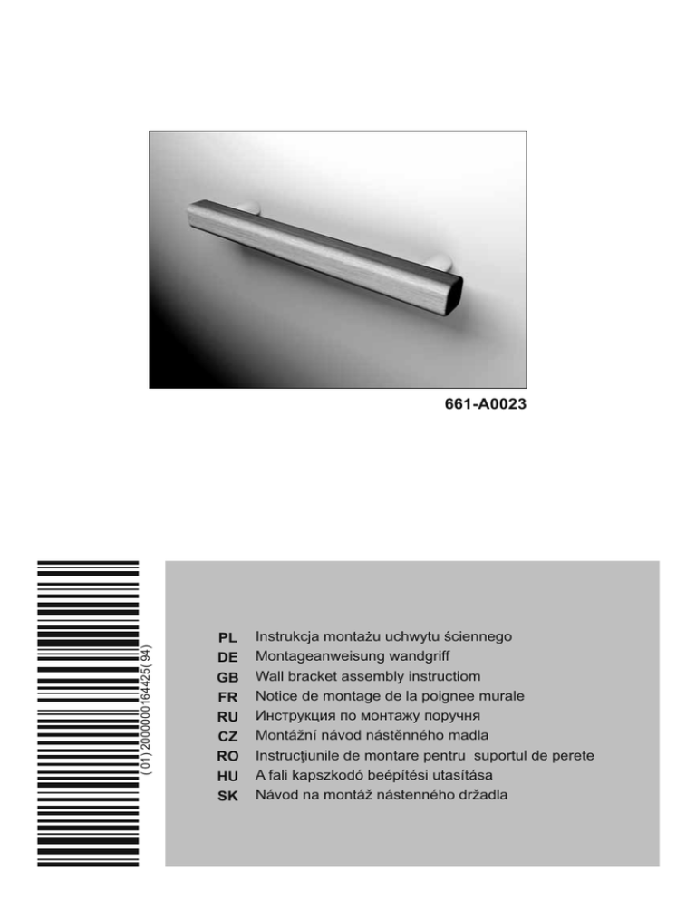 ( 01) 2000000164425( 94) 661-A0023 PL DE GB FR RU CZ RO HU SK Instrukcja montażu uchwytu ściennego Montageanweisung wandgriff Wall bracket assembly instructiom Notice de montage de la poignee murale Инструкция по монтажу поручня Montážní návod nástěnného madla Instrucţiunile de montare pentru suportul de perete A fali kapszkodó beépítési utasítása Návod na montáž nástenného držadla 661-A0023 A B C D E F 10 3mm x1 x2 x2 x2 x2 x1 70 3 2 10 300 230 10 1 5 F 4 E D C B A PL Należy pamiętać, że różne rodzaje ścian wymagają różnych materiałów mocujących. Producent wyposażył niniejszy wyrób w standardowe elementy do montażu - kołki rozporowe przeznaczone do ścian z litych materiałów typu beton, cegła, silikaty itp. Jeśli ściany wykonane są z innych materiałów (np. wzmacniane ściany gipsowokartonowe) odpowiednie kołki należy zakupić we własnym zakresie. Uwaga: Producent zastrzega sobie prawo do wprowadzania zmian w zakresie charakterystyki technicznej oraz kolorystyki opisywanych elementów. DE Es sollte berücksichtigt werden, dass verschiedene Wandtypen, unterschiedliches Befestigungsmaterial erfodern. Dieses Produkt wurde von dem Produzenten mit Standard-Montagematerial ausgestattet - Spreizdübel für Wände aus Vollmaterial wie z.B. Beton, Ziegel, Silikaten usw..Falls die Wände aus anderen Materialien gemacht wurden (z.B. Rigipsplatten) müssen andere Dübel bauseits gekauft werden). Achtung: Der Hersteller behält sich das Recht vor, technische Änderungen und Farbenänderungen in den Produkten einzuführen. FR Il convient de rappeler que différents types de parois exigent d'utiliser des matériaux de fixation différents. Le constructeur a muni le présent produit en éléments de montage standard : les chevilles d'expansion destinées aux parois en matériaux solides comme béton, brique, silicates, etc. Lorsque les parois sont exécutées en d'autres matériaux (p. ex. en panneaux de carton-plâtre renforcés), les chevilles appropriées doivent être achetées par vos soins. Attention: Le constructeur se réserve le droit d'apporter des modifications des caractéristiques techniques et des coloris des éléments décrits. RU Обратите пожалуйста внимание, разные виды стен требуют различные крепёжные элементы. Производитель оснастил изделие в стандартные элементы для установки - дюбель, предназнеченный для литых стен типа бетон, кирпич, силикаты и т.д. Если стены выполнены из других материалов (например из гипсокартона) соответствующие дюбеля купить нужно самостоятельно. Внимание: Производитель оставляет за собой право изменять технические характеристики и цветовую гамму указанных элементов. CZ Pamatujte na to, že různé druhy stěn vyžadují různý připevňovací materiál. Výrobce vybavil tento výrobek standardními montážními prvky – hmoždinky určené do stěny z litých materiálů typu beton, cihla, silikáty atp. Pokud jsou stěny zhotoveny z jiných materiálů (např. vyztužené sádrokartonové stěny), je třeba vhodné hmoždinky zakoupit ve vlastní režii. Pozor: Výrobce si vyhrazuje právo zavádět změny v rozsahu technické charakteristiky a barev uvedených součástí. RO Trebuie să aveţi în vedere faptul că fiecare tip de perete necesită alte tipuri de materiale de fixare. Producătorul a dotat acest produs cu piese standard pentru montaj dibluri pentru pereţi din materiale masive cum ar fi beton, cărămidă, silicate etc. Dacă pereţii sunt efectuaţi din alte materiale (de ex. pereţi întăriţi de gips-carton) trebuie să cumpăraţi diblurile respective. Atenţie: Producătorul îşi rezervă dreptul de a introduce schimbări în domeniul caracteristicilor tehnice şi a coloristicii elementelor descrise. HU Ne feledje, hogy a különböző faltípusokhoz különböző szerelvények szükségesek. A gyártó a termékhez standard szerelvényeket - beton, tégla, szilikát, stb. anyagú tömör falakhoz készült anyákat - mellékel. Ha a fal más anyagból, pl. vázas gipszkartonból készült, a felhasználónak külön kell megvásárolnia a megfelelő anyákat. Figyelem: A gyártó fenntartja magának a jogot a bemutatott elemek műszaki jellemzőinek és színválasztékának módosításához. SK Nezabúdajte, že rôzne druhy stien, vyžadujú rôzne upevňovacie systémy. Štandardné vybavenie, ktoré k výrobku dodáva výrobca, obsahuje – rozperky vhodné pre pevné steny z materiálov ako betón, tehla, silikáty ap. Ak sú steny postavené z iných materiálov (napr. konštrukčné sadrokartónové steny), vhodné rozperky si musíte zadovážiť zvlášť. Pozor: Výrobca si vyhradzuje právo na vykonávanie zmien v rozsahu technickej charakteristiky a farebného prevedenia popísaných dielov. „Sanplast” Spółka Akcyjna, Wymysłowice 1, 88-320 Strzelno tel. +48 52 31 88 500, fax +48 52 31 88 501, infolinia: +48 52 31 88 600 [email protected], www.sanplast.pl 175-0350A-ML-661, Druk 08/2013 GB It should be remembered that various type of walls need various type of fixing materials. Producer equipped product with standard installation elements - stretchers to the walls made of solid materials - like concrete, brick, silicates, etc. If the walls are made of other materials (for example reinforced plasterboard walls) proper stretchers should be bought within one's capacity. Notice: The producer reserves the right to introduce changes of technical parameters and colours of described elements.