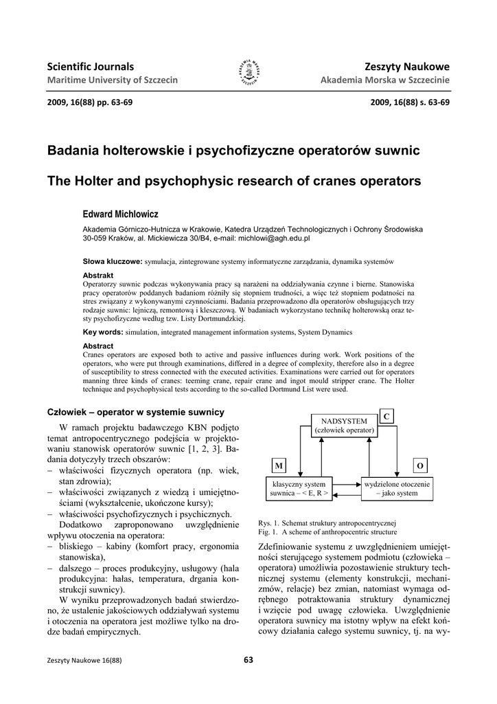Scientific Journals Zeszyty Naukowe Maritime University of Szczecin Akademia Morska w Szczecinie 2009, 16(88) pp. 63-69 2009, 16(88) s. 63-69 Badania holterowskie i psychofizyczne operatorów suwnic The Holter and psychophysic research of cranes operators Edward Michlowicz Akademia Górniczo-Hutnicza w Krakowie, Katedra Urządzeń Technologicznych i Ochrony Środowiska 30-059 Kraków, al. Mickiewicza 30/B4, e-mail: [email protected] Słowa kluczowe: symulacja, zintegrowane systemy informatyczne zarządzania, dynamika systemów Abstrakt Operatorzy suwnic podczas wykonywania pracy są narażeni na oddziaływania czynne i bierne. Stanowiska pracy operatorów poddanych badaniom różniły się stopniem trudności, a więc też stopniem podatności na stres związany z wykonywanymi czynnościami. Badania przeprowadzono dla operatorów obsługujących trzy rodzaje suwnic: lejniczą, remontową i kleszczową. W badaniach wykorzystano technikę holterowską oraz testy psychofizyczne według tzw. Listy Dortmundzkiej. Key words: simulation, integrated management information systems, System Dynamics Abstract Cranes operators are exposed both to active and passive influences during work. Work positions of the operators, who were put through examinations, differed in a degree of complexity, therefore also in a degree of susceptibility to stress connected with the executed activities. Examinations were carried out for operators manning three kinds of cranes: teeming crane, repair crane and ingot mould stripper crane. The Holter technique and psychophysical tests according to the so-called Dortmund List were used. Człowiek – operator w systemie suwnicy NADSYSTEM (człowiek operator) W ramach projektu badawczego KBN podjęto temat antropocentrycznego podejścia w projektowaniu stanowisk operatorów suwnic [1, 2, 3]. Badania dotyczyły trzech obszarów: − właściwości fizycznych operatora (np. wiek, stan zdrowia); − właściwości związanych z wiedzą i umiejętnościami (wykształcenie, ukończone kursy); − właściwości psychofizycznych i psychicznych. Dodatkowo zaproponowano uwzględnienie wpływu otoczenia na operatora: − bliskiego – kabiny (komfort pracy, ergonomia stanowiska), − dalszego – proces produkcyjny, usługowy (hala produkcyjna: hałas, temperatura, drgania konstrukcji suwnicy). W wyniku przeprowadzonych badań stwierdzono, że ustalenie jakościowych oddziaływań systemu i otoczenia na operatora jest możliwe tylko na drodze badań empirycznych. Zeszyty Naukowe 16(88) C M klasyczny system suwnica – < E, R > O wydzielone otoczenie – jako system Rys. 1. Schemat struktury antropocentrycznej Fig. 1. A scheme of anthropocentric structure Zdefiniowanie systemu z uwzględnieniem umiejętności sterującego systemem podmiotu (człowieka – operatora) umożliwia pozostawienie struktury technicznej systemu (elementy konstrukcji, mechanizmów, relacje) bez zmian, natomiast wymaga odrębnego potraktowania struktury dynamicznej i wzięcie pod uwagę człowieka. Uwzględnienie operatora suwnicy ma istotny wpływ na efekt końcowy działania całego systemu suwnicy, tj. na wy63 Edward Michlowicz niki realizacji określonego zadania transportowego. Otoczenie systemu (np. temperatura, drgania konstrukcji) ma istotny, ale inny wpływ na przedmiot (suwnicę), a inny na podmiot (operatora). Dlatego należy przyjąć strukturę hierarchiczną, w której nadsystemem jest człowiek C (operator suwnicy), a podsystemami są: suwnica (M) i otoczenie bliskie (O), w którym realizowany jest proces (rys. 1) (np. obsługa suwnicy w porcie morskim). badania holterowskie oraz badanie ankietowe – testy psychofizyczne według tzw. Listy Dortmundzkiej. Badania holterowskie przeprowadzono na dziewięciu operatorach: − trzech obsługiwało suwnicę lejniczą, − czterech obsługiwało suwnicę remontową, − dwóch obsługiwało suwnicę kleszczową. Plan obejmował po dwa badania operatora (suwnicowego) na każdej z trzech zmian oraz badanie całodobowe. Operatorzy pracowali na następujących zmianach: − I zmiana: od 600 do 1400, − II zmiana: od 1400 do 2200, − III zmiana: od 2200 do 600. Obsługiwanie suwnic lejniczych wymaga od operatorów wysokich umiejętności i najwyższych kwalifikacji zawodowych. Przemieszczanie ciekłego metalu o temperaturze ponad 1500°C naraża operatorów na dodatkowy stres. Badaniom ankietowym poddano 20 operatorów suwnic, przy czym subiektywnie ograniczono liczbę pytań ankietowych (zamiast standardowej liczby 120 – zadano 26 pytań). Charakterystyka stanowiska pracy i plan badań Operatorzy suwnic są narażeni na oddziaływanie czynników czynnych i biernych, wynikających z wykonywanych czynności. Narażenie bierne wynika z ruchu suwnicy po torach, natomiast narażenie czynne związane jest ze sterowaniem suwnicą. Czynniki czynne i bierne, oddziałujące na operatorów suwnic, zaliczane są do czynników fizycznych. Należą do nich m.in.: drgania suwnicy, hałas, temperatura, zanieczyszczenie powietrza, wilgotność, ergonomia stanowiska pracy (kabiny). Narażenie psychiczne operatorów suwnic powodowane może być przez: − ciągłe napięcie nerwowe związane z przemieszczaniem ładunków o dużej masie (do kilkuset ton); − ciągłą koncentrację i konieczność podzielności uwagi; − występowanie sytuacji awaryjnych i nietypowych, zwiększających obciążenie psychiczne; − monotonię pracy; − konieczność dobrej orientacji przestrzennej; − presję czasu podczas dużego natężenia pracy; − konieczność komunikacji z operatorem pomocniczym (komunikacja radiowa, „gesty” – na poziomie hali). Stanowiska pracy operatorów poddanych badaniom różniły się stopniem trudności, a więc też stopniem podatności na stres związany z pracą. Badaniom poddano suwnicowych obsługujących trzy rodzaje suwnic: − lejniczą (maks. udźwig 240 ton), − remontową (maks. udźwig 100 ton), − kleszczową (maks. udźwig 50 ton). O