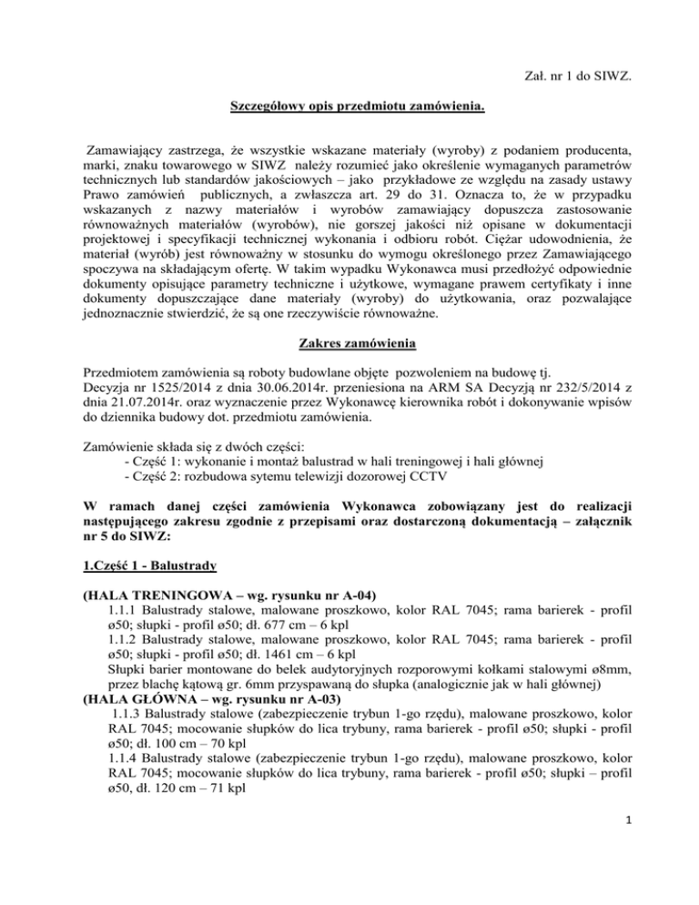 Zał. nr 1 do SIWZ. Szczegółowy opis przedmiotu zamówienia. Zamawiający zastrzega, że wszystkie wskazane materiały (wyroby) z podaniem producenta, marki, znaku towarowego w SIWZ należy rozumieć jako określenie wymaganych parametrów technicznych lub standardów jakościowych – jako przykładowe ze względu na zasady ustawy Prawo zamówień publicznych, a zwłaszcza art. 29 do 31. Oznacza to, że w przypadku wskazanych z nazwy materiałów i wyrobów zamawiający dopuszcza zastosowanie równoważnych materiałów (wyrobów), nie gorszej jakości niż opisane w dokumentacji projektowej i specyfikacji technicznej wykonania i odbioru robót. Ciężar udowodnienia, że materiał (wyrób) jest równoważny w stosunku do wymogu określonego przez Zamawiającego spoczywa na składającym ofertę. W takim wypadku Wykonawca musi przedłożyć odpowiednie dokumenty opisujące parametry techniczne i użytkowe, wymagane prawem certyfikaty i inne dokumenty dopuszczające dane materiały (wyroby) do użytkowania, oraz pozwalające jednoznacznie stwierdzić, że są one rzeczywiście równoważne. Zakres zamówienia Przedmiotem zamówienia są roboty budowlane objęte pozwoleniem na budowę tj. Decyzja nr 1525/2014 z dnia 30.06.2014r. przeniesiona na ARM SA Decyzją nr 232/5/2014 z dnia 21.07.2014r. oraz wyznaczenie przez Wykonawcę kierownika robót i dokonywanie wpisów do dziennika budowy dot. przedmiotu zamówienia. Zamówienie składa się z dwóch części: - Część 1: wykonanie i montaż balustrad w hali treningowej i hali głównej - Część 2: rozbudowa sytemu telewizji dozorowej CCTV W ramach danej części zamówienia Wykonawca zobowiązany jest do realizacji następującego zakresu zgodnie z przepisami oraz dostarczoną dokumentacją – załącznik nr 5 do SIWZ: 1.Część 1 - Balustrady (HALA TRENINGOWA – wg. rysunku nr A-04) 1.1.1 Balustrady stalowe, malowane proszkowo, kolor RAL 7045; rama barierek - profil ø50; słupki - profil ø50; dł. 677 cm – 6 kpl 1.1.2 Balustrady stalowe, malowane proszkowo, kolor RAL 7045; rama barierek - profil ø50; słupki - profil ø50; dł. 1461 cm – 6 kpl Słupki barier montowane do belek audytoryjnych rozporowymi kołkami stalowymi ø8mm, przez blachę kątową gr. 6mm przyspawaną do słupka (analogicznie jak w hali głównej) (HALA GŁÓWNA – wg. rysunku nr A-03) 1.1.3 Balustrady stalowe (zabezpieczenie trybun 1-go rzędu), malowane proszkowo, kolor RAL 7045; mocowanie słupków do lica trybuny, rama barierek - profil ø50; słupki - profil ø50; dł. 100 cm – 70 kpl 1.1.4 Balustrady stalowe (zabezpieczenie trybun 1-go rzędu), malowane proszkowo, kolor RAL 7045; mocowanie słupków do lica trybuny, rama barierek - profil ø50; słupki – profil ø50, dł. 120 cm – 71 kpl 1 2. Część 2 - System telewizji dozorowej CCTV. W zakresie rozbudowy instalacji słaboprądowych należy uwzględnić, że w obiekcie wykonane zostały następujące instalacje połączeń światłowodowych: - pomiędzy PPDe i PPD7, - pomiędzy PPD1 i PPDe, - pomiędzy punktami dystrybucyjnymi PPD 9/…/12 i przyłączeniami do paneli sterujących w maszynowni wind (zapas światłowodu) Do wykonania pozostaje zakres rzeczowy opisany poniżej. Instalacja elementów systemu telewizji dozorowej objęta niniejszym zamówieniem musi być kompatybilna z istniejącym system AVIGLION. 2.1 Montaż kamer 2.1.1 Montaż złącza RJ45 na skrętce 4-parowej, nieekranowanej UTP – 18 szt. 2.1.2 Montaż elementów systemu telewizji użytkowej, sieciowe kamery telewizji użytkowej CCTV: a) kamery zewnętrzne, kompaktowe, stałe, zmiennoogniskowe z obudową i wysięgnikiem, IP 66 z widokiem na przenośne kołowroty, montowane zgodnie z rysunkiem nr NN/05 – (kamera dodana nr: „kam5z”, „kam2z”) - 2 szt. Kamera zewnętrzna PoE, matryca 5Mpx, zoom optyczny nie mniej niż 18x, kąt obserwacji do 100 stopni, zakres temp. pracy (od -40st.C do +50st.C), obudowa IP 66, wysięgnik (np. Avigilon 5.0-H3-B2 w obudowie GL-618 lub równoważne); b) kamery wewnętrzne, kompaktowe lub kopułkowe w pomieszczeniach (rysunek nr NN/05), stałe, zmiennoogniskowe: - pomieszczenie „Komunikacja II”: „kam4a” – w narożniku przy osi T2, „kam3a” - w narożniku przy osi V4 – 2 szt. - pomieszczenie „Komunikacja I”: „kam2a” – w narożniku przy osi T2 – 1 szt. Kamera zewnętrzna PoE, matryca 5Mpx, zoom optyczny nie mniej niż 18x, kąt obserwacji do 100 stopni, - np. Avigilon 5.0-H3-B2 lub równoważne; Kamery poz. a), b) włączone do PPDe (rysunek NN/03, rysunek NN/04). Połączenie kamer – zł ącze RJ45 na skrętce 4-parowej, nieekranowanej UTP c) kamera wewnętrzna, kopułkowa w pomieszczeniu A3222 z widokiem na drzwi wejściowe z „womitorium” – 1 szt. Kamera kopułkowa, zmiennoogniskowa, 2Mpx, PoE, kąt obserwacji do 100 stopni, wandaloodporna, (np. AVIGLION 2.0-H3-D1 lub równoważna) Kamera poz. c) włączona do szafy CCTV w pomieszczeniu nr A3240. Połączenie kamer - złącze RJ45 na skrętce 4-parowej, nieekranowanej UTP 2.1.3 Konfiguracja ustawień sieciowych. Konfiguracja i uruchomienie kamer. 2.1.4 Wykonanie zabezpieczenia i uszczelnienia przeciwogniowego przejść kablami przez ściany (dotyczy także szybów windowych) kitami przeciwpożarowymi, stosownie do wymagań stref przeciwpożarowych. 2.2 Doposażenie PPDe 2.2.1 Wyposażenie szafy – kpl., urządzenie aktywne Switch (np. Cisco WS-C2960S PoE+2xSFP 10G lub równoważne) – 1 kpl 2.2.2 Urządzenie aktywne „mediakonwerter” (np. 3C- Link, model: 3C-DU-100-13-2 lub równoważny) – 5 kpl. 2 2.3 Doposażenie PPD7 2.3.1 Wyposażenie szafy – kpl., urządzenie aktywne „mediakonwerter” (np. 3C- Link, model: 3C-DU-100-13-2 lub równoważny) – 5 kpl 2.3.2 Montaż wyposażenia szafy, urządzenie aktywne (np. CISCO 2960S lub równoważne) – 1 kpl 2.3.3 Montaż paneli rozdzielczych RJ45 w przygotowanych stelażach 19", panel rozdzielczy RJ45 – 1 szt. 2.3.4.1 Montaż urządzeń akty