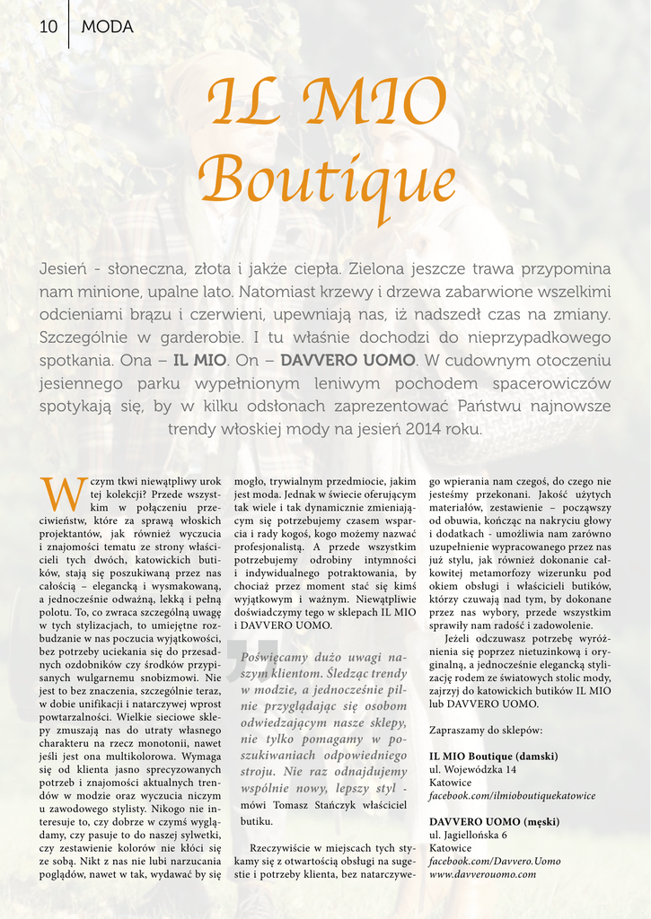 10 MODA IL MIO Boutique Jesień - słoneczna, złota i jakże ciepła. Zielona jeszcze trawa przypomina nam minione, upalne lato. Natomiast krzewy i drzewa zabarwione wszelkimi odcieniami brązu i czerwieni, upewniają nas, iż nadszedł czas na zmiany. Szczególnie w garderobie. I tu właśnie dochodzi do nieprzypadkowego spotkania. Ona – IL MIO. On – DAVVERO UOMO. W cudownym otoczeniu jesiennego parku wypełnionym leniwym pochodem spacerowiczów spotykają się, by w kilku odsłonach zaprezentować Państwu najnowsze trendy włoskiej mody na jesień 2014 roku. W czym tkwi niewątpliwy urok tej kolekcji? Przede wszystkim w połączeniu przeciwieństw, które za sprawą włoskich projektantów, jak również wyczucia i znajomości tematu ze strony właścicieli tych dwóch, katowickich butików, stają się poszukiwaną przez nas całością – elegancką i wysmakowaną, a jednocześnie odważną, lekką i pełną polotu. To, co zwraca szczególną uwagę w tych stylizacjach, to umiejętne rozbudzanie w nas poczucia wyjątkowości, bez potrzeby uciekania się do przesadnych ozdobników czy środków przypisanych wulgarnemu snobizmowi. Nie jest to bez znaczenia, szczególnie teraz, w dobie unifikacji i natarczywej wprost powtarzalności. Wielkie sieciowe sklepy zmuszają nas do utraty własnego charakteru na rzecz monotonii, nawet jeśli jest ona multikolorowa. Wymaga się od klienta jasno sprecyzowanych potrzeb i znajomości aktualnych trendów w modzie oraz wyczucia niczym u zawodowego stylisty. Nikogo nie interesuje to, czy dobrze w czymś wyglądamy, czy pasuje to do naszej sylwetki, czy zestawienie kolorów nie kłóci się ze sobą. Nikt z nas nie lubi narzucania poglądów, nawet w tak, wydawać by się mogło, trywialnym przedmiocie, jakim jest moda. Jednak w świecie oferującym tak wiele i tak dynamicznie zmieniającym się potrzebujemy czasem wsparcia i rady kogoś, kogo możemy nazwać profesjonalistą. A przede wszystkim potrzebujemy odrobiny intymności i indywidualnego potraktowania, by chociaż przez moment stać się kimś wyjątkowym i ważnym. Niewątpliwie doświadczymy tego w sklepach IL MIO i DAVVERO UOMO. Poświęcamy dużo uwagi naszym klientom. Śledząc trendy w modzie, a jednocześnie pilnie przyglądając się osobom odwiedzającym nasze sklepy, nie tylko pomagamy w poszukiwaniach odpowiedniego stroju. Nie raz odnajdujemy wspólnie nowy, lepszy styl mówi Tomasz Stańczyk właściciel butiku. Rzeczywiście w miejscach tych stykamy się z otwartością obsługi na sugestie i potrzeby klienta, bez natarczywe- go wpierania nam czegoś, do czego nie jesteśmy przekonani. Jakość użytych materiałów, zestawienie – począwszy od obuwia, kończąc na nakryciu głowy i dodatkach - umożliwia nam zarówno uzupełnienie wypracowanego przez nas już stylu, jak również dokonanie całkowitej metamorfozy wizerunku pod okiem obsługi i właścicieli butików, którzy czuwają nad tym, by dokonane przez nas wybory, przede wszystkim sprawiły nam radość i zadowolenie. Jeżeli odczuwasz potrzebę wyróżnienia się poprzez nietuzinkową i oryginalną, a jednocześnie elegancką stylizację rodem ze światowych stolic mody, zajrzyj do katowickich butików IL MIO lub DAVVERO UOMO. Zapraszamy do sklepów: IL MIO Boutique (damski) ul. Wojewódzka 14 Katowice facebook.com/ilmioboutiquekatowice DAVVERO UOMO (męski) ul. Jagiellońska 6 Katowice facebook.com/Davvero.Uomo www.davverouomo.com