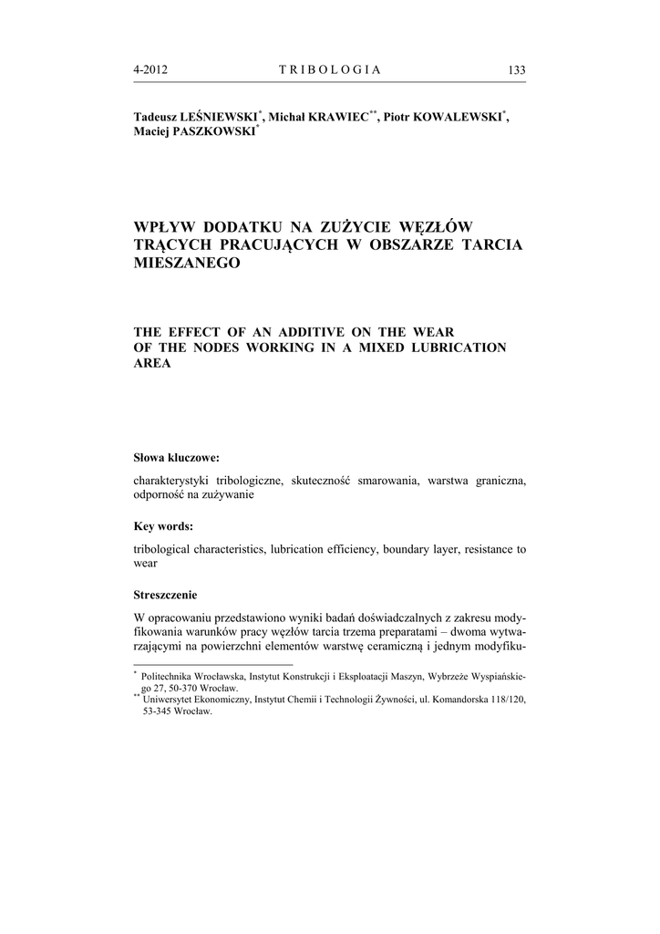 4-2012 TRIBOLOGIA 133 Tadeusz LEŚNIEWSKI *, Michał KRAWIEC**, Piotr KOWALEWSKI*, Maciej PASZKOWSKI* WPŁYW DODATKU NA ZUŻYCIE WĘZŁÓW TRĄCYCH PRACUJĄCYCH W OBSZARZE TARCIA MIESZANEGO THE EFFECT OF AN ADDITIVE ON THE WEAR OF THE NODES WORKING IN A MIXED LUBRICATION AREA Słowa kluczowe: charakterystyki tribologiczne, skuteczność smarowania, warstwa graniczna, odporność na zużywanie Key words: tribological characteristics, lubrication efficiency, boundary layer, resistance to wear Streszczenie W opracowaniu przedstawiono wyniki badań doświadczalnych z zakresu modyfikowania warunków pracy węzłów tarcia trzema preparatami – dwoma wytwarzającymi na powierzchni elementów warstwę ceramiczną i jednym modyfiku* Politechnika Wrocławska, Instytut Konstrukcji i Eksploatacji Maszyn, Wybrzeże Wyspiańskiego 27, 50-370 Wrocław. ** Uniwersytet Ekonomiczny, Instytut Chemii i Technologii Żywności, ul. Komandorska 118/120, 53-345 Wrocław. 134 TRIBOLOGIA 4-2012 jącym warstwę wierzchnią na drodze reakcji chemicznej. W ramach pracy przeprowadzono doświadczalne badania na standardowym aparacie czterokulowym próbek smarowanych olejem Castrol Magnatec Diesel 10W-40 bez dodatku (jako olej odniesienia) i z wymienionymi dodatkami w ilości 10% lub 0,1%. Do oceny skuteczności smarowania przyjęto trzy kryteria (obciążenie graniczne Fg, charakterystyka zużycia w funkcji obciążenia nadanego d = f(F), wskaźnik granicznego obciążenia zużycia Goz). Wielkości kryterialne zaczerpnięto z normy PN-76/C-04147 „Badania własności smarnych olejów i smarów”. Wyniki opracowano statystycznie przy poziomie ufności 95%, stosując test t-Studenta. Oceniając skuteczność działania badanych środków w oleju Castrol Magnatec Diesel 10W-40, stwierdzono ich pozytywne działanie, chociaż poprawa określanych wskaźników istotnie zależy od badanych materiałów, a uzyskany efekt nie zawsze wart jest poniesionych nakładów. WPROWADZENIE W maszynach występują węzły ślizgowe, których zadaniem jest umożliwienie przemieszczania się elementów względem siebie. Procesy tarcia zachodzące w tych węzłach negatywnie wpływają na ich charakterystyki tribologiczne, ponieważ tarcie powoduje przyspieszone zużywanie oraz zwiększenie oporów ruchu elementów. W celu zapobiegania tym negatywnym skutkom tarcia stosuje się odpowiednie środki smarne. Smar zmniejsza opory ruchu przemieszczających się elementów oraz obniża ich zużycie, a poprzez to istotnie wpływa na trwałość maszyny. Środek smarny jest zatem istotnym materiałem konstrukcyjnym, którego wybór do węzła ślizgowego musi być poparty odpowiednimi argumentami wynikającymi z badań doświadczalnych lub wcześniejszych zastosowań praktycznych. Szczególnie istotne jest to w przypadku węzłów pracujących w zakresie tarcia mieszanego. Środki smarne (oleje, smary plastyczne) stosowane w motoryzacji również mają polepszać właściwości ślizgowe węzła trącego. W ostatnim czasie powszechne stało się polepszanie charakterystyk tribologicznych smarów poprzez dodawanie środków obniżających współczynnik tarcia. Dodatek ma wytworzyć na współpracujących elementach warstwę ceramiczną odbudowującą warstwę wierzchnią. Dodatek może działać także w ten sposób, że wytwarza warstwę graniczną odporną na zatarcie. Środki te, poza obniżeniem współczynnika tarcia, polepszają również szereg innych parametrow (np. obniżają zużycie paliwa i hałas oraz podnoszą moc silnika), a przed zastosowaniem nie wymagają modyfikacji istniejących układów smarowania. Polepszenie charakterystyk tribologicznych materiałów stalowych polegające na nanoszeniu warstw z ceramiki lub tworzyw sztucznych oraz zwiększanie skuteczności działania smarów, poprzez dodanie m.in. PTFE, nie jest zagadnieniem nowym [L. 1–4]. Mechanizm działania takich środków jest dobrze znany. Użytkownik nie polega jednak na zapewnieniach producenta i chce dokładnie 4-2012 TRIBOLOGIA 135 znać wpływ dodatku na właściwości tribologiczne węzła i jego oddziaływanie z innymi elementami systemu tribologicznego przed zastosowaniem takiego środka w pracujących układach. Dlatego niezbędne jest przeprowadzenie badań doświadczalnych. Autorzy niniejszej pracy już wcześniej prowadzili takie badania [L. 5], podobnie jak badacze z innych ośrodków krajowych [L. 6–8]. Prace te dotyczą jednak zazwyczaj tylko jednego środka i pokazują jego wpływ na parametry pracy konkretnego węzła trącego. Prace nie zawierają porównań efektywności smarowania jednego węzła przez różne dodatki smarne pracującego w analogicznych warunkach. Aby pokazać różnice pomiędzy kilkoma dodatkami, niniejsza praca przedstawia wyniki badań trzech preparatów i ocenę ich charakterystyk tribologicznych. Dodatkowo w pracy podjęto się próby analizy wpływu postaci dostarczanego preparatu na jego charakterystyki tribologiczne. MATERIAŁY I METODA PROWADZENIA BADAŃ Do badań użyte były materiały: 1. Olej Castrol Magnatec Diesel 10W-40 (handlowy). 2. Olej Castrol Magnatec Diesel 10W-40 z dodatkiem 10% środka działającego na zasadzie reakcji chemicznej z powierzchniami współpracujących elementów dostarczanego w postaci gotowej do zastosowania – preparat nr 1. 3. Olej Castrol Magnatec Diesel 10W-40 z dodatkiem 10% środka wytwarzającego na powierzchniach elementów węzła warstwę ceramiczną dostarczanego w postaci gotowej do zastosowania – preparat nr 2. 4. Olej Castrol Magnatec Diesel 10W-40 z dodatkiem 0,1% środka wytwarzającego na powierzchniach elementów węzła warstwę ceramiczną dostarczanego w postaci koncentratu – preparat nr 3. 5. Kulki łożyskowe – średnica 12,7 mm, wykonane ze stali łożyskowej ŁH15 w 16 klasie dokładności i grupie wymiarowej S = 0 μm. Pozostałe cechy kulek były zgodne z PN-83/M-86452. W pracy nie podano nazw handlowych badanych środków smarnych, lecz zostały 