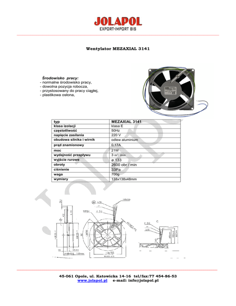 ______________________________________________________________________________________________________ Wentylator MEZAXIAL 3141 Środowisko pracy: - normalne środowisko pracy, - dowolna pozycja robocza, - przystosowany do pracy ciągłej, - plastikowa osłona, typ MEZAXIAL 3141 klasa izolacji częstotliwość napięcie zasilania obudowa silnika i wirnik klasa E 50Hz 220 V odlew aluminium prąd znamionowy 0,17A moc wydajność przepływu wyjście rurowe obroty ciśnienie waga wymiary 21W 3 m³/ min ø 133 2600 obr / min 33Pa 700g 138x138x48mm _____________________________________________________________________________________________________ 45-061 Opole, ul. Katowicka 14-16 tel/fax:77 454-86-53 www.jolapol.pl e-mail: [email protected]