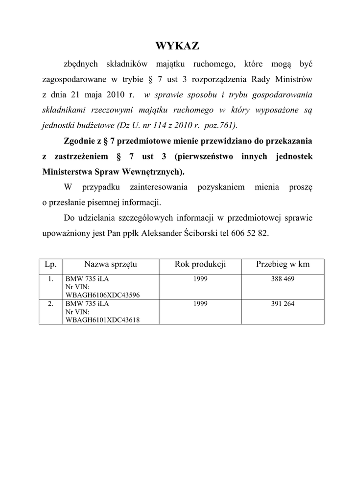 WYKAZ zbędnych składników majątku ruchomego, które mogą być zagospodarowane w trybie § 7 ust 3 rozporządzenia Rady Ministrów z dnia 21 maja 2010 r. w sprawie sposobu i trybu gospodarowania składnikami rzeczowymi majątku ruchomego w który wyposażone są jednostki budżetowe (Dz U. nr 114 z 2010 r. poz.761). Zgodnie z § 7 przedmiotowe mienie przewidziano do przekazania z zastrzeżeniem § 7 ust 3 (pierwszeństwo innych jednostek Ministerstwa Spraw Wewnętrznych). W przypadku zainteresowania pozyskaniem mienia proszę o przesłanie pisemnej informacji. Do udzielania szczegółowych informacji w przedmiotowej sprawie upoważniony jest Pan ppłk Aleksander Ściborski tel 606 52 82. Lp. 1. 2. Nazwa sprzętu BMW 735 iLA Nr VIN: WBAGH6106XDC43596 BMW 735 iLA Nr VIN: WBAGH6101XDC43618 Rok produkcji Przebieg w km 1999 388 469 1999 391 264