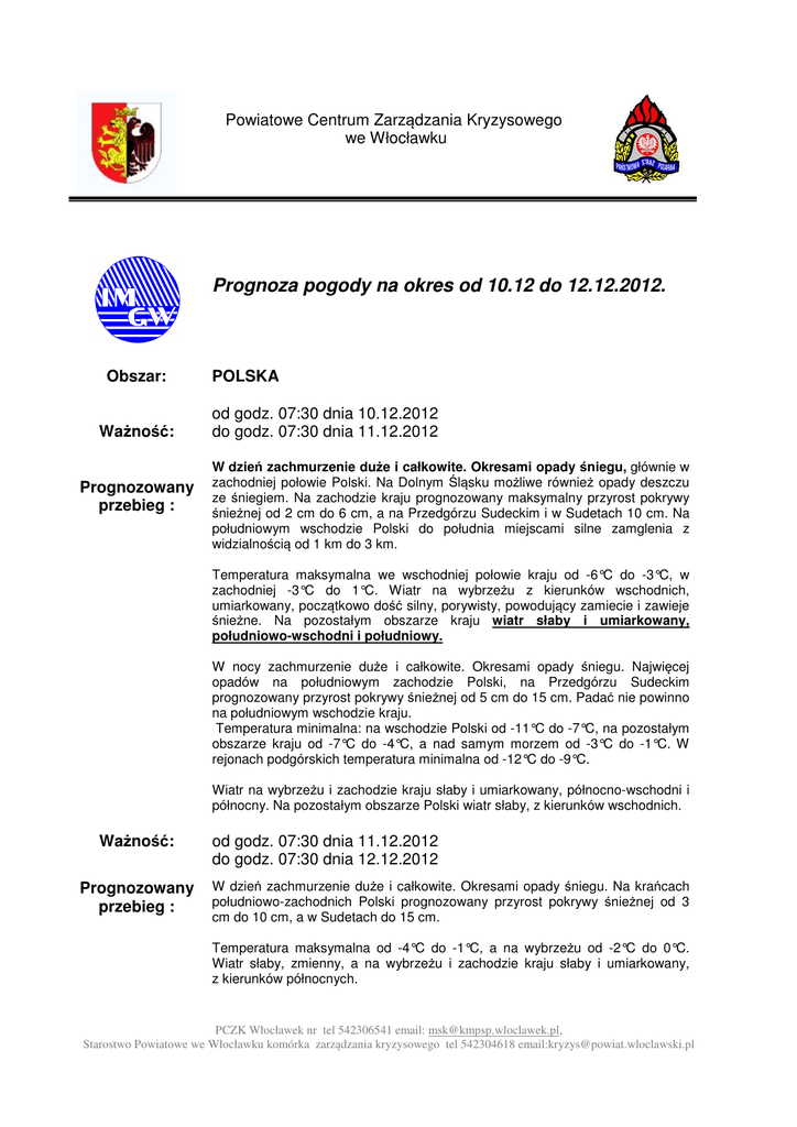 Powiatowe Centrum Zarządzania Kryzysowego we Włocławku Prognoza pogody na okres od 10.12 do 12.12.2012. Obszar: Ważność: Prognozowany przebieg : POLSKA od godz. 07:30 dnia 10.12.2012 do godz. 07:30 dnia 11.12.2012 W dzień zachmurzenie duże i całkowite. Okresami opady śniegu, głównie w zachodniej połowie Polski. Na Dolnym Śląsku możliwe również opady deszczu ze śniegiem. Na zachodzie kraju prognozowany maksymalny przyrost pokrywy śnieżnej od 2 cm do 6 cm, a na Przedgórzu Sudeckim i w Sudetach 10 cm. Na południowym wschodzie Polski do południa miejscami silne zamglenia z widzialnością od 1 km do 3 km. Temperatura maksymalna we wschodniej połowie kraju od -6°C do -3°C, w zachodniej -3°C do 1°C. Wiatr na wybrzeżu z kierunków wschodnich, umiarkowany, początkowo dość silny, porywisty, powodujący zamiecie i zawieje śnieżne. Na pozostałym obszarze kraju wiatr słaby i umiarkowany, południowo-wschodni i południowy. W nocy zachmurzenie duże i całkowite. Okresami opady śniegu. Najwięcej opadów na południowym zachodzie Polski, na Przedgórzu Sudeckim prognozowany przyrost pokrywy śnieżnej od 5 cm do 15 cm. Padać nie powinno na południowym wschodzie kraju. Temperatura minimalna: na wschodzie Polski od -11°C do -7°C, na pozostałym obszarze kraju od -7°C do -4°C, a nad samym morzem od -3°C do -1°C. W rejonach podgórskich temperatura minimalna od -12°C do -9°C. Wiatr na wybrzeżu i zachodzie kraju słaby i umiarkowany, północno-wschodni i północny. Na pozostałym obszarze Polski wiatr słaby, z kierunków wschodnich. Ważność: Prognozowany przebieg : od godz. 07:30 dnia 11.12.2012 do godz. 07:30 dnia 12.12.2012 W dzień zachmurzenie duże i całkowite. Okresami opady śniegu. Na krańcach południowo-zachodnich Polski prognozowany przyrost pokrywy śnieżnej od 3 cm do 10 cm, a w Sudetach do 15 cm. Temperatura maksymalna od -4°C do -1°C, a na wybrzeżu od -2°C do 0°C. Wiatr słaby, zmienny, a na wybrzeżu i zachodzie kraju słaby i umiarkowany, z kierunków północnych. PCZK Włocławek nr tel 542306541 email: [email protected], Starostwo Powiatowe we Włocławku komórka zarządzania kryzysowego tel 542304618 email:[email protected] W nocy zachmurzenie duże i całkowite. Okresami opady śniegu. Temperatura minimalna od -8°C do -4°C, nad samym morzem od -3°C do -2°C, a w kotlinach i dolinach karpackich od -12°C do -9°C. Wiatr na wybrzeżu słaby i umiarkowany, z kierunków zachodnich. Na pozostałym obszarze kraju słaby, zmienny, z przewagą północno-zachodniego. Uwagi Chorwacja – Zagrzeb – sobota (8.12) W ciągu zaledwie 24 godzin spadło metr śniegu. Opadom towarzyszyły silne porywy wiatru, które usypały ponad 2metrowe zaspy. 120 tys. chorwackich odbiorców nie ma prądu elektrycznego. W niedzielę intensywne opady śniegu znalazły się już nad Rumunią. Najgorsza sytuacja ma miejsce w północnej i zachodniej części kraju, gdzie spadło od 25 do nawet 40 cm śniegu. 180 tys. mieszkańców nie ma prądu elektrycznego. Rekordowa fala mrozów, która nawiedziła w weekend Czechy, zabiła co najmniej czworo bezdomnych. Temperatury spadają tam nawet poniżej -20 stopni. W zachodniej części kraju wystąpiły intensywne opady śniegu. W wyniku karambolu, do jakiego doszło w pobliżu Pragi, rannych zostało 12 osób, jedna z nich zmarła w trakcie przewożenia do szpitala. Śnieżyce sparaliżowały także Bułgarię i Węgry. Na zachodzie Ukrainy spadło przez 6 godzin 15 cm śniegu, lokalnie leży już 50 cm śniegu, a padać będzie w dalszym ciągu. Pod koniec tygodnia pogoda się poprawi, ale pojawią się za to 30-stopniowe mrozy – ostrzegają ukraińscy meteorolodzy. Polska doba 9.12.2012 (dane RCB) Zalecenia Zgony z powodu wychłodzenia organizmu - 7 Zgony z powodu zatrucia tlenkiem węgla – 4 ( w tym na terenie województwa kujawsko – pomorskiego -1) Potrzeba śledzenia komunikatów i rozwoju sytuacji pogodowej. Stopień wychłodzenia organizmu wg RCB - 4 ( bardzo duży) PCZK Włocławek nr tel 542306541 email: [email protected], Starostwo Powiatowe we Włocławku komórka zarządzania kryzysowego tel 542304618 email:[email protected]