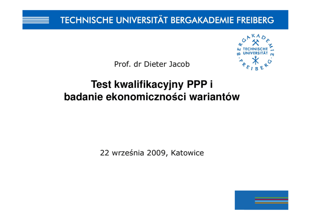 Prof. dr Dieter Jacob Test kwalifikacyjny PPP i badanie ekonomiczności wariantów 22 września 2009, Katowice 1 Co znaczy PPP? Partnerstwo publiczno-prywatne to świadczenie usług pożytku publicznego z udziałem partnera, które obejmuje, w miarę możliwości, cały cykl życia projektu (projektowanie, budowa, eksploatacja, utrzymanie trwałości i ewentualnie przekazanie składników majątkowych po zakończeniu realizacji inwestycji). Podmiot publiczny pozostaje, inaczej niż w przypadku prywatyzacji, właścicielem lub użytkownikiem nieruchomości. Celem są nie niskie odsetki lecz jednoczesna optymalizacja działań etapu projektowania, budowy i eksploatacji zleconych partnerowi prywatnemu. Koszt odsetek to tylko jeden (pośredni) składnik całkowitych kosztów cyklu życia projektu. 2 Piramida efektywnośći PPP 1. Optymalna alokacja ryzyka 2. Cykl życia projektu Konkurencja Skupienie na przedmiocie inwestycji 3. Dozór projektu, dodatkowe korzyści, jakość doradctwa, przejrzystość... Źródło:Jacob, Kochendörfer: Wzrost wydajności w przypadku realizacji projektów infrastrukturalnych z udziałem partnera prywatnego,Bundesanzeiger Verlag, Kolonia, 2002, S.19 3 Transfer ryzyka i efektywność Efektywność Realizacja projektu PPP Realizacja własna Realizacja własna Realizacja projektu PPP Transfer ryzyka 4 Najważniejsze czynniki efektywności • Koszty projektowania i budowy (włącznie z poprawkami) • Czas projektowania i budowy • Koszty eksploatacji • Alokacja ryzyka 5 Przekroczenie kosztów budowy w przypadku realizacji własnej Źródło Przekrocznie kosztów Badania prof. Bleckena 22,0% RH Berlin 45,0% RH Baden-Württemberg 5 -10 % BMVBW 14,7% NL, projekt pilotażowy 9,0% GB, Audit Commission 11,0% GB, Mott MacDonald GB, Arthur Andersen Study Średnio 24,0% Standardowe budownictwo naziemne Kompleksowe budownictwo naziemne Standardowe budownictwo naziemne Standardowe i kompleksowe budownictwo naziemne Standardowe budownictwo naziemne, szkoła Standardowe budownictwo naziemne, szkoły St. budown. naziemne 10,0% Średnia ocena ryzyka Kategorie 17,9% Źródło:Jacob, Winter, Stuhr: PPP w budownictwie szkolnym– parametry dla komparatora PSC, 2003, S. 77, Ecorys: Projekt pilotażowy Rijnlands Lyceum Wassenaar, Audit Commission: PFI in Schools, London, 2003, S. 19ff, Mott MacDonald: Review of Large Public Procurement in the UK, London, 2002, S.14, Arthur Andersen: Value for money Drivers in the Private Finance Initiative, LSE, Treasury Taskforce Information, London, 2000, Abschnitt 5.14 6 Czas budowy Rodzaj realizacji Ø opóźnienie w budowie Tradycyjny Kompleksowe budownictwo naziemne Standardowe budownictwo naziemne Kompleksowe budownictwo podziemne Standardowe budownictwo podziemne Uzbrojenie/wyposażenie w media Outsourcing Średnio 39% 4% 15% 34% 54% brak danych 17% PFI/PPP -16% brak danych 28% brak danych -1% Standardowe budownictwo naziemne Standardowe budownictwo podziemne Uzbrojenie/wyposażenie w media Outsourcing Średnio Źródło: Mott MacDonald: Review of Large Public Procurement in the UK, London, 2002, S.14 7 Przykłady efektywności w budownictwie szkolnym Zleceniodawca Kategoria projektu Wartość Wartość Data inwestycjyjnaprojektu Rodzaj zawarcia (mln €) (mln €) umowy umowy Hamburg przedszkola, szkoły 17,4 brak danych Schwarzenbek szkoły 21 54,2 Neuss szkoły 18,5 25 Achim szkoły 8,4 brak danych Lahn-Dill-Kreis szkoły 27 65 Magdeburg szkoły 41 brak danych brak danych Podmiot publiczny właścicielem nieruchomości Podmiot publiczny właścicielem nieruchomości Podmiot publiczny właścicielem nieruchomości Podmiot publiczny właścicielem nieruchomości brak danych Efektywność brak danych 25,7% brak danych 10,6% brak danych 11,0% brak danych 18,4% brak danych 10,0% brak danych 8,0% 8 Przykłady efektywności w budownictwie szkolnym Frankfurt am Main Budynek administracyjny 56 94 Monheim am Rhein szkoły 24 75 Rietberg Witten Kreis Offenbach (Los Ost) Bedburg szkoły szkoły szkoły szkoły 10 11 131 11 Podmiot publiczny użytkownikiem nieruchomości Podmiot publiczny właścicielem nieruchomości lipiec 03 21,0% styczeń04 15,2% 45 Podmiot publiczny właścicielem nieruchomości czerwiec 04 5,0% 32 Podmiot publiczny właścicielem nieruchomości wrzesień 04 9,3% 410 Podmiot publiczny udziałowcem w spółce 56 Podmiot publiczny właścicielem nieruchomości październik04 18,1% marzec 05 9 10,0% Przykłady efektywności w budownictwie szkolnym Zleceniodawca Köln Wartość Wartość Kategoria inwestycjyjna projektu Rodzaj (Mln. €) (Mln. €) umowy projektu szkoły 34 125 Leverkusen szkoły 26 70 Barleben szkoły 8 12 Kreis Offenbach (Los West) szkoły 92 370 Twistringen szkoły 6 10 Podmiot publiczny właścicielem nieruchomości Podmiot publiczny właścicielem nieruchomości Podmiot publiczny właścicielem nieruchomości Podmiot publiczny udziałowcem w spółce Podmiot publiczny właścicielem nieruchomości Data zawrcia umowy Efektywność 10% wstępnej kwicień05 analizy ekonomi cznej styczeń05 15% luty06 22% czerwiec 06 18,5% lipiec06 26% 10 Przykłady efektywności w budownictwie szkolnym Buchholz i.d.N. szkoły 3,6 4,3 Langenhagen przedszkola, inne 8,1 1,6 Halle przedszkola 8 24 Halle szkoły 50 171 Winsen szkoły 2,89 4,24 Kirchseeon szkoły 25 39 Düren szkoły 22 50 Podmiot publiczny właścicielem nieruchomości Podmiot publiczny właścicielem nieruchomości Podmiot publiczny właścicielem nieruchomości Podmiot publiczny właścicielem nieruchomości Podmiot publiczny właścicielem nieruchomości Podmiot publiczny właścicielem nieruchomości Podmiot publiczny właścicielem nieruchomości listopad06 8% grudzień 06 1,1% Grudzień 06 12% Grudzień 06 19% marzec 07 9% maj 07 10% maj07 7% 11 Zleceniodawca Wartość Wartość Rodzaj Data zawrcia EfektyKategoria projektu inwestycjyjna projektu projektu umowy wność (Mln. €) (Mln. €) Lübz szkoły 8 14,95 Frankfurt am Main szkoły 106 248 Rodenkirchen sz