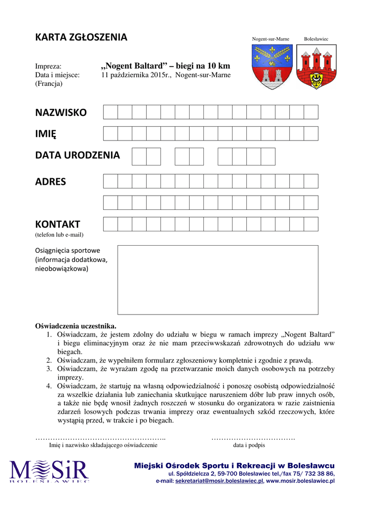KARTA ZGŁOSZENIA Impreza: Data i miejsce: (Francja) Nogent-sur-Marne Bolesławiec „Nogent Baltard” – biegi na 10 km 11 października 2015r., Nogent-sur-Marne NAZWISKO IMIĘ DATA URODZENIA ADRES KONTAKT (telefon lub e-mail) Osiągnięcia sportowe (informacja dodatkowa, nieobowiązkowa) Oświadczenia uczestnika. 1. Oświadczam, że jestem zdolny do udziału w biegu w ramach imprezy „Nogent Baltard” i biegu eliminacyjnym oraz że nie mam przeciwwskazań zdrowotnych do udziału ww biegach. 2. Oświadczam, że wypełniłem formularz zgłoszeniowy kompletnie i zgodnie z prawdą. 3. Oświadczam, że wyrażam zgodę na przetwarzanie moich danych osobowych na potrzeby imprezy. 4. Oświadczam, że startuję na własną odpowiedzialność i ponoszę osobistą odpowiedzialność za wszelkie działania lub zaniechania skutkujące naruszeniem dóbr lub praw innych osób, a także nie będę wnosił żadnych roszczeń w stosunku do organizatora w razie zaistnienia zdarzeń losowych podczas trwania imprezy oraz ewentualnych szkód rzeczowych, które wystąpią przed, w trakcie i po biegach. …………………………………………….. Imię i nazwisko składającego oświadczenie ……………………………. data i podpis Miejski Ośrodek Sportu i Rekreacji w Bolesławcu ul. Spółdzielcza 2, 59-700 Bolesławiec tel./fax 75/ 732 38 86, e-mail: [email protected], www.mosir.boleslawiec.pl