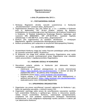 Regulamin Konkursu "Paczkomatoween” z dnia 29 października 2012 r. § 1. POSTANOWIENIA OGÓLNE 1. Niniejszy Regulamin określa warunki uczestnictwa w Konkursie „Paczkomatoween” (zwanym dalej „Konkursem”). 2. Organizatorem Konkursu jest jest InPost Sp. z o.o. z siedzibą w Krakowie przy ul. Malborskiej 130, 30-624 Kraków, wpisany do Rejestru przedsiębiorców prowadzonego przez Sąd Rejonowy dla Krakowa-Śródmieścia w Krakowie, XI Wydział Gospodarczy Krajowego Rejestru Sądowego, pod numerem KRS 0000255841, NIP 679-28-95-061, wysokość kapitału zakładowego 11.550.000 PLN, zwany dalej „Organizatorem”. 3. Konkurs jest organizowany na zasadach określonych w niniejszym Regulaminie, zgodnie z powszechnie obowiązującym prawem. 4. Konkurs prowadzony jest wyłącznie na terytorium Rzeczpospolitej Polskiej. § 2. UCZESTNICY KONKURSU 1. Uczestnikami Konkursu mogą być osoby fizyczne posiadające pełną zdolność do czynności prawnych (dalej: Uczestnicy). 2. W Konkursie nie mogą brać udziału pracownicy Organizatora oraz osoby zatrudnione na umowy cywilnoprawne przez Organizatora oraz członków rodzin pracowników i współpracowników Organizatora. § 3. WARUNKI UDZIAŁU W KONKURSIE 1. Warunkiem wzięcia udziału w Konkursie jest dokonanie kolejno następujących czynności: o rejestracja w aplikacji udostępnionej na stronie internetowej https://apps.facebook.com/paczkomatoween/ w okresie od dnia 29 października 2012 r. do północy dnia 4 listopada 2012. o polubienie strony https://www.facebook.com/paczkomaty, o wzięcie udziału w co najmniej jednej całej grze udostępnionej w aplikacji pod adresem: https://apps.facebook.com/paczkomatoween/ o zaakceptowanie treści niniejszego Regulaminu. § 4. UPRAWNIENIA ORGANIZATORA 1. Organizator ma prawo weryfikować (usuwać) zgłoszenia do Konkursu i gry, które nie spełniają warunków, o których mowa w §3. 2. Organizator zastrzega sobie prawo do weryfikowania (usuwania) wyników tych uczestników Konkursu z aplikacji/gry, którzy w nieuczciwy sposób, wobec innych uczestników Konkursu, wykorzystali oprogramowanie, urządzenia lub inne podobne automatycznie działające mechanizmy komputerowe, w celu osiągnięcia najlepszego wyniku zarówno w trakcie jak i po zakończeniu Konkursu. § 5. NAGRODY 1. Warunkiem otrzymania nagrody jest uzyskanie jak najkrótszego czasu w trakcie rozgrywki konkursowej na obojętnie wybranym poziomie. Poziomy różnią się od siebie zarówno stopniem skomplikowania, ale także i sposobem liczenia czasu. 2. Każdemu pojedynczemu uczestnikowi Konkursu przysługuje wyłącznie jedna nagroda dzienna, niezależnie od liczby gier, które w trakcie trwania całego Konkursu odbył. Ma natomiast prawo wciąż rywalizować w klasyfikacji generalnej (ogólnej) o nagrodę główną w Konkursie, podejmując kolejne gry aż do chwili zakończenia Konkursu. 3. Nagrodą główną w Konkursie jest: konsola XBOX 360, 250 GB. Nagrodą dzienną w Konkursie jest zestaw gadżetów od InPost. Każdego dnia zostanie rozdanych minimum 10 zestawów nagród. Dokładna zawartość nagród dziennych zostanie opublikowana na https://www.facebook.com/paczkomaty. 4. Warunkiem uzyskania przez Uczestników prawa do nagród wymienionych w pkt. 2 jest założenie konta w systemie Paczkomaty (www.paczkomaty.pl ) i wybranie Paczkomatu w celu odbioru nagrody. 5. Nagrody zostaną wysłane wyłącznie przez Paczkomaty InPost. 6. Uczestnikom nie przysługuje prawo wymiany nagród na nagrodę innego rodzaju lub gotówkę. 7. Uczestnikom nie przysługuje prawo przeniesienia prawa do otrzymania nagrody na osoby trzecie. 8. Uczestnikom przysługuje prawo do złożenia oświadczenia o odmowie przyjęcia nagrody. § 6. PRZETWARZANIE DANYCH OSOBOWYCH 1. Administratorem danych osobowych udostępnianych przez Uczestników Konkursu jest Organizator. Podanie danych osobowych ma charakter dowolny, lecz niezbędny do przystąpienia przez Uczestnika do Konkursu. Osobom udostępniającym dane przysługuje prawo dostępu do tych danych, ich zmian bądź usunięcia. § 7. PRZEKAZANIE NAGRÓD 1. Informacje o zwycięzcach z każdego dnia oraz nagrody Głównej będą publikowane na www.blog.inpost.pl, co wiąże się z równoczesnym zawiadomieniem Uczestnika. 2. Po otrzymaniu powiadomienia o wygranej w Konkursie, laureaci nagród powinni przesłać w powiadomieniu prywatnym na https://www.facebook.com/paczkomaty swój adres mailowy na którym zostało założone konto w systemie Paczkomatów. 3. Nagrody zostaną wysłane do laureatów, którzy przekazali opisane w §7 pkt 1. dane, do 12.11.2012 roku. 4. W przypadku, gdy zdobywcą Nagrody będzie jakakolwiek osoba, która nie spełnia warunków wskazanych w niniejszym Regulaminie, osoba taka traci prawo do nagrody. Jeżeli ten fakt zostanie ujawniony po doręczeniu nagrody osoba ta będzie zobowiązana do jej zwrotu. Organizator uprawniony będzie do przyznania takiej nagrody Uczestnikowi, który zajmował kolejne miejsce w Konkursie. 5. W przypadku jeśli wartość nagród przekracza kwotę podlegającą opodatkowaniu (Nagroda Główna), podatek od wartości przyznanej nagrody zostanie opłacony przez Zwycięzcę. Punkt regulaminu reguluje rozporządzenie Ministra Finansów z dnia 24.03.1995 r. w sprawie wykonania niektórych przepisów ustawy o podatku dochodowym od osób fizycznych (Dz.U. Nr 35, poz. 173, z późniejszymi zmianami), a zatem stosownie do w/w przepisów i do przepisów ustawy z dnia 26.07.1991 o podatku dochodowym od osób fizycznych (Dz.U. Nr 14, poz. 176 z 2000 r.). § 8. POSTANOWIENIA KOŃCOWE 1. Konkurs trwa od dnia 29.10.2012 r. do dnia 05.11.2012 r. 2. W kwestiach nieuregulowanych niniejszym Regulaminem stosuje się przepisy Kodeksu cywilnego oraz ustawy z dnia 26 lipca 1991 r. o podatku dochodowym od osób fizycznych (Dz. U. z 2000 r., Nr 14, poz. 176 z późn. zm.). 3. Niniejszy Regulamin Konkursu dostępny jest dla Uczestników na stronie internetowej https://apps.faceboo