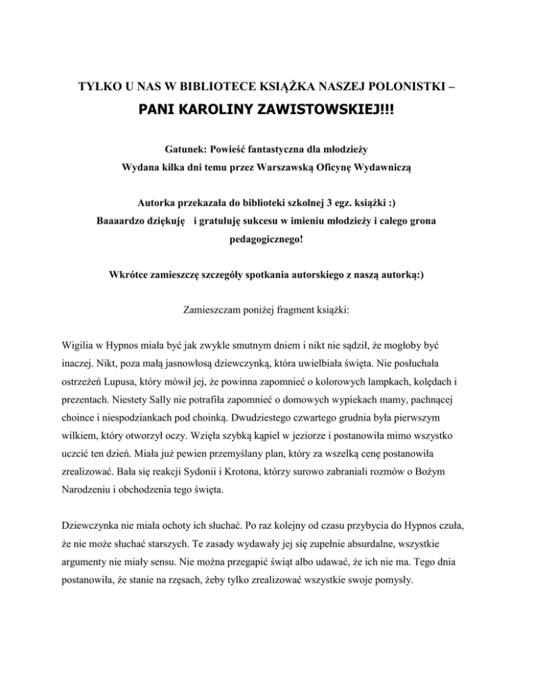 TYLKO U NAS W BIBLIOTECE KSIĄŻKA NASZEJ POLONISTKI – PANI KAROLINY ZAWISTOWSKIEJ!!! Gatunek: Powieść fantastyczna dla młodzieży Wydana kilka dni temu przez Warszawską Oficynę Wydawniczą Autorka przekazała do biblioteki szkolnej 3 egz. książki :) Baaaardzo dziękuję i gratuluję sukcesu w imieniu młodzieży i całego grona pedagogicznego! Wkrótce zamieszczę szczegóły spotkania autorskiego z naszą autorką:) Zamieszczam poniżej fragment książki: Wigilia w Hypnos miała być jak zwykle smutnym dniem i nikt nie sądził, że mogłoby być inaczej. Nikt, poza małą jasnowłosą dziewczynką, która uwielbiała święta. Nie posłuchała ostrzeżeń Lupusa, który mówił jej, że powinna zapomnieć o kolorowych lampkach, kolędach i prezentach. Niestety Sally nie potrafiła zapomnieć o domowych wypiekach mamy, pachnącej choince i niespodziankach pod choinką. Dwudziestego czwartego grudnia była pierwszym wilkiem, który otworzył oczy. Wzięła szybką kąpiel w jeziorze i postanowiła mimo wszystko uczcić ten dzień. Miała już pewien przemyślany plan, który za wszelką cenę postanowiła zrealizować. Bała się reakcji Sydonii i Krotona, którzy surowo zabraniali rozmów o Bożym Narodzeniu i obchodzenia tego święta. Dziewczynka nie miała ochoty ich słuchać. Po raz kolejny od czasu przybycia do Hypnos czuła, że nie może słuchać starszych. Te zasady wydawały jej się zupełnie absurdalne, wszystkie argumenty nie miały sensu. Nie można przegapić świąt albo udawać, że ich nie ma. Tego dnia postanowiła, że stanie na rzęsach, żeby tylko zrealizować wszystkie swoje pomysły.