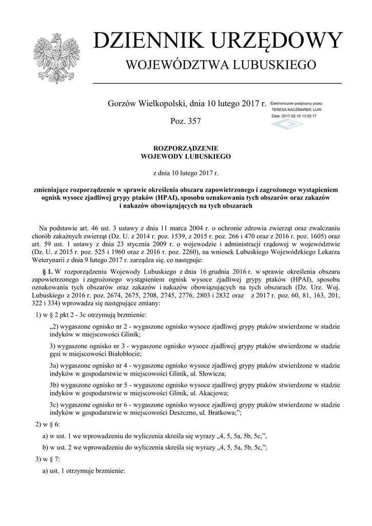 DZIENNIK URZĘDOWY WOJEWÓDZTWA LUBUSKIEGO Gorzów Wielkopolski, dnia 10 lutego 2017 r. Elektronicznie podpisany przez: TERESA KACZMAREK; LUW Poz. 357 Data: 2017-02-10 13:55:17 ROZPORZĄDZENIE WOJEWODY LUBUSKIEGO z dnia 10 lutego 2017 r. zmieniające rozporządzenie w sprawie określenia obszaru zapowietrzonego i zagrożonego wystąpieniem ognisk wysoce zjadliwej grypy ptaków (HPAI), sposobu oznakowania tych obszarów oraz zakazów i nakazów obowiązujących na tych obszarach Na podstawie art. 46 ust. 3 ustawy z dnia 11 marca 2004 r. o ochronie zdrowia zwierząt oraz zwalczaniu chorób zakaźnych zwierząt (Dz. U. z 2014 r. poz. 1539, z 2015 r. poz. 266 i 470 oraz z 2016 r. poz. 1605) oraz art. 59 ust. 1 ustawy z dnia 23 stycznia 2009 r. o wojewodzie i administracji rządowej w województwie (Dz. U. z 2015 r. poz. 525 i 1960 oraz z 2016 r. poz. 2260), na wniosek Lubuskiego Wojewódzkiego Lekarza Weterynarii z dnia 9 lutego 2017 r. zarządza się, co następuje: § 1. W rozporządzeniu Wojewody Lubuskiego z dnia 16 grudnia 2016 r. w sprawie określenia obszaru zapowietrzonego i zagrożonego wystąpieniem ognisk wysoce zjadliwej grypy ptaków (HPAI), sposobu oznakowania tych obszarów oraz zakazów i nakazów obowiązujących na tych obszarach (Dz. Urz. Woj. Lubuskiego z 2016 r. poz. 2674, 2675, 2708, 2745, 2776, 2803 i 2832 oraz z 2017 r. poz. 60, 81, 163, 201, 322 i 334) wprowadza się następujące zmiany: 1) w § 2 pkt 2 - 3c otrzymują brzmienie: „2) wygaszone ognisko nr 2 - wygaszone ognisko wysoce zjadliwej grypy ptaków stwierdzone w stadzie indyków w miejscowości Glinik; 3) wygaszone ognisko nr 3 - wygaszone ognisko wysoce zjadliwej grypy ptaków stwierdzone w stadzie gęsi w miejscowości Białobłocie; 3a) wygaszone ognisko nr 4 - wygaszone ognisko wysoce zjadliwej grypy ptaków stwierdzone w stadzie indyków w gospodarstwie w miejscowości Glinik, ul. Słowicza; 3b) wygaszone ognisko nr 5 - wygaszone ognisko wysoce zjadliwej grypy ptaków stwierdzone w stadzie indyków w gospodarstwie w miejscowości Glinik, ul. Akacjowa; 3c) wygaszone ognisko nr 6 - wygaszone ognisko wysoce zjadliwej grypy ptaków stwierdzone w stadzie indyków w gospodarstwie w miejscowości Deszczno, ul. Bratkowa;”; 2) w § 6: a) w ust. 1 we wprowadzeniu do wyliczenia skreśla się wyrazy „4, 5, 5a, 5b, 5c,”, b) w ust. 2 we wprowadzeniu do wyliczenia skreśla się wyrazy „4, 5, 5a, 5b, 5c,”; 3) w § 7: a) ust. 1 otrzymuje brzmienie: Dziennik Urzędowy Województwa Lubuskiego –2– Poz. 357 „1. W gospodarstwach znajdujących się w obszarach zagrożonych, o których mowa w § 4, 5, 5a, 5b, 5c, 5d, 5e, 5f, 5g, 5h, 5i, 5j, 5k, 5l, 5m i 5n oraz w obszarach zapowietrzonych, o których mowa w § 4, 5, 5a, 5b, 5c i 5n nakazuje się niezwłoczne czyszczenie i odkażanie środków transportu i sprzętu wykorzystywanych do transportu drobiu lub innych ptaków, ich mięsa, paszy, ściółki lub nawozów naturalnych oraz innych przedmiotów lub substancji, które mogły zostać skażone wirusem wysoce zjadliwej grypy ptaków.”, b) w ust. 2 wprowadzenie do wyliczenia otrzymuje brzmienie: „2. W gospodarstwach znajdujących się w obszarach zagrożonych, o których mowa w § 4, 5, 5a, 5b, 5c, 5d, 5e, 5f, 5g, 5h, 5i, 5j, 5k, 5l, 5m i 5n oraz w obszarach zapowietrzonych, o których mowa w § 4, 5, 5a, 5b, 5c i 5n zakazuje się:”. § 2. Rozporządzenie wchodzi w życie z dniem podania do wiadomości publicznej w sposób zwyczajowo przyjęty na danym terenie i podlega ogłoszeniu w Dzienniku Urzędowym Województwa Lubuskiego. wz. Wojewody Lubuskiego Wicewojewoda Lubuski Robert Paluch