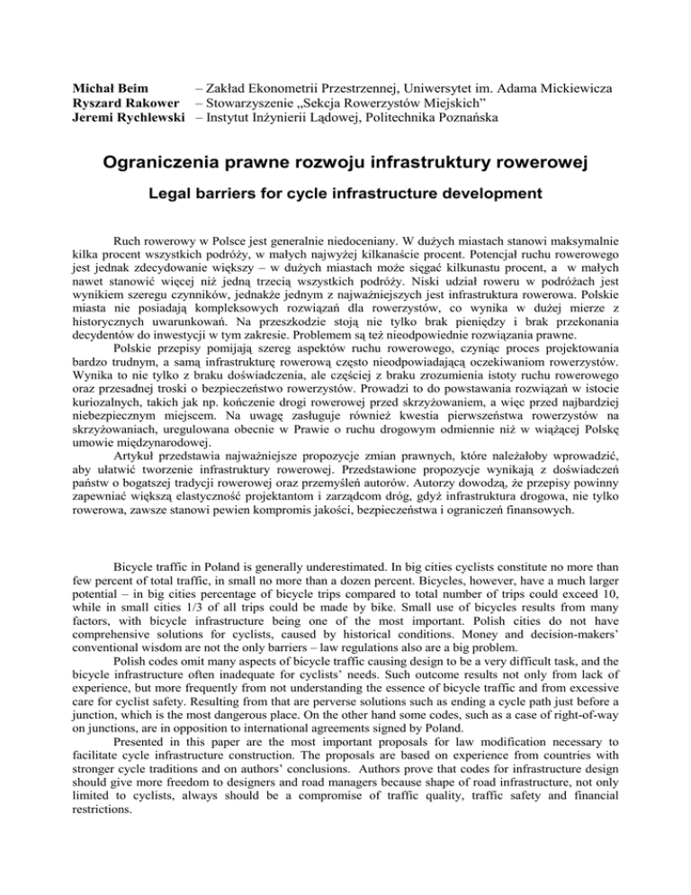 Michał Beim – Zakład Ekonometrii Przestrzennej, Uniwersytet im. Adama Mickiewicza Ryszard Rakower – Stowarzyszenie „Sekcja Rowerzystów Miejskich” Jeremi Rychlewski – Instytut InŜynierii Lądowej, Politechnika Poznańska Ograniczenia prawne rozwoju infrastruktury rowerowej Legal barriers for cycle infrastructure development Ruch rowerowy w Polsce jest generalnie niedoceniany. W duŜych miastach stanowi maksymalnie kilka procent wszystkich podróŜy, w małych najwyŜej kilkanaście procent. Potencjał ruchu rowerowego jest jednak zdecydowanie większy – w duŜych miastach moŜe sięgać kilkunastu procent, a w małych nawet stanowić więcej niŜ jedną trzecią wszystkich podróŜy. Niski udział roweru w podróŜach jest wynikiem szeregu czynników, jednakŜe jednym z najwaŜniejszych jest infrastruktura rowerowa. Polskie miasta nie posiadają kompleksowych rozwiązań dla rowerzystów, co wynika w duŜej mierze z historycznych uwarunkowań. Na przeszkodzie stoją nie tylko brak pieniędzy i brak przekonania decydentów do inwestycji w tym zakresie. Problemem są teŜ nieodpowiednie rozwiązania prawne. Polskie przepisy pomijają szereg aspektów ruchu rowerowego, czyniąc proces projektowania bardzo trudnym, a samą infrastrukturę rowerową często nieodpowiadającą oczekiwaniom rowerzystów. Wynika to nie tylko z braku doświadczenia, ale częściej z braku zrozumienia istoty ruchu rowerowego oraz przesadnej troski o bezpieczeństwo rowerzystów. Prowadzi to do powstawania rozwiązań w istocie kuriozalnych, takich jak np. kończenie drogi rowerowej przed skrzyŜowaniem, a więc przed najbardziej niebezpiecznym miejscem. Na uwagę zasługuje równieŜ kwestia pierwszeństwa rowerzystów na skrzyŜowaniach, uregulowana obecnie w Prawie o ruchu drogowym odmiennie niŜ w wiąŜącej Polskę umowie międzynarodowej. Artykuł przedstawia najwaŜniejsze propozycje zmian prawnych, które naleŜałoby wprowadzić, aby ułatwić tworzenie infrastruktury rowerowej. Przedstawione propozycje wynikają z doświadczeń państw o bogatszej tradycji rowerowej oraz przemyśleń autorów. Autorzy dowodzą, Ŝe przepisy powinny zapewniać większą elastyczność projektantom i zarządcom dróg, gdyŜ infrastruktura drogowa, nie tylko rowerowa, zawsze stanowi pewien kompromis jakości, bezpieczeństwa i ograniczeń finansowych. Bicycle traffic in Poland is generally underestimated. In big cities cyclists constitute no more than few percent of total traffic, in small no more than a dozen percent. Bicycles, however, have a much larger potential – in big cities percentage of bicycle trips compared to total number of trips could exceed 10, while in small cities 1/3 of all trips could be made by bike. Small use of bicycles results from many factors, with bicycle infrastructure being one of the most important. Polish cities do not have comprehensive solutions for cyclists, caused by historical conditions. Money and decision-makers’ conventional wisdom are not the only barriers – law regulations also are a big problem. Polish codes omit many aspects of bicycle traffic causing design to be a very difficult task, and the bicycle infrastructure often inadequate for cyclists’ needs. Such outcome results not only from lack of experience, but more frequently from not understanding the essence of bicycle traffic and from excessive care for cyclist safety. Resulting from that are perverse solutions such as ending a cycle path just before a junction, which is the most dangerous place. On the other hand some codes, such as a case of right-of-way on junctions, are in opposition to international agreements signed by Poland. Presented in this paper are the most important proposals for law modification necessary to facilitate cycle infrastructure construction. The proposals are based on experience from countries with stronger cycle traditions and on authors’ conclusions. Authors prove that codes for infrastructure design should give more freedom to designers and road managers because shape of road infrastructure, not only limited to cyclists, always should be a compromise of traffic quality, traffic safety and financial restrictions. Przepisy prawa budowlanego Rozporządzenie Ministra Transportu i Gospodarki Morskiej z dnia 2 marca 1999 r. w sprawie warunków technicznych, jakim powinny odpowiadać drogi publiczne i ich usytuowanie (Dz.U. Nr 43, poz. 430) poświęca infrastrukturze dla ruchu rowerowego niewiele uwagi. Przepisy § 46-48 tego rozporządzenia określają m.in. minimalną szerokość dróg rowerowych oraz ich dopuszczalne pochylenie poprzeczne i podłuŜne. Wiele kwestii związanych z ich projektowaniem i realizacją nie doczekało się jednakŜe stosownej regulacji. Przykładowo, rozporządzenie nie wskazuje, czy i w jakim zakresie wymogi techniczne odnoszące się do chodników (dział III, rozdział 8) oraz ścieŜek rowerowych (dział III, rozdział 9) stosować naleŜy do dróg pieszo-rowerowych. Brak nawet przepisu określającego minimalną szerokość dwukierunkowej drogi pieszo-rowerowej - przepis § 47 rozporządzenia wskazuje bowiem jedynie minimalne szerokości dróg rowerowych jednokierunkowych (1,5 m), dwukierunkowych (2,0 m) oraz jednokierunkowych dróg rowerowych, z których mogą korzystać piesi (2,5 m). Na krytyczną ocenę zasługują równieŜ zawarte w rozporządzeniu zalecenia odnośnie konstrukcji nawierzchni dróg rowerowych. Załącznik nr 5 do rozporządzenia zaleca stosowanie do budowy dróg rowerowych dwóch rodzajów nawierzchni – bitumicznej oraz z kostki betonowej. O ile nawierzchnia bitumiczna stanowi dla dróg rowerowych nawierzchnię pod wieloma względami najlepszą, to zalecenie stosowania nawierzchni z kostki nie powinno się ostać w przepisach rozporządzenia. Za powyŜszym stanowiskiem przemawia przede wszystkim niŜsza trwałość nawierzchni z kostki, większa niŜ w przypadku asfaltu podatność na erozję oraz wyŜsze opory toczenia, kt