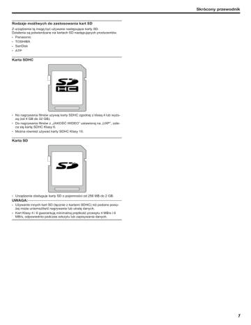 Skrócony przewodnik Rodzaje możliwych do zastosowania kart SD Z urządzenia tą mogą być używane następujące karty SD. Działania są potwierdzane na kartach SD następujących producentów. ● Panasonic ● TOSHIBA ● SanDisk ● ATP . Karta SDHC ● ● ● No nagrywania filmów używaj karty SDHC zgodnej z klasą 4 lub wyższą (od 4 GB do 32 GB). Do nagrywania filmów z „JAKOŚĆ WIDEO” ustawioną na „UXP”, zaleca się kartę SDHC Klasy 6. Można również używać karty SDHC Klasy 10. . Karta SD ● Urządzenie obsługuje karty SD o pojemności od 256 MB do 2 GB. UWAGA: ● ● Używanie innych kart SD (łącznie z kartami SDHC) niż podano powyżej może uniemożliwić nagrywanie lub utratę danych. Kart Klasy 4 i 6 gwarantują minimalną prędkość przesyłu 4 MB/s i 6 MB/s, odpowiednio podczas odczytu lub zapisywania danych. 1