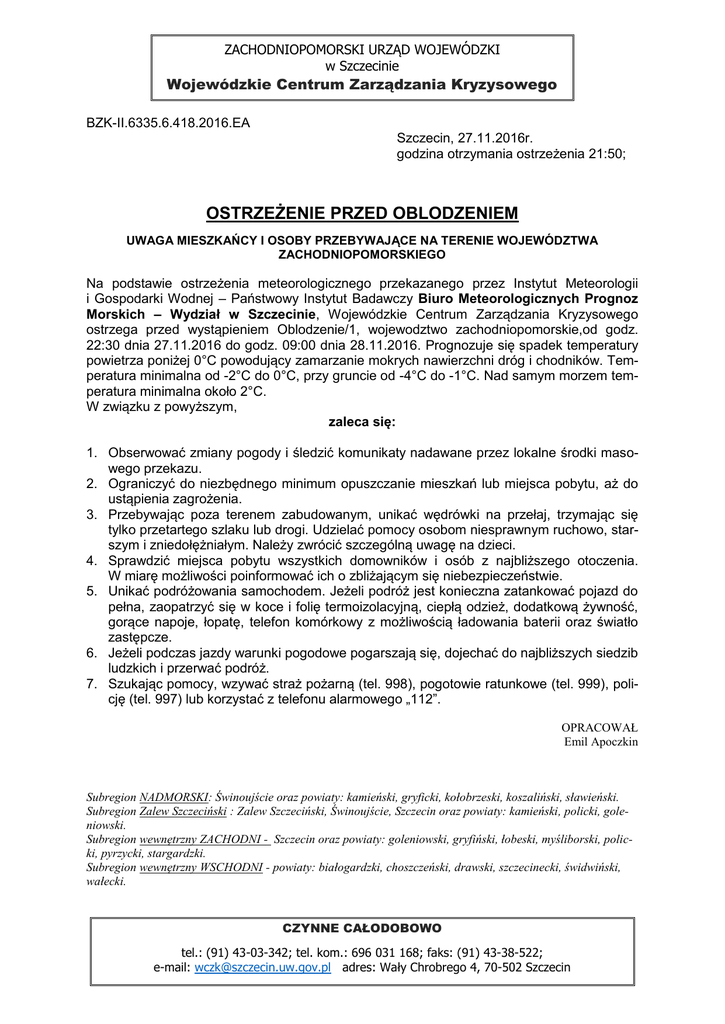 ZACHODNIOPOMORSKI URZĄD WOJEWÓDZKI w Szczecinie Wojewódzkie Centrum Zarządzania Kryzysowego BZK-II.6335.6.418.2016.EA Szczecin, 27.11.2016r. godzina otrzymania ostrzeżenia 21:50; OSTRZEŻENIE PRZED OBLODZENIEM UWAGA MIESZKAŃCY I OSOBY PRZEBYWAJĄCE NA TERENIE WOJEWÓDZTWA ZACHODNIOPOMORSKIEGO Na podstawie ostrzeżenia meteorologicznego przekazanego przez Instytut Meteorologii i Gospodarki Wodnej – Państwowy Instytut Badawczy Biuro Meteorologicznych Prognoz Morskich – Wydział w Szczecinie, Wojewódzkie Centrum Zarządzania Kryzysowego ostrzega przed wystąpieniem Oblodzenie/1, wojewodztwo zachodniopomorskie,od godz. 22:30 dnia 27.11.2016 do godz. 09:00 dnia 28.11.2016. Prognozuje się spadek temperatury powietrza poniżej 0°C powodujący zamarzanie mokrych nawierzchni dróg i chodników. Temperatura minimalna od -2°C do 0°C, przy gruncie od -4°C do -1°C. Nad samym morzem temperatura minimalna około 2°C. W związku z powyższym, zaleca się: 1. Obserwować zmiany pogody i śledzić komunikaty nadawane przez lokalne środki masowego przekazu. 2. Ograniczyć do niezbędnego minimum opuszczanie mieszkań lub miejsca pobytu, aż do ustąpienia zagrożenia. 3. Przebywając poza terenem zabudowanym, unikać wędrówki na przełaj, trzymając się tylko przetartego szlaku lub drogi. Udzielać pomocy osobom niesprawnym ruchowo, starszym i zniedołężniałym. Należy zwrócić szczególną uwagę na dzieci. 4. Sprawdzić miejsca pobytu wszystkich domowników i osób z najbliższego otoczenia. W miarę możliwości poinformować ich o zbliżającym się niebezpieczeństwie. 5. Unikać podróżowania samochodem. Jeżeli podróż jest konieczna zatankować pojazd do pełna, zaopatrzyć się w koce i folię termoizolacyjną, ciepłą odzież, dodatkową żywność, gorące napoje, łopatę, telefon komórkowy z możliwością ładowania baterii oraz światło zastępcze. 6. Jeżeli podczas jazdy warunki pogodowe pogarszają się, dojechać do najbliższych siedzib ludzkich i przerwać podróż. 7. Szukając pomocy, wzywać straż pożarną (tel. 998), pogotowie ratunkowe (tel. 999), policję (tel. 997) lub korzystać z telefonu alarmowego „112”. OPRACOWAŁ Emil Apoczkin Subregion NADMORSKI: Świnoujście oraz powiaty: kamieński, gryficki, kołobrzeski, koszaliński, sławieński. Subregion Zalew Szczeciński : Zalew Szczeciński, Świnoujście, Szczecin oraz powiaty: kamieński, policki, goleniowski. Subregion wewnętrzny ZACHODNI - Szczecin oraz powiaty: goleniowski, gryfiński, łobeski, myśliborski, policki, pyrzycki, stargardzki. Subregion wewnętrzny WSCHODNI - powiaty: białogardzki, choszczeński, drawski, szczecinecki, świdwiński, wałecki. CZYNNE CAŁODOBOWO tel.: (91) 43-03-342; tel. kom.: 696 031 168; faks: (91) 43-38-522; e-mail: [email protected] adres: Wały Chrobrego 4, 70-502 Szczecin