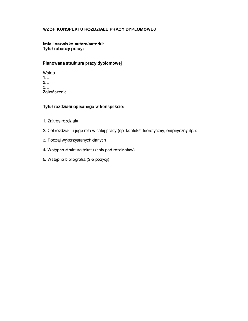 WZÓR KONSPEKTU ROZDZIAŁU PRACY DYPLOMOWEJ Imię i nazwisko autora/autorki: Tytuł roboczy pracy: Planowana struktura pracy dyplomowej Wstęp 1…. 2…. 3…. Zakończenie Tytuł rozdziału opisanego w konspekcie: 1. Zakres rozdziału 2. Cel rozdziału i jego rola w całej pracy (np. kontekst teoretyczny, empiryczny itp.): 3. Rodzaj wykorzystanych danych 4. Wstępna struktura tekstu (spis pod-rozdziałów) 5. Wstępna bibliografia (3-5 pozycji)