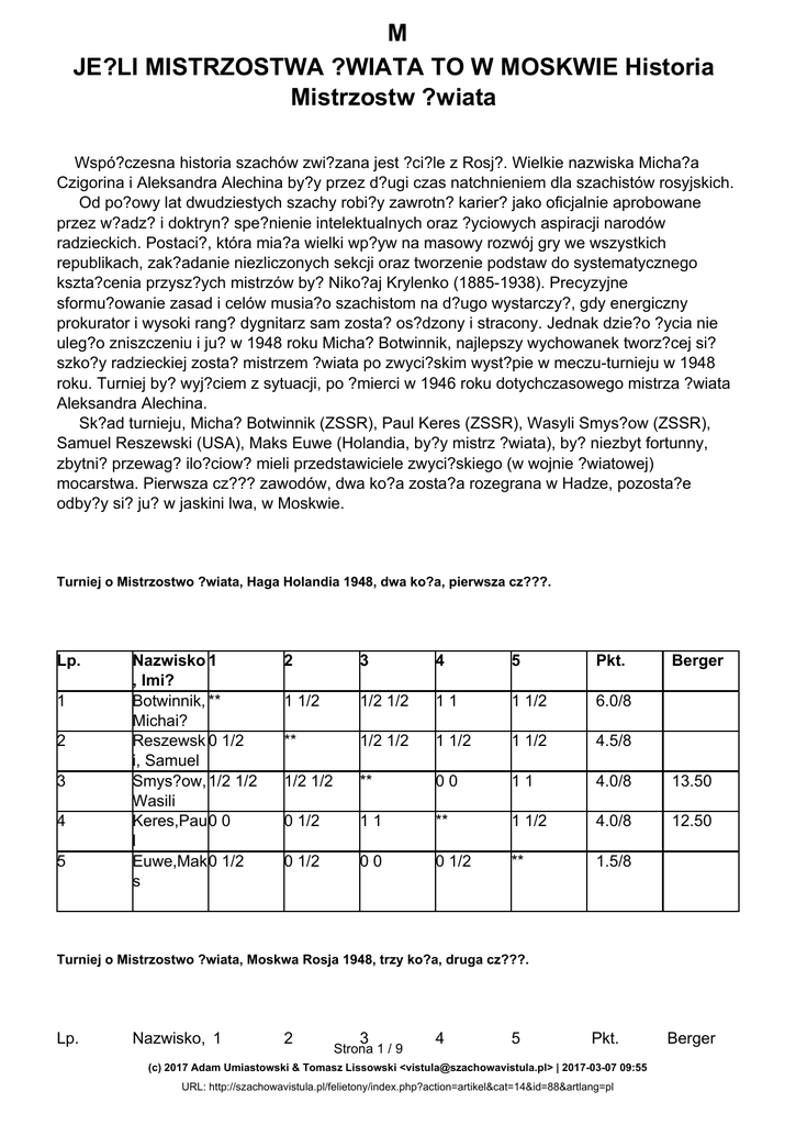 M JE?LI MISTRZOSTWA ?WIATA TO W MOSKWIE Historia Mistrzostw ?wiata Wspó?czesna historia szachów zwi?zana jest ?ci?le z Rosj?. Wielkie nazwiska Micha?a Czigorina i Aleksandra Alechina by?y przez d?ugi czas natchnieniem dla szachistów rosyjskich. Od po?owy lat dwudziestych szachy robi?y zawrotn? karier? jako oficjalnie aprobowane przez w?adz? i doktryn? spe?nienie intelektualnych oraz ?yciowych aspiracji narodów radzieckich. Postaci?, która mia?a wielki wp?yw na masowy rozwój gry we wszystkich republikach, zak?adanie niezliczonych sekcji oraz tworzenie podstaw do systematycznego kszta?cenia przysz?ych mistrzów by? Niko?aj Krylenko (1885-1938). Precyzyjne sformu?owanie zasad i celów musia?o szachistom na d?ugo wystarczy?, gdy energiczny prokurator i wysoki rang? dygnitarz sam zosta? os?dzony i stracony. Jednak dzie?o ?ycia nie uleg?o zniszczeniu i ju? w 1948 roku Micha? Botwinnik, najlepszy wychowanek tworz?cej si? szko?y radzieckiej zosta? mistrzem ?wiata po zwyci?skim wyst?pie w meczu-turnieju w 1948 roku. Turniej by? wyj?ciem z sytuacji, po ?mierci w 1946 roku dotychczasowego mistrza ?wiata Aleksandra Alechina. Sk?ad turnieju, Micha? Botwinnik (ZSSR), Paul Keres (ZSSR), Wasyli Smys?ow (ZSSR), Samuel Reszewski (USA), Maks Euwe (Holandia, by?y mistrz ?wiata), by? niezbyt fortunny, zbytni? przewag? ilo?ciow? mieli przedstawiciele zwyci?skiego (w wojnie ?wiatowej) mocarstwa. Pierwsza cz??? zawodów, dwa ko?a zosta?a rozegrana w Hadze, pozosta?e odby?y si? ju? w jaskini lwa, w Moskwie. Turniej o Mistrzostwo ?wiata, Haga Holandia 1948, dwa ko?a, pierwsza cz???. Lp. 1 2 3 4 5 Nazwisko 1 , Imi? Botwinnik, ** Michai? Reszewsk 0 1/2 i, Samuel Smys?ow, 1/2 1/2 Wasili Keres,Pau 0 0 l Euwe,Mak 0 1/2 s 2 3 4 5 Pkt. Berger 1 1/2 1/2 1/2 11 1 1/2 6.0/8 ** 1/2 1/2 1 1/2 1 1/2 4.5/8 1/2 1/2 ** 00 11 4.0/8 13.50 0 1/2 11 ** 1 1/2 4.0/8 12.50 0 1/2 00 0 1/2 ** 1.5/8 Turniej o Mistrzostwo ?wiata, Moskwa Rosja 1948, trzy ko?a, druga cz???. Lp. Nazwisko, 1 2 3 Strona 1 / 9 4 5 Pkt. (c) 2017 Adam Umiastowski & Tomasz Lissowski <[email protected]> | 2017-03-07 09:55 URL: http://szachowavistula.pl/felietony/index.php?action=artikel&cat=14&id=88&artlang=pl Berger M 1 2 3 4 5 Imi? Botwinnik, *** 1 1/2 1/2 1 1 0 011 1 1/2 1/2 8.0/12 46.00 Michai? Smys?ow, 0 1/2 1/2 *** 1/2 1 1/2 1 1 1/2 011 8.0/13 44.00 Wasyli Keres, 001 1/2 0 1/2 *** 1 0 1/2 111 6.5/12 Paul Reszewsk 1 0 0 0 0 1/2 0 1 1/2 *** 1/2 1 1 6.0/13 i, Samuel Euwe, 0 1/2 1/2 1 0 0 000 1/2 0 0 *** 2.5/12 Maks Od tego momentu mecze o szachowe mistrzostwo ?wiata odbywa?y si? w Moskwie. 19 Mistrzostwa ?wiata Moskwa 1951 Lp 1 2 Naz 1 wisk o,Imi ? Bron 1/2 stein, Dawi d Botwi 1/2 nnik, Mich ai? 13 1/2 1/2 2 3 4 5 6 7 8 9 10 11 12 1/2 1/2 1/2 1 0 0 1/2 1/2 1/2 1 0 1/2 1/2 1/2 0 1 1 1/2 1/2 1/2 0 1 14 1/2 15 1/2 16 1/2 17 1 18 1/2 19 0 20 1/2 21 1 22 1 23 0 24 1/2 1/2 1/2 1/2 0 1/2 1 1/2 0 0 1 1/2 Opowie?ci o tajemniczych okoliczno?ciach tego meczu kr??? do dzi?, wystarczy sobie jednak zda? spraw?, ?e by?y to straszne czasy terroru i wiele rzeczy przebiega?o niejawnie, podporz?dkowane celom politycznym i propagandowym. Remis w meczu zgodnie z regulaminem FIDE pozostawi? tytu? mistrzowi ?wiata Botwinnikowi. Kolejne spotkanie o najwy?szy tytu? przebiega?o wed?ug podobnego scenariusza, mistrz z trudem obroni? tytu? na finiszu, remisuj?c mecz, jednak przysz?o mu walczy? ze Smys?owem a? trzy razy... Strona 2 / 9 (c) 2017 Adam Umiastowski & Tomasz Lissowski <[email protected]> | 2017-03-07 09:55 URL: http://szachowavistula.pl/felietony/index.php?action=artikel&cat=14&id=88&artlang=pl Pk 12 24 M 20 Mistrzostwa ?wiata Moskwa 1954 Lp. Nazw 1 isko,I 2 3 4 5 6 7 8 9 10 11 12 1 Botwi 1 nnik, Mich ai? 1 1/2 1 1/2 1/2 0 1/2 0 0 0 1 2 Smys 0 ?ow, Wasy li 0 1/2 0 1/2 1/2 1 1/2 1 1 1 0 13 14 15 16 17 18 19 20 21 22 23 24 Pk 1 0 1 1 1/2 1/2 1/2 0 1/2 1/2 0 1/2 12 24 0 1 0 0 1/2 1/2 1/2 1 1/2 1/2 1 1/2 12 24 Kolejne podej?cie pretendenta mia?o miejsce w 1957 roku. 21 Mistrzostwa ?wiata Moskwa 1957 Lp. Nazw 1 isko,I 2 3 4 5 6 7 8 9 10 11 1 1 Smys ?ow, Wasyl i 1 1/2 1/2 0 0 1 1/2 1 1/2 1/2 1/2 1 2 Botwi 0 nnik, Michai ? 1/2 1/2 1 1 0 1/2 0 1/2 1/2 1/2 0 W ten sposób ?wiat pozna? kolejnego rosyjskiego mistrza ?wiata. Jednak szko?a radziecka wci?? silnie uto?samia?a si? ze s?ynnym Alechinem, buduj?c na podstawie jego twórczo?ci ca?? teori? przygotowa? do najwy?szych osi?gni?? sportowych. Nast?pne spotkanie w Moskwie odby?o si? za rok i zmieni?o uk?ad si? mi?dzy rywalami. 22 Mistrzostwa ?wiata Moskwa 1958 Strona 3 / 9 (c) 2017 Adam Umiastowski & Tomasz Lissowski <[email protected]> | 2017-03-07 09:55 URL: http://szachowavistula.pl/felietony/index.php?action=artikel&cat=14&id=88&artlang=pl M Lp. Naz wisk o,I 1 2 3 4 5 6 7 8 9 10 11 12 1 Botwi 1 nnik, Micha i? 1 1 1/2 0 1 1/2 1/2 1/2 1/2 0 1 2 Smys 0 ?ow, Wasyl i 0 0 1/2 1 0 1/2 1/2 1/2 1/2 1 0 Niebezpiecze?stwo nadesz?o niespodziewanie ze strony 23 letniego Michai?a Tala z Rygi na ?otwie. Mecz rozpocz?? si? sensacyjnym 3:0 dla Tala, dwie zwyci?skie partie Botwinnika niewiele zmieni?y, kolejne trzy wygrane pretendenta przes?dzi?y o losach pojedynku. 23 Mistrzostwa ?wiata Moskwa 1960 Lp. Nazw isko,I 1 2 3 4 5 6 7 8 9 10 11 1 Tal,Mi chai? 1 1/2 1/2 1/2 1/2 1 1 0 0 1/2 1 2 Botwi 0 nnik,M ichai? 1/2 1/2 1/2 1/2 0 0 1 1 1/2 0 Rewan? nast?pi? ju? po roku, tym razem Tal, który przeszed? ci??k? operacj? nerek nie by? w stanie osi?gn?? poprzedniego poziomu gry. 24 Mistrzostwa ?wiata Moskwa 1961 Lp. Nazw isko,I 1 2 3 4 5 6 7 8 9 10 11 1 Botwi 1 nnik,M ichai? 0 1 1/2 1/2 1/2 1 0 1 1 1 2 Tal,Mi 1 0 1/2 1/2 1/2 0 1 0 0 0 0 Strona 4 / 9 (c) 2017 Adam Umiastowski & Tomasz Lissowski <[email protected]> | 2017-03-07 09:55 URL: http://szachowavistula.pl/felietony/index.php?action=artikel&cat=14&id=88&artlang=pl M chai? Mistrz zacz?? jednak s?abn?? pod naporem nowych si? i nie przetrzyma? kolejnego meczu w Moskwie. Ostro?ny techniczny styl pretendenta z Armenii nie dawa? szansy na obna?enie s?abych stron 33-letniego napastnika. Botwinnik (ur. 1911) 