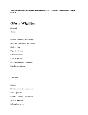 Zamówienia prosimy składać pod numerem telefonu: 698 633 083 oraz bezpośrednio w naszych lokalach. Oferta Wigilijna Zestaw I 19zł/os Pierożki z kapustą i pieczarkami Bułeczka faszerowana pieczarkami Śledź w oleju Bigos świąteczny Sałatka śledziowa Keks świąteczny Pieczywo/ bułeczki koktajlowe Masełko czosnkowe Zestaw II 25zł/os Pierożki z kapustą i pieczarkami Ryba w panierce Łazanki z kapustą i pieczarkami Śledź w śmietanie Sałatka jarzynowa Strucla z makiem Pieczywo/ bułeczki koktajlowe Masełko czosnkowe Zestaw III 34zł/os Pasztet świąteczny z żurawiną Karp dzwonka Roladki z łososiem i szpinakiem Śledź w oleju z koperkiem Śledź w sosie musztardowym Kluski z makiem Pierogi z kapustą Sałatka śledziowa Sałatka jarzynowa Skrzydełka panierowane Pieczywo/ bułeczki koktajlowe Masełko czosnkowe Zestaw IV 30zł/os Pierogi z kapustą i pieczarkami Bigos wigilijny Ryba po grecku Sałatka z tuńczykiem Sałatka jarzynowa Babeczki z łososiem Śledź po sułtańsku Śledź w śmietanie Keks świąteczny Pieczywo/ bułeczki koktajlowe Masełko czosnkowe Zestaw V 30zł/os Barszcz Pierogi z kapusta i pieczarkami Sola w galarecie Sałatka grecka Sałatka pieczarkowa Śledź gajowego Śledź w śmietanie Pasztet świąteczny z żurawiną Babeczki z łososiem Keks świąteczny Pieczywo/ bułeczki koktajlowe Masełko czosnkowe