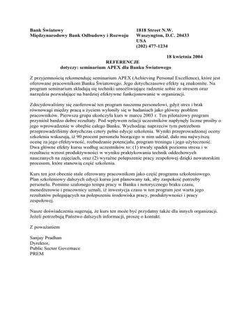 Bank Światowy Międzynarodowy Bank Odbudowy i Rozwoju 1818 Street N.W. Waszyngton, D.C. 20433 USA (202) 477-1234 18 kwietnia 2004 REFERENCJE dotyczy: seminarium APEX dla Banku Światowego Z przyjemnością rekomenduję seminarium APEX (Achieving Personal Excellence), które jest oferowane pracownikom Banku Światowego. Jego dotychczasowe efekty są znakomite. Na program seminarium składają się techniki umożliwiające radzenie sobie ze stresem oraz narzędzia pozwalające na bardziej efektywne funkcjonowanie w organizacji. Zdecydowaliśmy się zaoferować ten program naszemu personelowi, gdyż stres i brak równowagi między pracą a życiem wyłoniły się w badaniach jako główny problem pracowników. Pierwsza grupa ukończyła kurs w marcu 2003 r. Ten pilotażowy program przyniósł bardzo dobre rezultaty. Pod wpływem relacji uczestników napłynęły liczne prośby o jego wprowadzenie w obrębie całego Banku. Wychodząc naprzeciw tym potrzebom przeprowadziliśmy dotychczas cztery pełne edycje szkolenia. Wyniki przeprowadzonej oceny szkolenia wskazują, iż 90 procent personelu biorącego w nim udział, dało mu najwyższą ocenę za jego efektywność, rozbudzanie potencjału, program treningu i jego użyteczność. Dwa główne efekty kursu według uczestników to: (1) trwały spadek poziomu stresu i w rezultacie wzrost produktywności w wyniku praktykowania technik oddechowych nauczanych na zajęciach, oraz (2) wyraźne polepszenie pracy zespołowej dzięki nowatorskim procesom, które stanowią część szkolenia. Kurs ten jest obecnie stale oferowany pracownikom jako część programu szkoleniowego. Plan szkoleniowy dalszych edycji kursu jest planowany tak, aby zaspokoić potrzeby personelu. Pomimo szalonego tempa pracy w Banku i notorycznego braku czasu, menedżerowie i pracownicy uznali, iż inwestycja czasu w ten program jest warta jego rezultatów polegających na polepszeniu środowiska pracy, produktywności i pracy zespołowej. Nasze doświadczenia sugerują, że kurs ten może być przydatny także dla innych organizacji. Jeżeli potrzebują Państwo dalszych informacji, proszę o kontakt. Z poważaniem Sanjay Pradhan Dyrektor, Public Sector Governace PREM