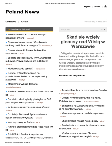 25.05.2016 Skąd się wzięły globusy nad Wisłą w Warszawie English | Poland | Poland News Contact US | Archive Wednesday 25 May 2016 Most Popular (6 hours) 7 days ago Właściciel Maspex o prawie wodnym: pocałunek śmierci - money.pl Skąd się wzięły globusy nad Wisłą w Warszawie Rozłam w Nowoczesnej. Wrocławskie struktury partii Petru w rozsypce? - niezalezna.pl Prezes Unicredit Ghizzoni odszedł ze stanowiska - pb.pl Jechał z prędkością 200 km/h, wyprzedził radiowóz. Prawa jazdy nie ma od kilku lat tvn24.pl Macierewicz do dymisji? - pb.pl Od tygodnia na odnowionych warszawskich bulwarach wiślanych w pobliżu Parku Fontann stoi 16 dużych globusów. To wystawa Cool Globes Warsaw podróżująca od 10 lat po świecie i mająca zwrócić uwagę na problemy newsweek.pl Bomber z Wrocławia czeka na przesłuchanie. To był od początku trudny przeciwnik - tvn24.pl ekologiczne naszej planety. Read on the original site Możdżonek wybiera Resovię! przegladsportowy.pl AmRest przedłuża franszyze Pizza Hut o 10 lat - pb.pl Burmistrz: skończyły się pieniądze na 500 plus. Wojewoda odpowiada - tvn24.pl W Sopocie zatrzymano zbiega z Ukrainy tvn24.pl Co dalej z Tuskiem? Być może lewica będzie chciała go wyrzucić Walczą o cenę za Redan - wprost.pl pb.pl AmRest przedłuża franczyzę Pizza Hut o 10 lat - pb.pl BIŁGORAJ: Grafika komputerowa uczennicy LO im. ONZ w Biłgoraju wyróżniona http://poland.shafaqna.com/PL/PL/198197 Asystent Bieglera na rozmowach w Górniku - przegladsportowy.pl Gollob: Nowinki tunerów nic nie warte. Żużel nie jest szybszy - przegladsportowy.pl Skazano ją na 22 lat więzienia. Wymienili ją na agentów wywiadu - fakt.pl/ Warszawa spuszcza z zadziornego tonu tvn24.pl Shell likwiduje tysiące miejsc pracy - pb.pl Powiedziała rodzicom, że idzie na koncert. Nie wróciła - fakt.pl/ Wielka wyrwa w centrum Florencji. Ewakuacja, zagrożone zabytki - tvn24.pl 1/13