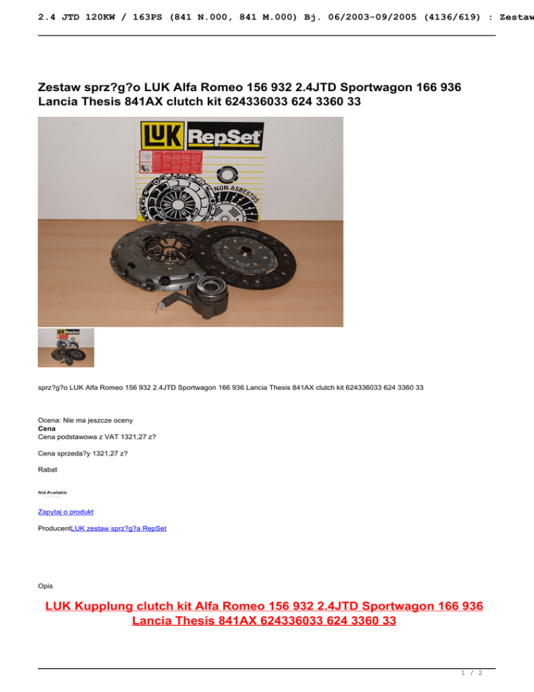 sprzęgło LUK Alfa Romeo 156 932 2.4JTD Sportwago