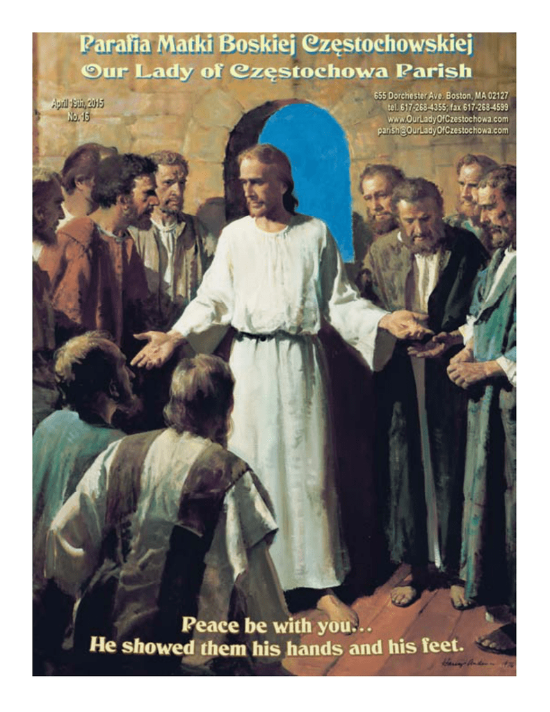BIURO PARAFIALNE / PARISH OFFICE Tel: 617-268-4355; Fax: 617-268-4599 Monday - Thursday Friday 10:00 am - 4:00 pm 8:00 am - 1:00 pm Saturday: 10:00 am - 12:00 pm Evenings and weekends - by appointment only. PORZĄDEK MSZY ŚWIĘTYCH MASS SCHEDULE Mon. - Wed. 7:00 am (English); 8:00 am (Polish) Thursday 7:00 am (English) 7:00 pm (Polish) Friday 7:00 am (English) 6:00 pm - 7:00 pm - Adoracja Najśw. Sakr. - Koronka Spowiedź - Adoration, Divine Mercy Chaplet, Confession 7:00 pm (Polish) Saturday 8:00 am (Polish) 4:00 pm (English) 7:00 pm (Polish) Sunday 8:00 am (Polish) 9:30 am (English) 11:00 am (Polish) Holydays - as announced SPOWIEDŹ / CONFESSIONS Friday 6:00 pm and every day 30 min. before Masses. CHRZEST / BAPTISM By arrangement with the priest. Instruction for parents and godparents is required. SAKRAMENT MAŁŻEŃSTWA / MARRIAGE Please, make arrangement with the parish office at least six months in advance. Instruction is required. SAKRAMENT CHORYCH/SACRAMENT OF THE SICK Parishioners who are seriously ill should call the office to arrange for a priest to visit and administer the Sacraments. ŻYCIE JEST DAREM OD BOGA Jeżeli odkryłaś, że pod Twym sercem poczęło się życie, przyjdź do nas sama lub z najbliższą osobą i podziel się tą wspaniałą nowiną. Będziemy Ci błogosławić, a jeśli trzeba - służyć pomocą. Nie lękaj się! - Ojcowie franciszkanie PASTORAL STAFF - FRANCISCAN FRIARS OJCOWIE FRANCISZKANIE (OFM Conv.) Fr. Jan Łempicki OFMConv. - pastor Fr. Józef Brzozowski OFMConv. - parochial vicar Fr. Józef Błaszak OFMConv. - hospital chaplain Fr. Aloysius Minyong Hong OFMConv. - in residence KATECHECI / CATECHISTS Diakon Paweł Sawiak - bierzmowanie; Urszula Boryczka - kl. 0 Elżbieta Sokołowska - kl. 0; Danuta Surowiec-Ramos - kl. 2; Zofia Fiedorczyk - kl. 3; Monika Danek - kl. 4; Anna Maziarz - kl. 5; Piotr Goszczynski - kl. 6; Danuta Daniels - kl. 6; Eugeniusz Bramowski - kl. 7; Alicja Szewczyk - zastępstwa; Beata Kozak - zastępstwa; Małgorzata Sokołowski - zastępstwa; Iwona Gajczak - koordynatorka PRACOWNICY PARAFII / OFFICE STAFF Secretary & Religious Education Coordinator - Mrs. Iwona Gajczak Bookkeeper & Office Assistant - Ms. Connie Bielawski RADA PARAFIALNA / PARISH COUNCIL Mr. Szymon Biegański, Mr. Grzegorz Boryczka, Mr. Eugeniusz Bramowski, Mr. Czesław Kilian, Mr. Jan Kozak, Ms. Maryann Sadowski, Mr. Zbigniew Saletnik, Ms. Danuta Urbaniak, Mrs. Lucy Willis, Mrs. Władzia Wygonowska RADA FINANSOWA / FINANCE COUNCIL Ms. Constance Bielawski, Mr. Grzegorz Boryczka, Mr. Maks Gradziuk, Mr. Rafał Jabłonka, Mr. Richard Rolak, Mr. Wiesław Wierzbowski SŁUŻBA MUZYCZNA / MUSIC MINISTRY Organist & Psalmist: Mrs. Marta Saletnik ZAKRYSTIA/SACRISTAN – KWIATY/FLOWERS Mrs. Beata Kozak & Mrs. Renata Marshall Misją Parafii Matki Bożej Częstochowskiej jest dawanie świadectwa wiary rzymsko-katolickiej i polskiego dziedzictwa. Ofiarnie i nieustannie służymy Bogu i sobie nawzajem zachowując i dzieląc się naszymi polskimi tradycjami w otwarciu się na wszystkich ludzi. Parafię obsługują Ojcowie Franciszkanie. The mission of the Parish of Our Lady of Czestochowa is to bear witness to our Roman Catholic faith and our Polish heritage. We strive to continue to serve God and each other, celebrating and sharing our Polish traditions, welcoming and reaching out to all people. The parish is served by Conventual Franciscan Friars. LIFE IS A GIFT FROM GOD If you discovered that a new life began under your heart, come to us alone or with someone you love, and share this wonderful news. We will bless you, and - if necessary - offer you help. Do not be afraid! - Franciscan Fathers ACTIVITIES & ORGANIZATIONS ♦ Sala św. Jana Pawła II — St. John Paul II Hall Kontakt w sprawie wynajmu sali: tel: 617-268-4355 W sprawie sprzętu audio-wizualnego tel. 617-922-3691 Contact for renting the hall: tel: 617-268-4355 For audio-visual equipment tel. 617-922-3691 (Mariusz) ♦ Ministranci / Altar Servers - Eugeniusz Bramowski Spotkania w pierwsze niedziele miesiąca w sali świętego Jana Pawła II o godz. 10:00 am (781-871-2991) ♦ Fundacja Kultury Polskiej - Polish Cultural Foundation, Inc. - Mr. Andrzej Pronczuk - tel. 617-859-9910 ♦ Polska Szkoła Sobotnia - Polish Saturday School - Mr. Jan Kozak - tel. 617-464-2485 ♦ Chór Parafialny i Chórek Dziecięcy Promyki św. Jana Pawła II - Parish Choir & Children Choir - Mrs. Marta Saletnik, tel. kom. 857-212-7962 ♦ Stowarzyszenie Weteranów Armii Polskiej - SWAP #37 Mr. Wincenty Wiktorowski - tel. 617-288-1649 Grupa AA - Stanisław, tel. 508 283 4262 Sala pod kościołem. 2 Spotkania odbywają się w każdy czwartek o godz. 7:00 pm ♦ Krakowiak - Wednesdays at 7:30 pm - St. John Paul II hall www.krakowiak.org,: Eric Pierce: Tel. 508-320-2344 ♦ Żywy Różaniec / Rosary Society - Mrs. Genowefa Lisek tel. 617-436-5779 ♦ Siostry Matki Bożej Miłosierdzia Sisters of Our Lady of Mercy: tel. 617-288-1202 ♦ Polski Amatorski Teatr w Bostonie / Polish Theater - Mrs. Małgorzata Tutko: tel. 617-325-2208 ♦ Harcerze / Polish Scouts - The meetings will be conducted in Polish for young boys and girls. Contact information: Mateusz Wozny, tel. 347-749-5867, email: [email protected] ♦ Klub Polski Polish American Citizens Club - Mr. Christopher Lisek Club: 617-436-2786; Cell: 617-436-2686 Following Him The calling of the brothers in today's Gospel evokes Elisha's commissioning by the prophet Elijah (see 1 Kings 19:19-21). As Elijah comes upon Elisha working on his family's farm, so Jesus sees the brothers working by the seaside. And as Elisha left his mother and father to follow Elijah, so the brothers leave their father to come after Jesus. Jesus' promise - to make them "fishers of men" - evokes Israel's deepest hopes. The prophet Jeremiah announced a new exodus in which God would send "many fishermen" to restore the Israelites from exile, as once He brought them out of slavery in Egypt (see Jeremiah 16:14-16). B