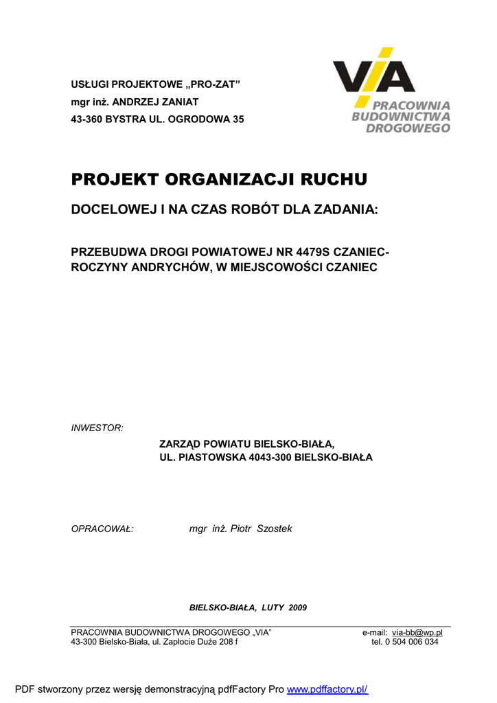 USŁUGI PROJEKTOWE „PRO-ZAT” mgr inż. ANDRZEJ ZANIAT 43-360 BYSTRA UL. OGRODOWA 35 PROJEKT ORGANIZACJI RUCHU DOCELOWEJ I NA CZAS ROBÓT DLA ZADANIA: PRZEBUDWA DROGI POWIATOWEJ NR 4479S CZANIECROCZYNY ANDRYCHÓW, W MIEJSCOWOŚCI CZANIEC INWESTOR: ZARZĄD POWIATU BIELSKO-BIAŁA, UL. PIASTOWSKA 4043-300 BIELSKO-BIAŁA OPRACOWAŁ: mgr inż. Piotr Szostek BIELSKO-BIAŁA, LUTY 2009 PRACOWNIA BUDOWNICTWA DROGOWEGO „VIA” 43-300 Bielsko-Biała, ul. Zapłocie Duże 208 f e-mail: [email protected] tel. 0 504 006 034 PDF stworzony przez wersję demonstracyjną pdfFactory Pro www.pdffactory.pl/ Projekt organizacji ruchu 2 1. DANE OGÓLNE. 1.1. TEMAT, CEL I ZAKRES OPRACOWANIA. Tematem opracowania jest projekt organizacji ruchu docelowej i na czas robót dla zadań: 1. „Przebudowa drogi powiatowej nr 4479S Czaniec-Roczyny - Andrychów, w miejscowości Czaniec” 2. „Rewitalizacja centrum Czańca w miejscowości Czaniec”. Celem opracowania zadania 1 jest wykonanie projektu budowlanego przebudowy drogi powiatowej nr 4479 S w miejscowości Czaniec. Przebudowa będzie polegała na wykonaniu remontu, odtworzenie stanu pierwotnego oraz dostosowanie drogi do wymogów panujących na drodze i do parametrów drogi klasy Z. Opracowanie ma na celu usprawnienie i poprawę bezpieczeństwa ruchu samochodowego i pieszego. Projektowana droga na zdecydowanej długości przebiega w terenie zabudowanym. Występuje bardzo intensywny ruch samochodowy i pieszy. Opracowaniem objęto początkowy odcinek drogi od skrzyżowania z drogą powiatową 1456S /Czaniec- Porąbka/ do skrzyżowania z droga powiatowa 4478S /Czaniec- Zagłębocze-Bulowice/, a jej długość wynosi 1534,65mb W zakres robót wchodzi: • wzmocnienie istniejącej konstrukcji nawierzchni wraz z poszerzeniem do szerokości 6,0mb • budowa wysepek kanalizacyjnych ruch kołowy na skrzyżowaniu w centrum Czańca i na skrzyżowaniu z drogą powiatową ul. Bukowska. • budowa zatoki autobusowej • budowę chodnika dla pieszych po prawej stronie zgodnie z kilometrażem drogi, a na wysokości ul. Bukowskiej naprzemiennie z lewej lub z prawej strony drogi. • budowa miejsc parkingowych • poprawa odwodnienia poprzez zabudowę urządzeń odwadniających wraz z włączeniem do istniejącej kanalizacji deszczowej. • przebudowy mostu drogowego na potoku Młynówka Czaniecka Celem opracowania zadania 2 jest wykonanie projektu budowlanego rewitalizacji centrum handlowego w miejscowości Czaniec. Opracowanie ma na celu przebudowę istniejących dróg wewnętrznych, miejsc parkingowych wraz budową parkingów dla samochodów osobowych oraz dróg dojazdowych stanowiących powiązanie z drogą powiatową /ul. Karola Wojtyły/. Przebudowa będzie polegała na wykonaniu remontu elementów istniejących, bądź na budowie nowych dróg, miejsc parkingowych i elementów odwadniających. Opracowanie ma na celu usprawnienie i poprawę bezpieczeństwa ruchu samochodowego i pieszego. Opracowanie obejmuje przebudowę całego układu drogowego w centrum, w nawiązaniu do istniejących budynków handlowych i budynków użyteczności publicznej. W zakres robót wchodzi: • przebudowa istniejących dróg wewnętrznych stanowiących układ komunikacyjny centrum. PDF stworzony przez wersję demonstracyjną pdfFactory Pro www.pdffactory.pl/ Projekt organizacji ruchu • • • • • • 3 przebudowa istniejących miejsc parkingowych budowa parkingów dla samochodów osobowych przebudowa istniejących i budowa chodników dla pieszych. budowa dróg dojazdowych stanowiących powiązanie z drogą powiatową. budowa kanalizacji deszczowej wraz z odprowadzeniem do istniejącej kanalizacji deszczowej poprawa odwodnienia poprzez budowę urządzeń odwadniających wraz z odprowadzeniem do istniejącej kanalizacji deszczowej 1.2. PODSTAWA OPRACOWANIA. • • • • • Zlecenie Zarządu Powiatu i realizowany na podstawie umowy nr 13/2008 z dnia 09.01.2008r. projekt koncepcyjny centrum Czańca opracowany przez Pracownię Projektowo-Usługową „Rondo” z Katowic. Rozporządzenia Ministra Transportu i Gospodarki Morskiej z dnia 2 marca 1999r „W sprawie warunków technicznych, jakim powinny odpowiadać drogi publiczne i ich usytuowanie Rozporządzenie Ministra Infrastruktury w sprawie szczegółowych warunków zarządzania ruchem na drogach oraz wykonywaniem nadzoru nad tym zarządzaniem Rozporządzenie Ministra Infrastruktury w sprawie szczegółowych warunków technicznych dla znaków i sygnałów drogowych oraz urządzeń bezpieczeństwa ruchu drogowego i warunków ich umieszczania na drogach. 1.3. INWESTOR. Inwestorem projektu budowlanego zadania: „Przebudowa drogi powiatowej nr 4479S Czaniec-Roczyny - Andrychów, w miejscowości Czaniec” jest Zarząd Powiatu Bielsko-Biała ul. Piastowska 40 43-300 Bielsko-Biała. Inwestorem projektu budowlanego zadania: „Rewitalizacja centrum Czańca w miejscowości Czaniec” jest Gmina Porąbka, ul. Krakowska 3, 43-353 Porąbka. PDF stworzony przez wersję demonstracyjną pdfFactory Pro www.pdffactory.pl/ Projekt organizacji ruchu 4 2. OPIS TECHNICZNY. 2.1. STAN ISTNIEJĄCY. Przedmiotem projektu jest odcinek drogi powiatowej-ul. Karola Wojtyły w Czańcu. Na początkowym odcinku od skrzyżowania z droga 4478S do skrzyżowania z ul. Bukowską droga posiada przekrój półuliczny z jezdną o szerokości około 6,0mb i prawostronnym chodnikiem dla pieszych. Na pozostałym odcinku przekrój jest drogowy, gdzie w przekroju poprzecznym występuje jezdnia szerokości około 600cm i obustronne pobocza gruntowe szerokości 75cm każde. Odwodnienie drogi jest powierzchniowe, a wody deszczowe są odprowadzane do istniejących rowów przydrożnych/na początkowym odcinku/, istniejących kolektorów deszczowych /od początkowego odcinka do skrzyżowania z ul. Bukowską/ lub w przyległy teren/ na końcowym odcinku drogi/. Na całej długości przebieg drogi jest kręty z licznymi łukami poziomymi. Droga na całej długości przebiega w tereni