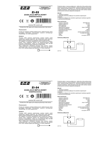 ul. Konstantynowska 79/81 95-200 Pabianice tel/fax 42-2152383, 2270971 e-mail: [email protected] ZI-22 A RA N JA C 24 GW JA C GW ZASILACZ IMPULSOWY stabilizowany miesiące A RA N 5 9 0 8 3 1 2 5 9 2 2 8 0 www.fif.com.pl Produkty firmy F&F objęte są 24 miesięczną gwarancją od daty zakupu Przeznaczenie ZI służy do zasilania urządzeń elektrycznych i elektronicznych, które wymagają stabilnego, filtrowanego napięcia zasilającego niezależnego od zmian napięcia sieci . Podobnie zdarzy się przy podłączeniu odbiornika, który pobiera duży prąd rozruchowy (np. zimna żarówka). Jeżeli przeciążenie nie jest zbyt duże , zasilacz po kilku próbach ( np. stopniowe rozgrzewanie włókna żarówki) wystartuje. Jeżeli obciążenie jest zbyt duże zasilacz będzie próbkować do momentu odłączenia obciążenia. Montaż 1. Wyłączyć zasilanie. 2. Przewody sieciowe podłączyć do zacisków wejściowych zasilacza. 3. Odbiornik podłączyć do zacisków wyjściowych zasilacza zgodnie z zaznaczoną polaryzacją. Dane techniczne napięcie wejściowe napięcie wyjściowe prąd wyjściowy moc wyjściowa ograniczenie prądowe minimalne obciążenie częstotliwość kluczowania temperatura pracy przyłącze wymiary waga montaż 100÷264V AC 12V DC 2,5A 30W Imax=110%Iwyj 0% 70KHz -10÷40°C zaciski śrubowe 2,5mm² 3 moduły (52,5mm) 190g na szynie TH-35 Działanie *Poniżej 160V napięcia wejściowego zasilacz będzie nadal stabilizować napięcie wyjściowe, ale maksymalny prąd wyjściowy będzie spadać współbieżnie ze spadkiem napięcia wejściowego. *Ze względu na wysoką częstotliwość pracy przetwornicy niektóre, bardzo czułe urządzenia radiowe lub mikroprocesorowe mogą pracować nieprawidłowo. Zaleca się zainstalowanie filtru OP-230 (patrz pozycja 18) pomiędzy zasilaczem a odbiornikiem. *Przy zwiększeniu obciążenia powyżej Imax zasilacz będzie stabilizować prąd, a nap. wyj. będzie spadać. Jeżeli nap. wyj. spadnie do ok. 40% zasilacz wyłączy się i będzie co 1,5÷2sek. próbkować. Schemat podłączenia ~ ~ Uwej Uwyj - + A071110 ul. Konstantynowska 79/81 95-200 Pabianice tel/fax 42-2152383, 2270971 e-mail: [email protected] ZI-24 A RA N JA C 24 GW JA C GW ZASILACZ IMPULSOWY stabilizowany miesiące A RA N 5 9 0 8 3 1 2 5 9 2 2 9 7 www.fif.com.pl Produkty firmy F&F objęte są 24 miesięczną gwarancją od daty zakupu Przeznaczenie ZI służy do zasilania urządzeń elektrycznych i elektronicznych, które wymagają stabilnego, filtrowanego napięcia zasilającego niezależnego od zmian napięcia sieci . Podobnie zdarzy się przy podłączeniu odbiornika, który pobiera duży prąd rozruchowy (np. zimna żarówka). Jeżeli przeciążenie nie jest zbyt duże , zasilacz po kilku próbach ( np. stopniowe rozgrzewanie włókna żarówki) wystartuje. Jeżeli obciążenie jest zbyt duże zasilacz będzie próbkować do momentu odłączenia obciążenia. Montaż 1. Wyłączyć zasilanie. 2. Przewody sieciowe podłączyć do zacisków wejściowych zasilacza. 3. Odbiornik podłączyć do zacisków wyjściowych zasilacza zgodnie z zaznaczoną polaryzacją. Dane techniczne napięcie wejściowe napięcie wyjściowe prąd wyjściowy moc wyjściowa ograniczenie prądowe minimalne obciążenie częstotliwość kluczowania temperatura pracy przyłącze wymiary waga montaż Działanie *Poniżej 160V napięcia wejściowego zasilacz będzie nadal stabilizować napięcie wyjściowe, ale maksymalny prąd wyjściowy będzie spadać współbieżnie ze spadkiem napięcia wejściowego. *Ze względu na wysoką częstotliwość pracy przetwornicy niektóre, bardzo czułe urządzenia radiowe lub mikroprocesorowe mogą pracować nieprawidłowo. Zaleca się zainstalowanie filtru OP-230 (patrz pozycja 18) pomiędzy zasilaczem a odbiornikiem. *Przy zwiększeniu obciążenia powyżej Imax zasilacz będzie stabilizować prąd, a nap. wyj. będzie spadać. Jeżeli nap. wyj. spadnie do ok. 40% zasilacz wyłączy się i będzie co 1,5÷2sek. próbkować. Schemat podłączenia ~ ~ Uwej Uwyj - A071110 + 100÷264V AC 24V DC 1,25A 30W Imax=110%Iwyj 0% 70KHz -10÷40°C zaciski śrubowe 2,5mm² 3 moduły (52,5mm) 190g na szynie TH-35