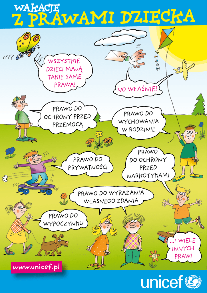 WAKACJE z PRAWAMI DZIECKA wszystkie dzieci mają takie same prawa! prawo do ochrony przed przemocą prawo do prywatności No właśnie! prawo do wychowania w rodzinie prawo do ochrony przed narkotykami prawo do wyrażania własnego zdania prawo do wypoczynku www.unicef.pl ...i wiele innych praw!