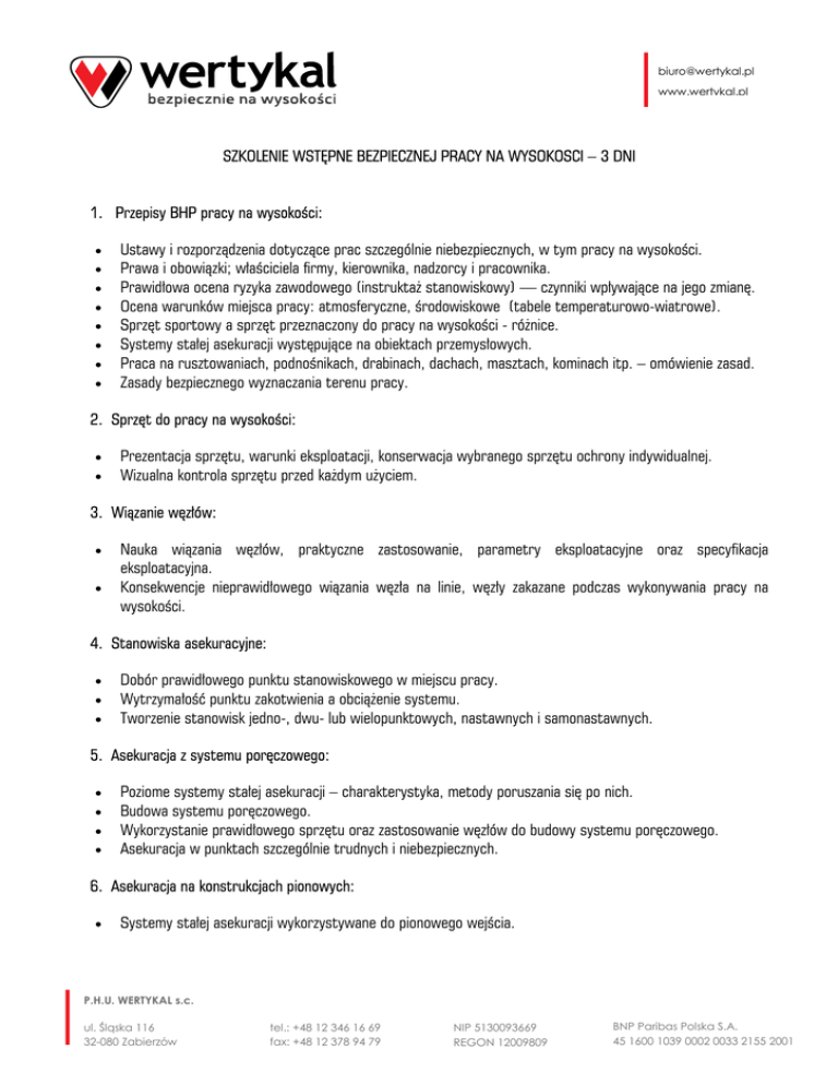 [email protected] www.wertykal.pl SZKOLENIE WSTĘPNE BEZPIECZNEJ PRACY NA WYSOKOSCI – 3 DNI 1. Przepisy BHP pracy na wysokości: • • • • • • • • Ustawy i rozporządzenia dotyczące prac szczególnie niebezpiecznych, w tym pracy na wysokości. Prawa i obowiązki; właściciela firmy, kierownika, nadzorcy i pracownika. Prawidłowa ocena ryzyka zawodowego (instruktaż stanowiskowy) — czynniki wpływające na jego zmianę. Ocena warunków miejsca pracy: atmosferyczne, środowiskowe (tabele temperaturowo-wiatrowe). Sprzęt sportowy a sprzęt przeznaczony do pracy na wysokości - różnice. Systemy stałej asekuracji występujące na obiektach przemysłowych. Praca na rusztowaniach, podnośnikach, drabinach, dachach, masztach, kominach itp. – omówienie zasad. Zasady bezpiecznego wyznaczania terenu pracy. 2. Sprzęt do pracy na wysokości: • • Prezentacja sprzętu, warunki eksploatacji, konserwacja wybranego sprzętu ochrony indywidualnej. Wizualna kontrola sprzętu przed każdym użyciem. 3. Wiązanie węzłów: • • Nauka wiązania węzłów, praktyczne zastosowanie, parametry eksploatacyjne oraz specyfikacja eksploatacyjna. Konsekwencje nieprawidłowego wiązania węzła na linie, węzły zakazane podczas wykonywania pracy na wysokości. 4. Stanowiska asekuracyjne: • • • Dobór prawidłowego punktu stanowiskowego w miejscu pracy. Wytrzymałość punktu zakotwienia a obciążenie systemu. Tworzenie stanowisk jedno-, dwu- lub wielopunktowych, nastawnych i samonastawnych. 5. Asekuracja z systemu poręczowego: • • • • Poziome systemy stałej asekuracji – charakterystyka, metody poruszania się po nich. Budowa systemu poręczowego. Wykorzystanie prawidłowego sprzętu oraz zastosowanie węzłów do budowy systemu poręczowego. Asekuracja w punktach szczególnie trudnych i niebezpiecznych. 6. Asekuracja na konstrukcjach pionowych: • Systemy stałej asekuracji wykorzystywane do pionowego wejścia. P.H.U. WERTYKAL s.c. ul. Śląska 116 32-080 Zabierzów tel.: +48 12 346 16 69 fax: +48 12 378 94 79 NIP 5130093669 REGON 12009809 BNP Paribas Polska S.A. 45 1600 1039 0002 0033 2155 2001 [email protected] www.wertykal.pl • • Umiejętność bezpiecznego poruszania się po drabinie bez istniejącego systemu asekuracji, przepinanie się po konstrukcji. Tworzenie asekuracji własnej na pionowej drabinie i sposobu pracy z niej. 7. Praca w zjeździe: • • • Demonstracja urządzeń i sposobu ich poprawnego wpięcia oraz eksploatacji. Urządzenia w technikach ewakuacyjno-ratunkowych oraz transportowych przy zastosowaniu dodatkowego sprzętu – charakterystyka. Podstawowe zasady bezpiecznej pracy w zjeździe. 8. Systemy transportu pionowego z elementami redukcji sił: • • • Prezentacja sprzętu. Budowanie systemu wyciągowego. Instalacja systemów zintegrowanych do podnoszenia z możliwością opuszczania elementów, z zastosowaniem odpowiedniej redukcji. Systemy odciągowe ładunku zabezpieczające przed uszkodzeniem towaru lub konstrukcji. 9. Podstawowe techniki ewakuacyjno – ratunkowe: • • • Stabilizacja poszkodowanego. Metody ewakuacji poszkodowanych z różnych systemów asekuracji pionowej. Szybkie metody ewakuacji poszkodowanych z systemów linowych. 10. Podstawowe zasady udzielania pierwszej pomocy: Szkolenie oparte jest na Dyrektywach Europejskiej Rady Resuscytacyjnej oraz najnowszych wytycznych dotyczących udzielania pierwszej pomocy. • • • • • • • • • • Urazy głowy, kręgosłupa, miednicy. Krwotoki wewnętrzne i zewnętrzne. Złamania klasyczne i złamania otwarte. Elementy wbite w ciało. Odma płucna — przebicie opłucnej z uszkodzeniem drzewa oskrzelowego. Zadławienia. Udary cieplne, słoneczne i hipotermia. Poparzenia i odmrożenia. Bezpieczne podejście do poszkodowanego, ocena sytuacji, wezwanie pomocy, zasady prowadzenia Resuscytacji Krążeniowo Oddechowej przy użyciu AED. Monitoring poszkodowanego, zapewnienie komfortu psychicznego i termalnego. P.H.U. WERTYKAL s.c. ul. Śląska 116 32-080 Zabierzów tel.: +48 12 346 16 69 fax: +48 12 378 94 79 NIP 5130093669 REGON 12009809 BNP Paribas Polska S.A. 45 1600 1039 0002 0033 2155 2001 [email protected] www.wertykal.pl 11. Podsumowanie nabytych wiadomości– ankieta ewaluacyjna, egzamin sprawdzający: • • Ankieta ewaluacyjna (anonimowa). Egzamin - w formie testu pisemnego z pytaniami o charakterze wielokrotnego wyboru. P.H.U. WERTYKAL s.c. ul. Śląska 116 32-080 Zabierzów tel.: +48 12 346 16 69 fax: +48 12 378 94 79 NIP 5130093669 REGON 12009809 BNP Paribas Polska S.A. 45 1600 1039 0002 0033 2155 2001