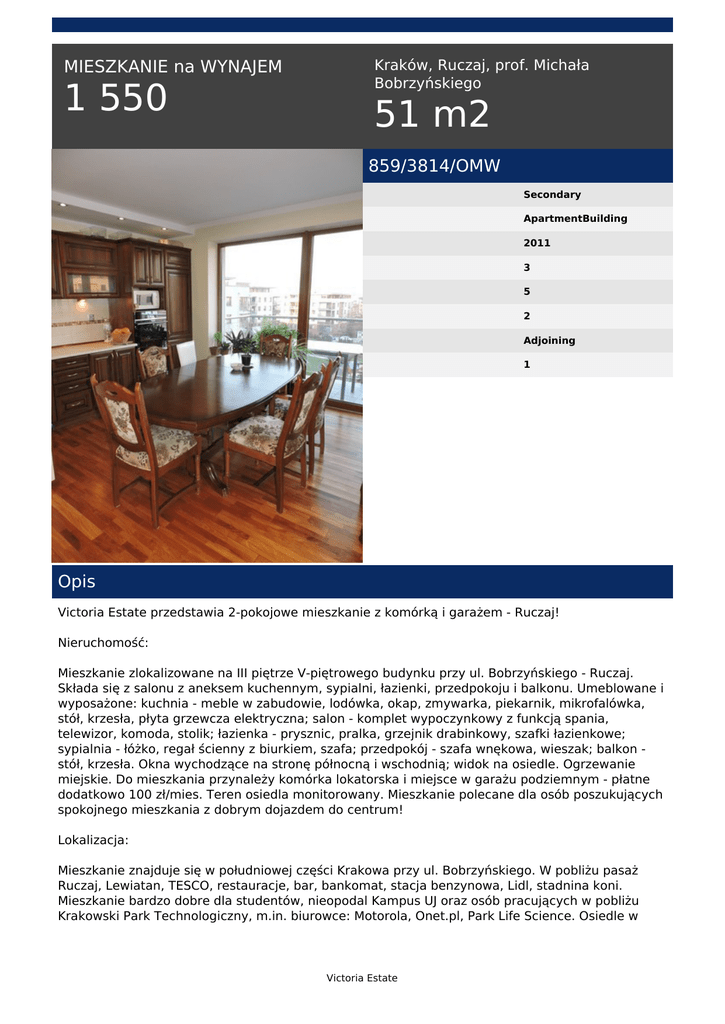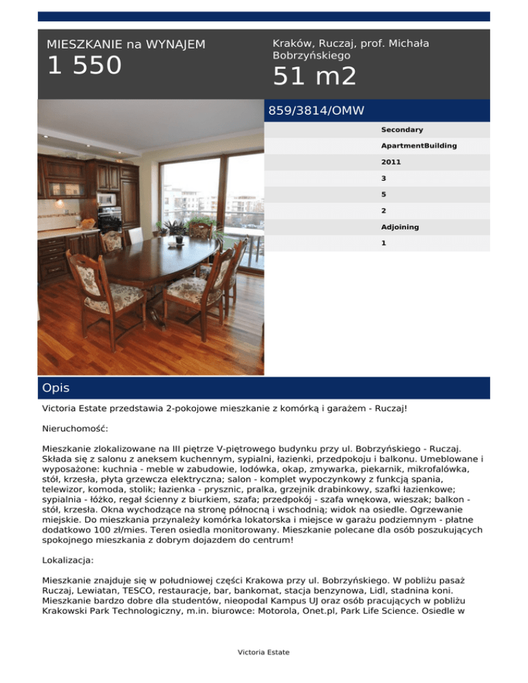 MIESZKANIE na WYNAJEM 1 550 Kraków, Ruczaj, prof. Michała Bobrzyńskiego 51 m2 859/3814/OMW Secondary ApartmentBuilding 2011 3 5 2 Adjoining 1 Opis Victoria Estate przedstawia 2-pokojowe mieszkanie z komórką i garażem - Ruczaj! Nieruchomość: Mieszkanie zlokalizowane na III piętrze V-piętrowego budynku przy ul. Bobrzyńskiego - Ruczaj. Składa się z salonu z aneksem kuchennym, sypialni, łazienki, przedpokoju i balkonu. Umeblowane i wyposażone: kuchnia - meble w zabudowie, lodówka, okap, zmywarka, piekarnik, mikrofalówka, stół, krzesła, płyta grzewcza elektryczna; salon - komplet wypoczynkowy z funkcją spania, telewizor, komoda, stolik; łazienka - prysznic, pralka, grzejnik drabinkowy, szafki łazienkowe; sypialnia - łóżko, regał ścienny z biurkiem, szafa; przedpokój - szafa wnękowa, wieszak; balkon stół, krzesła. Okna wychodzące na stronę północną i wschodnią; widok na osiedle. Ogrzewanie miejskie. Do mieszkania przynależy komórka lokatorska i miejsce w garażu podziemnym - płatne dodatkowo 100 zł/mies. Teren osiedla monitorowany. Mieszkanie polecane dla osób poszukujących spokojnego mieszkania z dobrym dojazdem do centrum! Lokalizacja: Mieszkanie znajduje się w południowej części Krakowa przy ul. Bobrzyńskiego. W pobliżu pasaż Ruczaj, Lewiatan, TESCO, restauracje, bar, bankomat, stacja benzynowa, Lidl, stadnina koni. Mieszkanie bardzo dobre dla studentów, nieopodal Kampus UJ oraz osób pracujących w pobliżu Krakowski Park Technologiczny, m.in. biurowce: Motorola, Onet.pl, Park Life Science. Osiedle w Victoria Estate otoczeniu pięknie zadbanej zieleni, w okolicy dużo terenów rekreacyjnych, spacerowych - Skałki Twardowskiego, Zakrzówek. Bardzo dobre połączenie komunikacyjne z centrum miasta, do Rynku Głównego 7 km, możliwość dojazdu bezpośrednim tramwajem. W pobliżu przystanek MPK "Chmieleniec" - 3 min Komunikacja: "Chmieleniec" 11, 18, 23, 52, 194, 62A Opłaty: 1550 zł + 450 zł czynsz + prąd Serdecznie polecam! Małgorzata Wicha tel. +48 511 560 721 email: [email protected] Victoria Estate Powered by TCPDF (www.tcpdf.org)