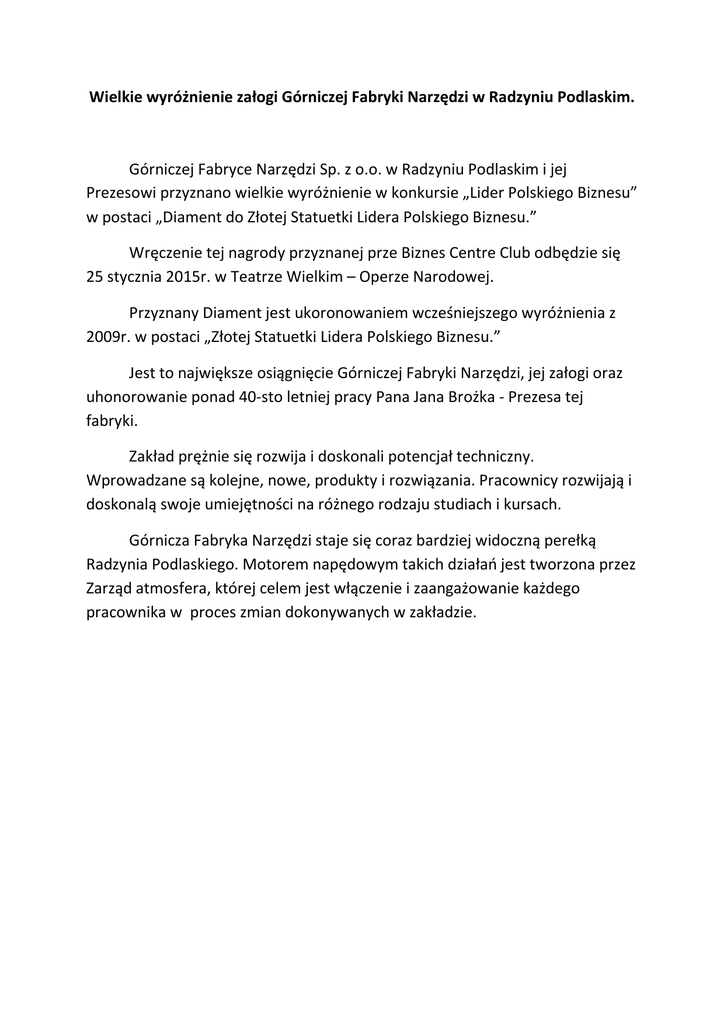 Wielkie wyróżnienie załogi Górniczej Fabryki Narzędzi w Radzyniu Podlaskim. Górniczej Fabryce Narzędzi Sp. z o.o. w Radzyniu Podlaskim i jej Prezesowi przyznano wielkie wyróżnienie w konkursie „Lider Polskiego Biznesu” w postaci „Diament do Złotej Statuetki Lidera Polskiego Biznesu.” Wręczenie tej nagrody przyznanej prze Biznes Centre Club odbędzie się 25 stycznia 2015r. w Teatrze Wielkim – Operze Narodowej. Przyznany Diament jest ukoronowaniem wcześniejszego wyróżnienia z 2009r. w postaci „Złotej Statuetki Lidera Polskiego Biznesu.” Jest to największe osiągnięcie Górniczej Fabryki Narzędzi, jej załogi oraz uhonorowanie ponad 40-sto letniej pracy Pana Jana Brożka - Prezesa tej fabryki. Zakład prężnie się rozwija i doskonali potencjał techniczny. Wprowadzane są kolejne, nowe, produkty i rozwiązania. Pracownicy rozwijają i doskonalą swoje umiejętności na różnego rodzaju studiach i kursach. Górnicza Fabryka Narzędzi staje się coraz bardziej widoczną perełką Radzynia Podlaskiego. Motorem napędowym takich działań jest tworzona przez Zarząd atmosfera, której celem jest włączenie i zaangażowanie każdego pracownika w proces zmian dokonywanych w zakładzie.