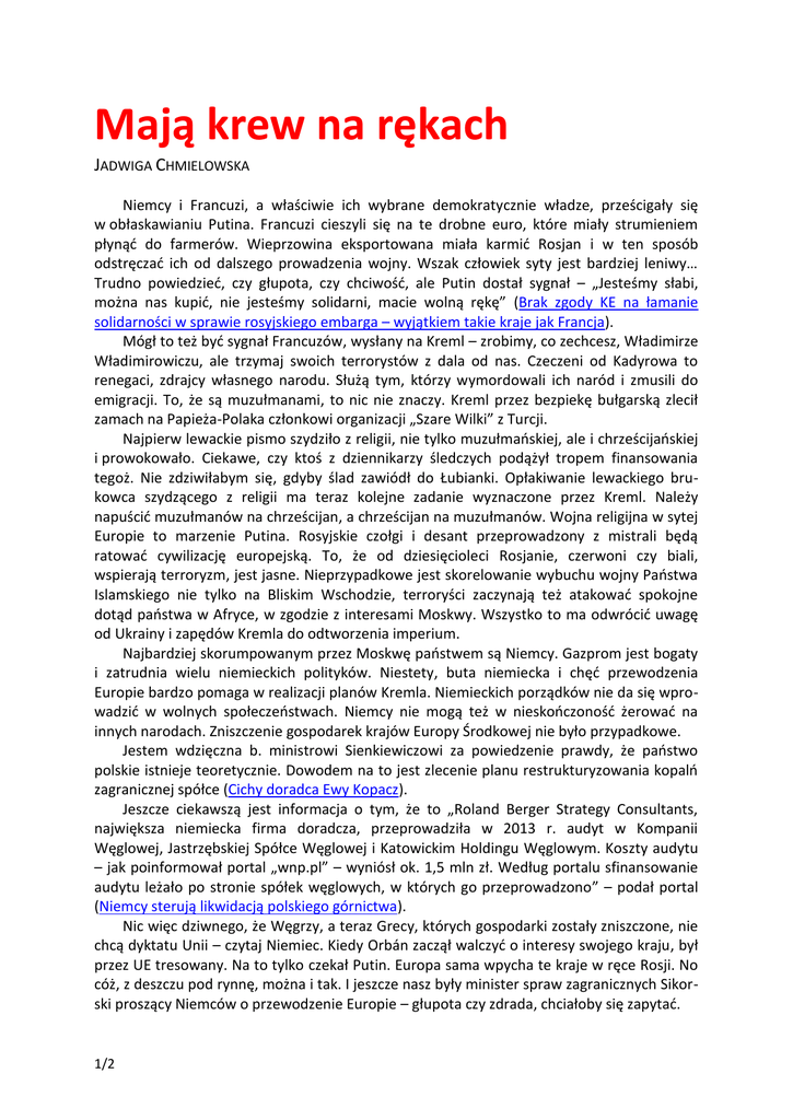 Mają krew na rękach JADWIGA CHMIELOWSKA Niemcy i Francuzi, a właściwie ich wybrane demokratycznie władze, prześcigały się w obłaskawianiu Putina. Francuzi cieszyli się na te drobne euro, które miały strumieniem płynąć do farmerów. Wieprzowina eksportowana miała karmić Rosjan i w ten sposób odstręczać ich od dalszego prowadzenia wojny. Wszak człowiek syty jest bardziej leniwy… Trudno powiedzieć, czy głupota, czy chciwość, ale Putin dostał sygnał – „Jesteśmy słabi, można nas kupić, nie jesteśmy solidarni, macie wolną rękę” (Brak zgody KE na łamanie solidarności w sprawie rosyjskiego embarga – wyjątkiem takie kraje jak Francja). Mógł to też być sygnał Francuzów, wysłany na Kreml – zrobimy, co zechcesz, Władimirze Władimirowiczu, ale trzymaj swoich terrorystów z dala od nas. Czeczeni od Kadyrowa to renegaci, zdrajcy własnego narodu. Służą tym, którzy wymordowali ich naród i zmusili do emigracji. To, że są muzułmanami, to nic nie znaczy. Kreml przez bezpiekę bułgarską zlecił zamach na Papieża-Polaka członkowi organizacji „Szare Wilki” z Turcji. Najpierw lewackie pismo szydziło z religii, nie tylko muzułmańskiej, ale i chrześcijańskiej i prowokowało. Ciekawe, czy ktoś z dziennikarzy śledczych podążył tropem finansowania tegoż. Nie zdziwiłabym się, gdyby ślad zawiódł do Łubianki. Opłakiwanie lewackiego brukowca szydzącego z religii ma teraz kolejne zadanie wyznaczone przez Kreml. Należy napuścić muzułmanów na chrześcijan, a chrześcijan na muzułmanów. Wojna religijna w sytej Europie to marzenie Putina. Rosyjskie czołgi i desant przeprowadzony z mistrali będą ratować cywilizację europejską. To, że od dziesięcioleci Rosjanie, czerwoni czy biali, wspierają terroryzm, jest jasne. Nieprzypadkowe jest skorelowanie wybuchu wojny Państwa Islamskiego nie tylko na Bliskim Wschodzie, terroryści zaczynają też atakować spokojne dotąd państwa w Afryce, w zgodzie z interesami Moskwy. Wszystko to ma odwrócić uwagę od Ukrainy i zapędów Kremla do odtworzenia imperium. Najbardziej skorumpowanym przez Moskwę państwem są Niemcy. Gazprom jest bogaty i zatrudnia wielu niemieckich polityków. Niestety, buta niemiecka i chęć przewodzenia Europie bardzo pomaga w realizacji planów Kremla. Niemieckich porządków nie da się wprowadzić w wolnych społeczeństwach. Niemcy nie mogą też w nieskończoność żerować na innych narodach. Zniszczenie gospodarek krajów Europy Środkowej nie było przypadkowe. Jestem wdzięczna b. ministrowi Sienkiewiczowi za powiedzenie prawdy, że państwo polskie istnieje teoretycznie. Dowodem na to jest zlecenie planu restrukturyzowania kopalń zagranicznej spółce (Cichy doradca Ewy Kopacz). Jeszcze ciekawszą jest informacja o tym, że to „Roland Berger Strategy Consultants, największa niemiecka firma doradcza, przeprowadziła w 2013 r. audyt w Kompanii Węglowej, Jastrzębskiej Spółce Węglowej i Katowickim Holdingu Węglowym. Koszty audytu – jak poinformował portal „wnp.pl” – wyniósł ok. 1,5 mln zł. Według portalu sfinansowanie audytu leżało po stronie spółek węglowych, w których go przeprowadzono” – podał portal (Niemcy sterują likwidacją polskiego górnictwa). Nic więc dziwnego, że Węgrzy, a teraz Grecy, których gospodarki zostały zniszczone, nie chcą dyktatu Unii – czytaj Niemiec. Kiedy Orbán zaczął walczyć o interesy swojego kraju, był przez UE tresowany. Na to tylko czekał Putin. Europa sama wpycha te kraje w ręce Rosji. No cóż, z deszczu pod rynnę, można i tak. I jeszcze nasz były minister spraw zagranicznych Sikorski proszący Niemców o przewodzenie Europie – głupota czy zdrada, chciałoby się zapytać. 1/2 No cóż, Putin byłby głupi, gdyby nie skorzystał z tylu zachęt do kontynuowania wojny na Ukrainie. Nie wiem tylko, czy narody, które pozwalają sobą rządzić miernotom i zdrajcom, wiedzą, że to one ponoszą odpowiedzialność. Za zbrodnie Hitlera przez długie lata Niemcy źle się kojarzyli w całym świecie. Czy teraz narody Europy zdają sobie sprawę z tego, że są współwinne zbrodniom dokonywanych przez rosyjskich sołdatów na Ukrainie? Ciekawe, czy też zdają sobie sprawę z tego, że zachęcają do kolejnych zamachów terrorystycznych? Rosja cofa się jedynie przed siłą i zdecydowaniem. 2/2