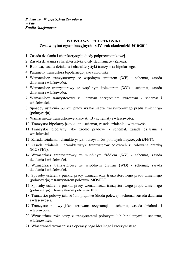 Państwowa WyŜsza Szkoła Zawodowa w Pile Studia Stacjonarne PODSTAWY ELEKTRONIKI Zestaw pytań egzaminacyjnych - s.IV- rok akademicki 2010/2011 1. 2. 3. 4. 5. Zasada działania i charakterystyka diody półprzewodnikowej. Zasada działania i charakterystyka diody stabilizującej (Zenera). Budowa, zasada działania i charakterystyki tranzystora bipolarnego. Parametry tranzystora bipolarnego jako czwórnika. Wzmacniacz tranzystorowy ze wspólnym emiterem (WE) - schemat, zasada działania i właściwości. 6. Wzmacniacz tranzystorowy ze wspólnym kolektorem (WC) - schemat, zasada działania i właściwości. 7. Wzmacniacz tranzystorowy z ujemnym sprzęŜeniem zwrotnym - schemat i właściwości. 8. Sposoby ustalenia punktu pracy wzmacniacza tranzystorowego prądu zmiennego (polaryzacja). 9. Wzmacniacze tranzystorowe klasy A i B - schematy i właściwości. 10. Tranzystor bipolarny jako klucz - schemat, zasada działania i właściwości. 11. Tranzystor bipolarny jako źródło prądowe - schemat, zasada działania i właściwości. 12. Zasada działania i charakterystyki tranzystorów polowych złączowych (JFET). 13. Zasada działania i charakterystyki tranzystorów polowych z izolowaną bramką (MOSFET). 14. Wzmacniacz tranzystorowy ze wspólnym źródłem (WŹ) - schemat, zasada działania i właściwości. 15. Wzmacniacz tranzystorowy ze wspólnym drenem (WD) - schemat, zasada działania i właściwości. 16. Sposoby ustalenia punktu pracy wzmacniacza tranzystorowego prądu zmiennego (polaryzacja) z tranzystorem polowym MOSFET. 17. Sposoby ustalenia punktu pracy wzmacniacza tranzystorowego prądu zmiennego (polaryzacja) z tranzystorem polowym JFET. 18. Tranzystor polowy jako źródło prądowe (dioda polowa) - schemat, zasada działania i właściwości. 19. Tranzystor polowy jako sterowana rezystancja - schemat, zasada działania i właściwości. 20. Wzmacniacz róŜnicowy z tranzystorami polowymi lub bipolarnymi – schemat, właściowości. 21. Właściwości wzmacniacza operacyjnego idealnego i rzeczywistego. 22. Układy wzmacniacza operacyjnego odwracającego fazę - schematy, równania, regulacja wzmocnienia. 23. Układy wzmacniacza operacyjnego nieodwracającego fazę - schematy, równania, regulacja wzmocnienia. 24. Układ wzmacniacza operacyjnego realizującego sumowanie sygnałów - schemat, równani, opis działania. 25. Układ wzmacniacza operacyjnego realizującego całkowanie sygnału - schemat, równanie, opis działania. 26. Układ wzmacniacza operacyjnego realizującego róŜniczkowanie sygnału schemat, równanie, opis działania. 27. Ograniczenie sygnału wyjściowego wzmacniacza za pomocą diod i diod Zenera schematy, wykres charakterystyki statycznej, opis działania. 28. Generatory funkcji nieliniowej – układu ze wzmacniaczem operacyjnym dla aproksymacji charaktertyki nieliniowej linią łamaną. 29. Komparator sygnałów - schemat, zasada działania, charakterystyka. 30. Układ logarytmujący sygnał wejściowy - schemat, zasada działania. 31. Fotodioda - budowa, zasada działania i charakterystyki. 32. Fototranzystor - schemat, budowa, zasada działania i charakterystyki. 33. Diody elektroluminescencyjne - budowa i zasada działania. 34. Transoptor - schemat i zasada działania. 35. Schemat i charakterystyka bramek logicznych DTL. 36. Schemat i charakterystyka bramek logicznych TTL. 37. Schemat i charakterystyka bramek logicznych w technologii MOS.