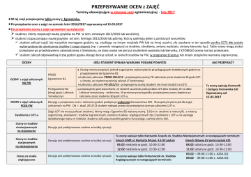 PRZEPISYWANIE OCEN z ZAJĘĆ Terminy obowiązujące w zimowej sesji egzaminacyjnej - luty 2017 W tej sesji przepisujemy tylko oceny z Egzaminów. Po przepisanie ocen z zajęć na semestr letni 2016/2017 zapraszamy od 15.03.2017 Do przepisania oceny z zajęć uprawnieni są wyłącznie: studenci, którzy rozpoczęli naukę języków na PW w sem. zimowym 2015/2016 lub wcześniej, studenci rozpoczynający naukę języków od sem. letniego 2015/2016 lub później, którzy spełniają jeden z poniższych warunków: student zaliczył część lub wszystkie wymagane godziny np. studiując na innym wydziale PW lub na innej uczelni, ale uzyskane w ten sposób punkty ECTS nie zostały wykorzystane do ukończenia studiów I-szego stopnia (np. z powodu rezygnacji ze studiów, skreślenia, zmiany wydziału, zmiany kierunku itp.). Takie oceny mogą zostać przepisane po przedstawieniu zaświadczenia z Dziekanatu, że dana osoba nie jest już studentem wydziału lub kierunku, Z KTÓREGO ocena ma być przepisana. student zaliczył odpowiednią liczbę godzin języka obcego biorąc udział, w ramach studiów na PW, w programie Erasmus lub innym programie wymiany zagranicznej. OCENY OCENY z zajęć zaliczonych NA PW JEŚLI STUDENT SPEŁNIA WARUNKI PODANE POWYŻEJ PRZED Egzaminem B2 PO Egzaminie B2 (drugi język, Lektorat Tematyczny) OCENY z zajęć zaliczonych POZA PW JAK PRZEPISAĆ? Ocenę można przepisać, jednak sugerujemy wykorzystanie przysługujących dodatkowych godzin na przygotowanie do Egzaminu B2. Lektoraty zaliczone PRZED 2012/13 - przepisujemy ocenę PO zaliczeniu przez studenta 30 godz LOTu (chyba, że student wcześniej zaliczył LT techniczny) Lektoraty zaliczone PO 2012/13 - przepisujemy ocenę (student nie musi chodzić na LOT) przepisujemy pod warunkiem, że student wcześniej zaliczył albo LOT albo moduły 10-12 albo Lektorat tematyczny - techniczny. W przeciwnym przypadku przepisujemy oceny dopiero po zaliczeniu przez studenta 30 godz LOT-u. Zajęć LOT nie muszą zaliczać studenci, którzy mają z Egzaminu B2 wpisaną ocenę 5,0 (m.in. studenci z maturą IB, z maturą zagraniczną, absolwenci studiów zagranicznych, studenci studiów anglojęzycznych itp.) Zwolnienie z LOT-u nie wymaga dodatkowego wpisu w indeksie. Studenci zaliczają wszystkie godziny korzystając z pełnej oferty SJO. Oceny ze studiów niestacjonarnych na stacjonarne Decyzja jest podejmowana osobno w każdej sytuacji. Oceny na studia anglojęzyczne Zapraszamy od 15.03.2017 Decyzję o przepisaniu ocen i zaliczeniu godzin podejmuje wyłącznie Kierownictwo SJO. Stosujemy kryteria jak dla zajęć zaliczonych na PW. Od r. akad. 2012/13 student nabywa prawo do przepisania ocen po zaliczeniu LOT-u. Zwolnienie z LOT-u Oceny ze studiów stacjonarnych na niestacjonarne Te oceny wpisują Kierownik i Zastępcy Kierownika SJO Decyzja jest podejmowana osobno w każdej sytuacji. Te oceny wpisuje tylko Kierownik Zespołu ds. Studiów Niestacjonarnych w następujących terminach: Gmach SiMR ul. Narbutta 84 pok. 4.6 (IV piętro) Gmach Główny (IV pietro) pokój 425 05.02 niedziela w godz. 10:30-12:00 12.02 niedziela w godz. 10:30-12:00 Decyzja jest podejmowana osobno w każdej sytuacji. Te oceny wpisuje tylko Pełnomocnik ds. Studiów Anglojęzycznych w następujących terminach: 04.02 sobota w godz. 10:30-12:00 11.02 sobota w godz. 10:30-12:00 03.02 – 09:00-11:00 s. 426A GG 09.02 - 09:00-11:00 s. 426A GG