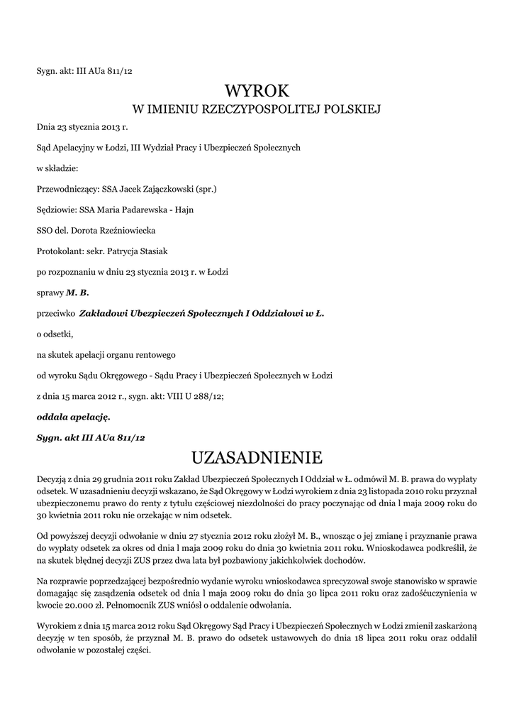 Sygn. akt: III AUa 811/12 WYROK W IMIENIU RZECZYPOSPOLITEJ POLSKIEJ Dnia 23 stycznia 2013 r. Sąd Apelacyjny w Łodzi, III Wydział Pracy i Ubezpieczeń Społecznych w składzie: Przewodniczący: SSA Jacek Zajączkowski (spr.) Sędziowie: SSA Maria Padarewska - Hajn SSO del. Dorota Rzeźniowiecka Protokolant: sekr. Patrycja Stasiak po rozpoznaniu w dniu 23 stycznia 2013 r. w Łodzi sprawy M. B. przeciwko Zakładowi Ubezpieczeń Społecznych I Oddziałowi w Ł. o odsetki, na skutek apelacji organu rentowego od wyroku Sądu Okręgowego - Sądu Pracy i Ubezpieczeń Społecznych w Łodzi z dnia 15 marca 2012 r., sygn. akt: VIII U 288/12; oddala apelację. Sygn. akt III AUa 811/12 UZASADNIENIE Decyzją z dnia 29 grudnia 2011 roku Zakład Ubezpieczeń Społecznych I Oddział w Ł. odmówił M. B. prawa do wypłaty odsetek. W uzasadnieniu decyzji wskazano, że Sąd Okręgowy w Łodzi wyrokiem z dnia 23 listopada 2010 roku przyznał ubezpieczonemu prawo do renty z tytułu częściowej niezdolności do pracy poczynając od dnia l maja 2009 roku do 30 kwietnia 2011 roku nie orzekając w nim odsetek. Od powyższej decyzji odwołanie w dniu 27 stycznia 2012 roku złożył M. B., wnosząc o jej zmianę i przyznanie prawa do wypłaty odsetek za okres od dnia l maja 2009 roku do dnia 30 kwietnia 2011 roku. Wnioskodawca podkreślił, że na skutek błędnej decyzji ZUS przez dwa lata był pozbawiony jakichkolwiek dochodów. Na rozprawie poprzedzającej bezpośrednio wydanie wyroku wnioskodawca sprecyzował swoje stanowisko w sprawie domagając się zasądzenia odsetek od dnia l maja 2009 roku do dnia 30 lipca 2011 roku oraz zadośćuczynienia w kwocie 20.000 zł. Pełnomocnik ZUS wniósł o oddalenie odwołania. Wyrokiem z dnia 15 marca 2012 roku Sąd Okręgowy Sąd Pracy i Ubezpieczeń Społecznych w Łodzi zmienił zaskarżoną decyzję w ten sposób, że przyznał M. B. prawo do odsetek ustawowych do dnia 18 lipca 2011 roku oraz oddalił odwołanie w pozostałej części. Powyższe rozstrzygnięcie Sądu pierwszej instancji zapadło na tle następującego stanu faktycznego. Wnioskodawca M. B. posiada wykształcenie podstawowe, z zawodu jest szewcem. Początkowo pracował na budowie jako zbrojarz, następnie w teatrze jako maszynista sceny oraz introligator przemysłowy krajacz. Potem przez okres 16 lat do 2004 roku jako szewc. Od 2004 roku nie pracuje. W okresie od dnia 7 marca 2004 roku do 30 kwietnia 2009 roku ubezpieczony pobierał rentę z tytułu częściowej niezdolności do pracy. Z ponownym wnioskiem o rentę z tytułu niezdolności do pracy ubezpieczony wystąpił w dniu 31 marca 2009 roku. Zarówno Lekarz Orzecznik ZUS orzeczeniem z dnia 8 maja 2009 roku jak i Komisja Lekarska orzeczeniem z dnia 9 czerwca 2009 roku nie stwierdzili niezdolności do pracy. Decyzją z dnia 22 czerwca 2009 roku Zakład Ubezpieczeń Społecznych I Oddział w Ł. odmówił M. B. prawa do renty z tytułu niezdolności do pracy w oparciu o orzeczenie Komisji Lekarskiej z dnia 9 czerwca 2009 roku, nie stwierdzające u wnioskodawcy niezdolności do pracy. Wyrokiem z dnia 23 listopada 2010 roku Sąd Okręgowy w Łodzi - Sąd Pracy i Ubezpieczeń Społecznych w sprawie o sygn. VIII U 1656/09, na skutek odwołania ubezpieczonego, zmienił decyzję ZUS z dnia 22 czerwca 2009 roku i przyznał prawo do renty z tytułu częściowej niezdolności do pracy od dnia l maja 2009 roku do dnia 30 kwietnia 2011 roku. Apelacja organu rentowego od wyroku Sądu Okręgowego z dnia 23 listopada 2010 roku została oddalona wyrokiem Sądu Apelacyjnego w Łodzi z dnia 8 lipca 2011 roku w sprawie o sygn. akt III AUa 150/11. Decyzją z dnia 18 lipca 2011 roku ZUS, wykonując prawomocny wyrok Sądu Okręgowego z dnia 23 listopada 2010 roku, przyznał wnioskodawcy prawo do renty z tytułu częściowej niezdolności do pracy od dnia l maja 2009 roku do 31 maja 2013 roku. Decyzją tą przyznano wyrównanie renty za okres od 01.05.2009 roku do 31.03.2011 roku w łącznej kwocie 17184,27 zł wraz ze świadczeniem za sierpień w kwocie 802,01 zł. Po odliczeniu zaliczki na podatek i składki na ubezpieczenie zdrowotne organ rentowy za pośrednictwem poczty przekazał kwotę 14570,51 zł. We wniosku z dnia 29 listopada 2011 roku M. B. w związku z przyznaniem prawa do renty z tytułu częściowej niezdolności do pracy wniósł o wypłatę odsetek od przedmiotowego świadczenia za okres około 2,5 roku. W tak ustalonym stanie faktycznym Sąd Okręgowy uznał odwołanie wnioskodawcy za zasadne w części dotyczącej żądania odsetek z tytułu opóźnienia w wypłacie świadczenia rentowego na podstawie art. 85 ust. 1 ustawy z dnia 13 października 1998 roku o systemie ubezpieczeń społecznych (tekst jednolity: Dz. U. z 2009 roku Nr 205, poz. 1585, ze zmianami) oraz art. 118 ust. 1 ustawy z dnia 17 grudnia 1998 roku o emeryturach i rentach z Funduszu Ubezpieczeń Społecznych (tekst jednolity: Dz. U. z 2009 roku Nr 153, poz. 1227, ze zmianami). Sąd pierwszej instancji powołując się na orzecznictwo Sądu Najwyższego, jak również wyrok Trybunału Konstytucyjnego z dnia 11 września 2007 roku, uznał, że opóźnienie w spełnieniu świadczenia rentowego nastąpiło na skutek błędnego orzeczenia Lekarza Orzecznika ZUS oraz Komisji Lekarskiej ZUS. Nadto Sąd Okręgowy uznał, że wbrew twierdzeniom organu rentowego fakt, że zarówno Sąd Okręgowy, jak i Sąd Apelacyjny w swych rozstrzygnięciach nie orzekły o odpowiedzialności Zakładu Ubezpieczeń Społecznych w postaci nakazania wypłaty odsetek, nie pozbawia M. B. prawa do tego świadczenia ubocznego. W tym stanie rzeczy Sąd Okręgowy w Łodzi, działając na podstawie art. 47714 § 2 k.p.c. w punkcie pierwszym wyroku zmienił zaskarżoną decyzję i przyznał ubezpieczonemu prawo do odsetek ustawowych z tytułu opóźnienia w wypłacie świadczenia rentowego od dnia 18 lipca 2011 roku. W pozostałej części, w jakiej wnioskodawca wniósł o wypłatę odsetek od daty 30 lipca 2011 roku