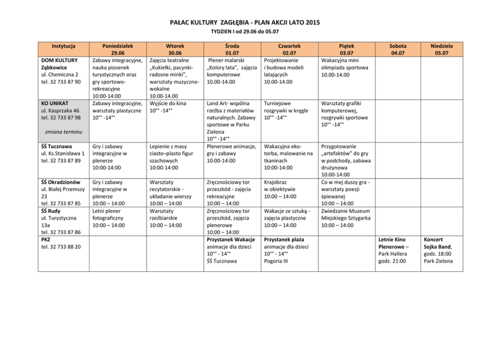 PAŁAC KULTURY ZAGŁĘBIA - PLAN AKCJI LATO 2015 TYDZIEN I od 29.06 do 05.07 Instytucja Poniedziałek 29.06 Zabawy integracyjne, nauka piosenek turystycznych oraz gry sportoworekreacyjne 10:00-14:00 Zabawy integracyjne, warsztaty plastyczne 10°° -14°° Wtorek 30.06 Zajęcia teatralne „Kukiełki, pacynkiradosne minki”, warsztaty muzycznowokalne 10.00-14.00 Wyjście do kina 10°° -14°° ŚŚ Tucznawa ul. Ks.Stanisława 1 tel. 32 733 87 89 Gry i zabawy integracyjne w plenerze 10:00-14:00 Lepienie z masy ciasto–plasto figur szachowych 10:00-14:00 ŚŚ Okradzionów ul. Białej Przemszy 23 tel. 32 733 87 85 ŚŚ Rudy ul. Turystyczna 13a tel. 32 733 87 86 PKZ tel. 32 733 88 20 Gry i zabawy integracyjne w plenerze 10:00 – 14:00 Letni plener fotograficzny 10:00 – 14:00 Warsztaty recytatorskie układanie wierszy 10:00 – 14:00 Warsztaty rzeźbiarskie 10:00 – 14:00 DOM KULTURY Ząbkowice ul. Chemiczna 2 tel. 32 733 87 90 KO UNIKAT ul. Kasprzaka 46 tel. 32 733 87 98 zmiana terminu Środa 01.07 Plener malarski „Kolory lata”, zajęcia komputerowe 10.00-14.00 Czwartek 02.07 Projektowanie i budowa modeli latających 10.00-14.00 Piątek 03.07 Wakacyjna mini olimpiada sportowa 10.00-14.00 Land Art- wspólna rzeźba z materiałów naturalnych. Zabawy sportowe w Parku Zielona 10°° -14°° Plenerowe animacje, gry i zabawy 10:00-14:00 Turniejowe rozgrywki w kręgle 10°° -14°° Warsztaty grafiki komputerowej, rozgrywki sportowe 10°° -14°° Wakacyjna ekotorba, malowanie na tkaninach 10:00-14:00 Zręcznościowy tor przeszkód - zajęcia rekreacyjne 10:00 – 14:00 Zręcznościowy tor przeszkód, zajęcia plenerowe 10:00 – 14:00 Przystanek Wakacje animacje dla dzieci 10°° - 14°° ŚŚ Tucznawa Krajobraz w obiektywie 10:00 – 14:00 Przygotowanie „artefaktów” do gry w podchody, zabawa drużynowa 10:00-14:00 Co w mej duszy gra warsztaty poezji śpiewanej 10:00 – 14:00 Zwiedzanie Muzeum Miejskiego Sztygarka 10:00 – 14:00 Wakacje ze sztuką zajęcia plastyczne 10:00 – 14:00 Przystanek plaża animacje dla dzieci 10°° - 14°° Pogoria III Sobota 04.07 Letnie Kino Plenerowe – Park Hallera godz. 21:00 Niedziela 05.07 Koncert Sojka Band, godz. 18:00 Park Zielona TYDZIEN II od 06.07 do 12.07 Instytucja Poniedziałek 06.07 Warsztaty plastyczne – rzeźba z natury oraz warsztaty szachowe 10°° -14°° Warsztaty rysunkowe „Piórkiem i węglem”, gry oraz zabawy logiczne 10:00-14:00 Wtorek 07.07 Gry i zabawy plenerowe, wyjazd do kina 10°° -14°° ŚŚ Tucznawa ul. Ks.Stanisława 1 Wycieczka do Siewierza 10:00-14:00 Wycieczka autokarowa do Rabki Zdrój ŚŚ Okradzionów ul. Białej Przemszy 23 Zajęcia plastyczne malowanie na szkle 10:00 – 14:00 Plenerowe animacje, gry i zabawy 10:00 – 14:00 ŚŚ Rudy ul. Turystyczna 13a Poznajemy prace leśniczego, spotkanie z leśniczym naszego okręgu 10:00 – 14:00 Warsztaty plastyczne -kredą po asfalcie, origami, rysunek, ceramika 10:00 – 14:00 Plenerowe animacje, gry i zabawy 10:00 – 14:00 KO UNIKAT ul. Kasprzaka 46 DOM KULTURY Ząbkowice ul. Chemiczna 2 ŚŚ Kuźniczka Nowa tel. 32 733 87 82 PKZ tel. 32 733 88 20 Zajęcia sportoworekreacyjne, gimnastyczne interpretacje utworów muzycznych 10.00-14.00 Środa 08.07 Zajęcia filmowo – kabaretowe pn. „Najmniejszy cyrk świata” 10°° -14°° Zajęcia taneczne – elementy aerobiku, fitness i gimnastyki artystycznej, zajęcia literacko – dziennikarskie „Fotki maskotki” 10.00-14.00 Dzień muzyczny polskie tańce ludowe 10:00-14:00 Wycieczka do Krakowa zwiedzanie miasta Szlakiem Noblistów Wycieczka do Krakowa zwiedzanie miasta Szlakiem Noblistów Wyjazd do NEMO 10:00 – 14:00 Wycieczka do Krakowa – zwiedzanie miasta Szlakiem Noblistów Przystanek Wakacje animacje dla dzieci 10°° - 14°° ŚŚ Okradzionów Przystanek plaża animacje dla dzieci 10°° - 14°° Pogoria III Czwartek 09.07 Zajęcia rekreacyjne w kręgielni 10°° -14°° Piątek 10.07 Wycieczka autokarowa 9°° - 15°° Wycieczka autokarowa do „Osikowej Doliny” w Koziegłowach 9.00-16.00 Wioska piracka – wykorzystanie materiałów recyklingowych, oraz ognisko z pieczeniem kiełbasek 10.00-14.00 Eko-przytulaki, szycie misiów, lalek, gąsienic i innych pluszaków 10:00-14:00 Dzień Odkrywcy zajęcia w plenerze 10:00 – 14:00 Podsumowanie akcji, gry i zabawy sportowe 10:00-14:00 Wycieczka pod Pomnik Nullo w Krzykawie 10:00 – 14:00 Wakacyjny pamiętnik-zajęcia w plenerze 10:00 – 14:00 Zwiedzanie Muzeum w Będzinie 10:00 – 14:00 Wycieczka piesza szlakiem ,,Szwajcarii Zagłębiowskiej” 10:00 – 14:00 Sobota 11.07 Niedziela 12.07 Turniej tenisa stołowego 10:00 – 14:00 Letnie Kino Plenerowe – Park Hallera godz. 21:00 Koncert Sojka Band, godz. 18:00 Park Zielona TYDZIEN III od 13.07 do 19.07 Instytucja ŚŚ Kuźniczka Nowa ŚŚ Łosień ul. Przedziałowa 1 tel. 32 733 87 84 Poniedziałek 13.07 Zwiedzanie sztolni i wystawy w MM Sztygarka 10:00 – 14:00 Wtorek 14.07 Plenerowe animacje, gry i zabawy 10:00 – 14:00 Środa 15.07 Zajęcia sportowo rekreacyjne w Nemo 10:00 – 14:00 Czwartek 16.07 Zajęcia rekreacyjne w Kręgielni 10:00 – 14:00 Gry i zabawy integracyjne, mini kalambury 10:00-14:00 Warsztaty manualne – robimy breloczki 10:00-14:00 Warsztaty plastyczne 10:00-14:00 Rozgrywki tenisa stołowego, warcaby i gry planszowe 10:00-14:00 Przystanek Wakacje animacje dla dzieci 10°° - 14°° ŚŚ Kuźniczka Nowa Przystanek plaża animacje dla dzieci 10°° - 14°° Pogoria III PKZ tel. 32 733 88 20 Piątek 17.07 Okrywamy własne talenty :warsztaty wokalne, taneczne, plastyczne 10:00 – 14:00 Warsztaty - filcowe maskotki 10:00-14:00 Sobota 18.07 Letnie Kino Plenerowe – Park Hallera godz. 21:00 Niedziela 19.07 Koncert Sojka Band, godz. 18:00 Park Zielona TYDZIEN IV od 20.07 do 26.07 Instytucja KO KRĄG ul. Ludowa 19 tel. 32 733 87 96 zmiana terminu ŚŚ Łosień ul. Przedziałowa 1 Poniedziałek 20.07 Gry i zabawy integracyjne 10°° - 14°° Rzeźbimy z masy solnej. Gry i zabawy 
