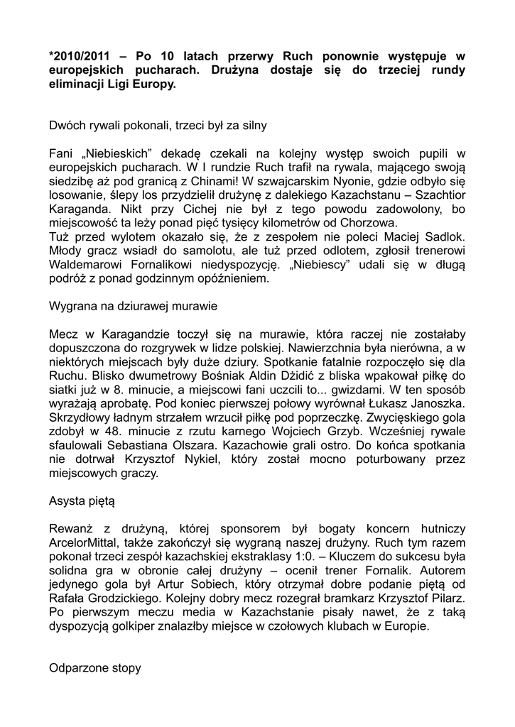 *2010/2011 – Po 10 latach przerwy Ruch ponownie występuje w europejskich pucharach. Drużyna dostaje się do trzeciej rundy eliminacji Ligi Europy. Dwóch rywali pokonali, trzeci był za silny Fani „Niebieskich” dekadę czekali na kolejny występ swoich pupili w europejskich pucharach. W I rundzie Ruch trafił na rywala, mającego swoją siedzibę aż pod granicą z Chinami! W szwajcarskim Nyonie, gdzie odbyło się losowanie, ślepy los przydzielił drużynę z dalekiego Kazachstanu – Szachtior Karaganda. Nikt przy Cichej nie był z tego powodu zadowolony, bo miejscowość ta leży ponad pięć tysięcy kilometrów od Chorzowa. Tuż przed wylotem okazało się, że z zespołem nie poleci Maciej Sadlok. Młody gracz wsiadł do samolotu, ale tuż przed odlotem, zgłosił trenerowi Waldemarowi Fornalikowi niedyspozycję. „Niebiescy” udali się w długą podróż z ponad godzinnym opóźnieniem. Wygrana na dziurawej murawie Mecz w Karagandzie toczył się na murawie, która raczej nie zostałaby dopuszczona do rozgrywek w lidze polskiej. Nawierzchnia była nierówna, a w niektórych miejscach były duże dziury. Spotkanie fatalnie rozpoczęło się dla Ruchu. Blisko dwumetrowy Bośniak Aldin Dżidić z bliska wpakował piłkę do siatki już w 8. minucie, a miejscowi fani uczcili to... gwizdami. W ten sposób wyrażają aprobatę. Pod koniec pierwszej połowy wyrównał Łukasz Janoszka. Skrzydłowy ładnym strzałem wrzucił piłkę pod poprzeczkę. Zwycięskiego gola zdobył w 48. minucie z rzutu karnego Wojciech Grzyb. Wcześniej rywale sfaulowali Sebastiana Olszara. Kazachowie grali ostro. Do końca spotkania nie dotrwał Krzysztof Nykiel, który został mocno poturbowany przez miejscowych graczy. Asysta piętą Rewanż z drużyną, której sponsorem był bogaty koncern hutniczy ArcelorMittal, także zakończył się wygraną naszej drużyny. Ruch tym razem pokonał trzeci zespół kazachskiej ekstraklasy 1:0. – Kluczem do sukcesu była solidna gra w obronie całej drużyny – ocenił trener Fornalik. Autorem jedynego gola był Artur Sobiech, który otrzymał dobre podanie piętą od Rafała Grodzickiego. Kolejny dobry mecz rozegrał bramkarz Krzysztof Pilarz. Po pierwszym meczu media w Kazachstanie pisały nawet, że z taką dyspozycją golkiper znalazłby miejsce w czołowych klubach w Europie. Odparzone stopy W drugiej rundzie eliminacji Ruch rywalizował z maltańską FC Vallettą, która w swojej lidze uplasowała się na drugim miejscu i zdobyła krajowy puchar. Dwumecz kosztował chorzowian więcej wysiłku niż się spodziewano. Pierwsze spotkanie odbyło się na wyjeździe na sztucznej murawie, a w maltańskiej drużynie największą gwiazdą był Jordi Cruyff, syn legendarnego Johana. Z tym, że Jordi występował w FC Valletta w poprzednim sezonie. W lutym 2010 roku „Niebiescy” na sztucznej murawie w Gdyni w meczu ligowym rozgromili Arkę 3:0, z maltańczykami poszło gorzej. Padł wynik 1:1. Najpierw na listę strzelców wpisał się Wojciech Grzyb, który w 18. minucie wykorzystał rzut karny. W 76. minucie wyrównał Sierri. Spotkanie toczyło się w temperaturze wynoszącej 36 stopni Celsjusza! – Stopy mamy odparzone. Rywale mieli chyba inne buty – przekonywał napastnik Sebastian Olszar. Przy Cichej 6500 widzów oglądało bezbramkowy, zwycięski remis. Nie był to za dobry mecz w wykonaniu naszego zespołu. Najlepszy na murawie był bramkarz Matko Perdijić. Tym razem Fornalik postawił na Chorwata i trafił w dziesiątkę. Wspaniali kibice W trzeciej rundzie eliminacji poprzeczka była już postawiona zdecydowanie wyżej. Austria Wiedeń w pierwszym spotkaniu przy Cichej pokazała bardzo dobry futbol. Goście wygrali 3:1. Jedynego gola dla chorzowian strzelił Michał Pulkowski. Rewanż był niestety dla wiedeńczyków formalnością. Wygrali 3:0, a Austriacy po tym starciu chwalili jedynie... kibiców. Do Wiednia pojechało aż 1,5 tysiąca fanów Ruchu. Miejscowi dziennikarze i widzowie byli pod wrażeniem atmosfery, jaką stworzyli kibice na trybunach. KSZ