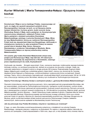 kurie rwile nski.lt http://kurierwilenski.lt/2013/05/03/maria-to maszewska-nalecz-o jczyzne-trzeba-ko chac/ Kurier Wileński | Maria Tomaszewska-Nałęcz: Ojczyznę trzeba kochać Wito ld Janczys Konstytucja 3 Maja w sercu każdego Polaka, rozpoczynając od tych, co nigdy nie opuścili ojczystych polskich stron Rzeczpospolitej i kończąc na tych, co od Ojczyzny dzielą tysiące kilometrów i kurtyny granic, budzi uczucie dumy. Obchodząc Święto 3 Maja, warto pamiętać, że Konstytucja była owocem pracy odważnych, oddanych Polsce ludzi. Warto pamiętać o dziejach potomków Stanisława Małachowskiego, jednego z autorów Konstytucji 3 Maja. Mimo że losy Małachowskich, którzy po rozbiorze Rzeczypospolitej Polski stali się obywatelami Imperium Rosyjskiego, obfitowały w dramatyczne momenty to, jako prawdziwi Polacy na zawsze zostali wierni ideałom: Bóg, Honor, Ojczyzna. Rozmawiamy z urodzoną i mieszkającą w Moskwie, Marią Tomaszewska-Nałęcz ze słynnej szlacheckiej rodziny Małachowskich. Od czasów, gdy hrabia Stanisław Małachowski złożył swój podpis pod Konstytucją 3 Maja, mija 222 lata. W rodzinnych archiwach zachowały się wspomnienia o Stanisławie, zwanego przez współczesnych mu osób, Arystydesem? Maria To mas z e ws ka-Nałę c z Fo t. arc hiwum Z achowało się niewiele… Strzępki wspomnień. Czas, czerwona rewolucja i stalinowskie represje boleśnie dotknęły rodzinę, a w archiwum powstały luki. Jednak na szczęście nie wszystko zniknęło. Udało się uratować wiadomości o dziejach rodziny w drugie połowie XIX stulecia. Prapradziadek Z ygmunt Adam Nałęcz-Małachowski osiedlił się w witebskiej guberni. Adam Adolf , starszy syn dostał się do Carskiej Akademii Sztuk Pięknych w Petersburgu, został architektem i prekursorem lotów na balonach. Gmach Letniego Teatru, który w Astrachaniu zaprojektował i zbudował Adam Adolf przetrwał prawie 100 lat. W 1976 roku zniszczył go niestety pożar. Bronisław, młodszy syn studiował na Technologicznym Instytucie. Gazety Petersburga i Moskwy kiedyś z zachwytem pisały o „gończej Bronisława Małachowskiego”. Ówcześni dziennikarze okrzyknęli gończą parowóz, który zaprojektował mój prapradziadek Bronisław. Jak już wspomniałam, studiował na Technologicznym Instytucie, następnie został inżynierem, szef em działu, który w zakładach Sormowa zajmował się opracowaniem i budową nowych parowozów. Parowóz poruszał się z niewiarygodną w tamtych czasach szybkością: do 125 kilometrów na godzinę. Właśnie dzięki „gończej Małachowskiego” podróż Moskwa — Sankt-Petersburg trwała zaledwie 6 godzin. Z aledwie kilka lat wstecz na kolei łączącej Moskwę i Petersburg pojawiły się lokomotywy nowego pokolenia, które są w stanie pokonać trasę w 4 godziny. Wkrótce po rewolucji prapradziadek przeniósł się z Niżniego Nowgorodu do Moskwy, gdzie został kierownikiem działu budowy parowozów Państwowego Z wiązku zakładów technicznych. Jednocześnie wykładał na Moskiewskiej Uczelni Technicznej. Jak się potoczyły losy Polaka Bronisława, inżyniera i wynalazcy po rewolucji? Z tego, co wiem, Bronisław został bezpodstawnie oskarżony o działalność na szkodę Z wiązku Radzieckiego, następnie skazany i uwięziony na Sołowkach. Po wyjściu z więzienia władze zabroniły mu powrotu do Leningradu. Z marł prapradziadek w 1934 roku. Jego syn, a mój dziadek, który również miał na powrotu do Leningradu. Z marł prapradziadek w 1934 roku. Jego syn, a mój dziadek, który również miał na imię Bronisław (znany architekt i autor rysunków satyrycznych) w 1937 roku został oskarżony o szpiegostwo na rzecz Polski i rozstrzelany. A, może jednak szpiegował? Jestem pewna, że w szpiegów dziadek się nie bawił. Był, jak wspomniałam, architektem, malarzem. Był bliskim przyjacielem słynnego rosyjskiego pisarza Alekseja Tołstoja i pierwszym ilustratorem jego książki dla dzieci „Z łoty Kluczyk”. Jakiś czas po tym, gdy dziadka rozstrzelano, w kolejnych nakładach książki były jego ilustracje, następnie zniknęło imię, a w późniejszych wydaniach zastąpiono je rysunkami innych malarzy. Babcia jednak przetrwała? Tak, przetrwała. Ale jakim kosztem… represje, szykanowanie. Ż ona „wroga ludu” i jeszcze na dodatek polskiego szpiega, w ówczesnych czasach było to niemal wyrokiem, skazującym człowieka na samotność i poniżenie. Czyli, co? Dopiero mąż siostry babci słynny malarz Altmann, pracownik renomowanego Teatru Maryjskiego z Leningradu ubłagał władze, aby babci pozwolono wrócić z zesłania. Okres II Wojny Światowej babcia z dziećmi (moja mama i wujek) spędziła w Permi. W 1948 roku babcię aresztowano, wtrącono do więzienia. Mimo wszelkich starań nie udało się ją z niego wydobyć… Z marła w celi. Wychowaniem mojej mamy i jej brata zajęła się siostra babci Maria, z domu Ternawcewa. Natomiast rodzina mojego ojca — Tomaszewscy zostali w obleganym przez Niemców Leningradzie. O tym, co musieli przetrwać cywile w czasie walk o Leningrad dotychczas mówi się półgębkiem… Tomaszewscy przetrwali oblężenie wyłącznie dzięki wręcz niewiarygodnym okolicznościom, które się złożyły na ich korzyść. Z anim doszło do oblężenia miasta przez niemieckie wojsko byli na Krymie. Uciekając przed blitzkriegiem, z Ukrainy wysłali pocztą kilka małych paczuszek z kawą, mąką i cukrem do Leningradu. Paczuszki dotarły do miasta wkrótce przed oblężeniem. Babcia dzieliła ich zawartość na drobniutkie porcje, swoisty dodatek do skromnych racji żywnościowych, jakie otrzymywali mieszkańcy Leningradu. Dziadkowie nawet potraf ili pomóc żywnością poetce Annie Achmatowej, z którą się przyjaźnili. Jednak, dobrze pamiętam z ich opowiadań, że dziadek Borys Tomaszewski (znany f ilolog) cudem uniknął śmierci na skutek głodu i wycieńczenia. Pamiętam również ich pełne strachu i zgrozy opowia