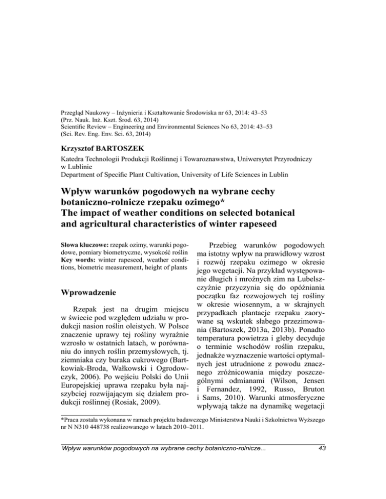 Przegląd Naukowy – Inżynieria i Kształtowanie Środowiska nr 63, 2014: 43–53 (Prz. Nauk. Inż. Kszt. Środ. 63, 2014) Scientific Review – Engineering and Environmental Sciences No 63, 2014: 43–53 (Sci. Rev. Eng. Env. Sci. 63, 2014) Krzysztof BARTOSZEK Katedra Technologii Produkcji Roślinnej i Towaroznawstwa, Uniwersytet Przyrodniczy w Lublinie Department of Specific Plant Cultivation, University of Life Sciences in Lublin Wpływ warunków pogodowych na wybrane cechy botaniczno-rolnicze rzepaku ozimego* The impact of weather conditions on selected botanical and agricultural characteristics of winter rapeseed Słowa kluczowe: rzepak ozimy, warunki pogodowe, pomiary biometryczne, wysokość roślin Key words: winter rapeseed, weather conditions, biometric measurement, height of plants Wprowadzenie Rzepak jest na drugim miejscu w świecie pod względem udziału w produkcji nasion roślin oleistych. W Polsce znaczenie uprawy tej rośliny wyraźnie wzrosło w ostatnich latach, w porównaniu do innych roślin przemysłowych, tj. ziemniaka czy buraka cukrowego (Bartkowiak-Broda, Wałkowski i Ogrodowczyk, 2006). Po wejściu Polski do Unii Europejskiej uprawa rzepaku była najszybciej rozwijającym się działem produkcji roślinnej (Rosiak, 2009). Przebieg warunków pogodowych ma istotny wpływ na prawidłowy wzrost i rozwój rzepaku ozimego w okresie jego wegetacji. Na przykład występowanie długich i mroźnych zim na Lubelszczyźnie przyczynia się do opóźniania początku faz rozwojowych tej rośliny w okresie wiosennym, a w skrajnych przypadkach plantacje rzepaku zaorywane są wskutek słabego przezimowania (Bartoszek, 2013a, 2013b). Ponadto temperatura powietrza i gleby decyduje o terminie wschodów roślin rzepaku, jednakże wyznaczenie wartości optymalnych jest utrudnione z powodu znacznego zróżnicowania między poszczególnymi odmianami (Wilson, Jensen i Fernandez, 1992, Russo, Bruton i Sams, 2010). Warunki atmosferyczne wpływają także na dynamikę wegetacji *Praca została wykonana w ramach projektu badawczego Ministerstwa Nauki i Szkolnictwa Wyższego nr N N310 448738 realizowanego w latach 2010–2011. Wpływ warunków pogodowych na wybrane cechy botaniczno-rolnicze... 43 w okresie jesiennym i wiosennym, a więc na wzrost roślin w tych porach roku. Słabsze przezimowanie rzepaku obserwuje się na plantacjach, gdzie rośliny przed zimą były zbyt wysokie, ponieważ przy ujemnych wartościach temperatury powietrza wyżej położony pąk wierzchołkowy jest narażony na oddziaływanie mroźnego wiatru (Dembiński, 1975). Natomiast pod koniec wiosny i na początku lata zbyt wysoki łan rzepaku jest narażony na wyleganie wskutek wystąpienia m.in. opadów gradu lub deszczu o dużym natężeniu (Muśnicki, 1989). Celem pracy było określenie wpływu warunków pogodowych na równomierność wschodów roślin rzepaku ozimego oraz wysokość łanu tej rośliny przed zimą i po fazie kwitnienia na obszarze środkowo-wschodniej Lubelszczyzny. Materiał i metody W pracy wykorzystano dane dotyczące ocen wyrzędowania wschodów rzepaku ozimego (Brassica napus) oraz wysokości tej rośliny przed zimą i po fazie kwitnienia. Wartości odnosiły się do wyników pomiarów oraz obserwacji wykonanych w Zakładzie Doświadczalnym Oceny Odmian w Bezku koło Chełma (51º11’N, 23º15’E, 224 m n.p.m.), należącym do Centralnego Ośrodka Badania Odmian Roślin Uprawnych (COBORU). Liczebność próby dla każdej z trzech analizowanych cech rzepaku ozimego była odmienna w związku z likwidacją doświadczeń w niektórych okresach wegetacji (silne susze jesienne, bardzo mroźne zimy) lub brakiem danych1. Do badań wybrano takie odmiany rzepaku ozimego, które były zarejestrowane przez COBORU i utrzymywały się w produkcji przynajmniej przez kilka lat. Zastosowanie nieparametrycznego testu U Manna-Whitneya pozwoliło wykazać brak istotnych statystycznie różnic (na poziomie α = 0,05) pomiędzy typami odmian rzepaku (erukowymi, bezerukowymi, populacyjnymi oraz mieszańcowymi). Oznacza to, że charakteryzowane na ich podstawie cechy są reprezentatywne dla całego gatunku. Ocenę wyrzędowania (w skali 9-stopniowej) dokonywano w fazie pełni wschodów (tab. 1), kiedy to mierzono na wybranym rzędzie poletka łączną długość odcinków bez roślin (tj. przerw w rzędzie) przekraczających 30 cm (Heimann i Broniarz, 2008). Im bardziej są TABELA 1. Skala wyrzędowania rzepaku ozimego TABLE 1. The rate of winter rapeseed emergence 9 Suma odcinków rzędu (>30 cm) bez roślin The sum of row length (>30 cm) with lack of plants [m] – 8 0,31–0,60 7 0,61–1,20 6 1,21–2,10 5 2,11–3,00 4 3,01–3,90 3 3,91–5,10 2 5,11–6,30 1 >6,30 Skala The rate 1 Liczebność próby w przypadku oceny wyrzędowania wynosiła n = 21, wysokości roślin rzepaku po fazie kwitnienia n = 25 (z okresu 1974/1975–2008/2009), natomiast wysokości roślin przed zimą n = 10 (1997/1998–2008/2009). 44 K. Bartoszek wyrównane wschody roślin, tym większa jest wartość oceny wyrzędowania. Pomiary wysokości roślin przed zimą wykonywano w początkowym okresie jesiennego zahamowania wegetacji, gdzie w pięciu wybranych miejscach poletka mierzono wysokość rozet (łanu liści) i obliczano średni wynik. Wysokość roślin po kwitnieniu jest to odległość od powierzchni gleby do wierzchołka wyprostowanych roślin ustawionych wzdłuż łaty pomiarowej. Pomiar ten wykonywano w trzech losowo wybranych miejscach na poletku, a wynik stanowiła średnia z wykonanych pomiarów (Heimann i Broniarz, 2008). Charakterystykę warunków pogodowych opracowano na podstawie danych pochodzących ze stacji meteorologicznej znajdującej się w sąsiedztwie pól doświadczalnych. W celu określenia związku między elementami meteoro- logicznymi a analizowanymi cechami botaniczno-rolniczymi rzepaku ozimego zastosowano korelację liniową Pearsona, gdzie istotność statystyczną współczynnika korelacji sprawdza