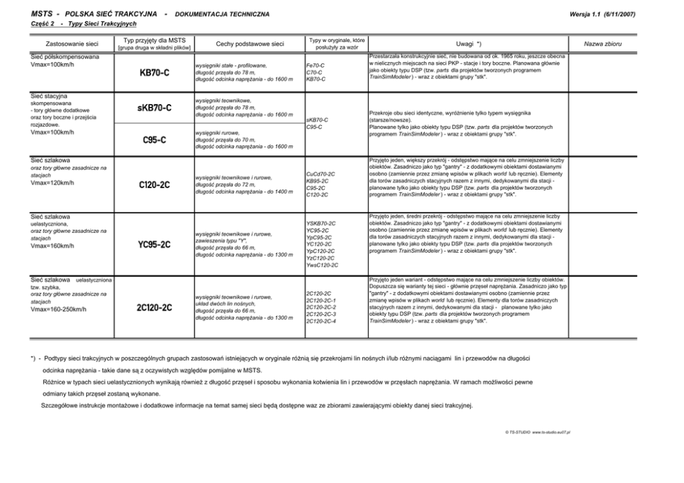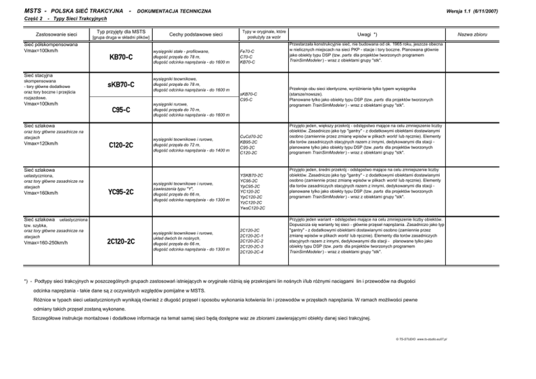 MSTS - POLSKA SIEĆ TRAKCYJNA Część 2 DOKUMENTACJA TECHNICZNA Wersja 1.1 (6/11/2007) - Typy Sieci Trakcyjnych Zastosowanie sieci Sieć półskompensowana Vmax=100km/h Typ przyjęty dla MSTS [grupa druga w składni plików] KB70-C wysięgniki stałe - profilowane, długość przęsła do 78 m, długość odcinka naprężania - do 1600 m sKB70-C wysięgniki teownikowe, długość przęsła do 78 m, długość odcinka naprężania - do 1600 m Sieć stacyjna skompensowana - tory główne dodatkowe oraz tory boczne i przejścia rozjazdowe. Vmax=100km/h Cechy podstawowe sieci C95-C wysięgniki rurowe, długość przęsła do 70 m, długość odcinka naprężania - do 1600 m Typy w oryginale, które posłużyły za wzór Fe70-C C70-C KB70-C sKB70-C C95-C Sieć szlakowa oraz tory główne zasadnicze na stacjach Vmax=120km/h C120-2C wysięgniki teownikowe i rurowe, długość przęsła do 72 m, długość odcinka naprężania - do 1400 m CuCd70-2C KB95-2C C95-2C C120-2C wysięgniki teownikowe i rurowe, zawieszenia typu "Y", długość przęsła do 66 m, długość odcinka naprężania - do 1300 m YSKB70-2C YC95-2C YpC95-2C YC120-2C YpC120-2C YzC120-2C YwsC120-2C Sieć szlakowa uelastyczniona, oraz tory główne zasadnicze na stacjach Vmax=160km/h YC95-2C Sieć szlakowa uelastyczniona tzw. szybka, oraz tory główne zasadnicze na stacjach Vmax=160-250km/h 2C120-2C wysięgniki teownikowe i rurowe, układ dwóch lin nośnych, długość przęsła do 66 m, długość odcinka naprężania - do 1300 m 2C120-2C 2C120-2C-1 2C120-2C-2 2C120-2C-3 2C120-2C-4 Uwagi *) Nazwa zbioru Przestarzała konstrukcyjnie sieć, nie budowana od ok. 1965 roku, jeszcze obecna w nielicznych miejscach na sieci PKP - stacje i tory boczne. Planowana głównie jako obiekty typu DSP (tzw. parts dla projektów tworzonych programem TrainSimModeler ) - wraz z obiektami grupy "stk". Przekroje obu sieci identyczne, wyróżnienie tylko typem wysięgnika (starsze/nowsze). Planowane tylko jako obiekty typu DSP (tzw. parts dla projektów tworzonych programem TrainSimModeler ) - wraz z obiektami grupy "stk". Przyjęto jeden, większy przekrój - odstępstwo mające na celu zmniejszenie liczby obiektów. Zasadniczo jako typ "gantry" - z dodatkowymi obiektami dostawianymi osobno (zamiennie przez zmianę wpisów w plikach world lub ręcznie). Elementy dla torów zasadniczych stacyjnych razem z innymi, dedykowanymi dla stacji planowane tylko jako obiekty typu DSP (tzw. parts dla projektów tworzonych programem TrainSimModeler ) - wraz z obiektami grupy "stk". Przyjęto jeden, średni przekrój - odstępstwo mające na celu zmniejszenie liczby obiektów. Zasadniczo jako typ "gantry" - z dodatkowymi obiektami dostawianymi osobno (zamiennie przez zmianę wpisów w plikach world lub ręcznie). Elementy dla torów zasadniczych stacyjnych razem z innymi, dedykowanymi dla stacji planowane tylko jako obiekty typu DSP (tzw. parts dla projektów tworzonych programem TrainSimModeler ) - wraz z obiektami grupy "stk". Przyjęto jeden wariant - odstępstwo mające na celu zmniejszenie liczby obiektów. Dopuszcza się warianty tej sieci - głównie przęseł naprężania. Zasadniczo jako typ "gantry" - z dodatkowymi obiektami dostawianymi osobno (zamiennie przez zmianę wpisów w plikach world lub ręcznie). Elementy dla torów zasadniczych stacyjnych razem z innymi, dedykowanymi dla stacji - planowane tylko jako obiekty typu DSP (tzw. parts dla projektów tworzonych programem TrainSimModeler ) - wraz z obiektami grupy "stk". *) - Podtypy sieci trakcyjnych w poszczególnych grupach zastosowań istniejących w oryginale różnią się przekrojami lin nośnych i/lub różnymi naciągami lin i przewodów na długości odcinka naprężania - takie dane są z oczywistych względów pomijalne w MSTS. Różnice w typach sieci uelastycznionych wynikają również z długość przęseł i sposobu wykonania kotwienia lin i przewodów w przęsłach naprężania. W ramach możliwości pewne odmiany takich przęseł zostaną wykonane. Szczegółowe instrukcje montażowe i dodatkowe informacje na temat samej sieci będą dostępne waz ze zbiorami zawierającymi obiekty danej sieci trakcyjnej. © TS-STUDIO www.ts-studio.eu07.pl