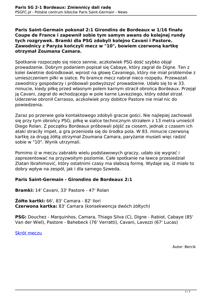Paris SG 2-1 Bordeaux: Zmiennicy dali radę PSGFC.pl - Polskie centrum kibiców Paris Saint-Germain - News Paris Saint-Germain pokonał 2:1 Girondins de Bordeaux w 1/16 finału Coupe de France i zapewnił sobie tym samym awans do kolejnej rundy tych rozgrywek. Bramki dla PSG zdobyli kolejno Cavani i Pastore. Zawodnicy z Paryża kończyli mecz w "10", bowiem czerwoną kartkę otrzymał Zoumana Camara. Spotkanie rozpoczęło się nieco sennie, aczkolwiek PSG dość szybko objął prowadzenie. Dobrym podaniem popisał się Cabaye, który zagrał do Digne. Ten z kolei świetnie dośrodkował, wprost na głowę Cavaniego, który nie miał problemów z umieszczeniem piłki w siatce. Po bramce mecz nabrał nieco rozpędu. Przeważali zawodnicy gospodarzy i próbowali podwyższyć prowadzenie. Udało się to w 33. minucie, kiedy piłkę przed własnym polem karnym stracił obrońca Bordeaux. Przejął ją Cavani, zagrał do wchodzącego w pole karne Lavezziego, który oddał strzał. Uderzenie obronił Carrasso, aczkolwiek przy dobitce Pastore nie miał nic do powiedzenia. Zaraz po przerwie gola kontaktowego zdobyli gracze gości. Nie najlepiej zachowali się przy tym obrońcy PSG; piłkę w siatce technicznym strzałem z 13 metra umieścił Diego Rolan. Z początku Bordeaux próbowali pójść za ciosem, jednak z czasem ich ataki straciły impet, a gra przeniosła się do środka pola. W 83. minucie czerwoną kartkę za drugą żółtą otrzymał Zoumana Camara, paryżanie musieli więc radzić sobie w "10". Wynik utrzymali. Pomimo iż w meczu zabrakło wielu podstawowych graczy, udało się wygrać i zaprezentować na przyzwoitym poziomie. Całe spotkanie na ławce przesiedział Zlatan Ibrahimović, który ostatnimi czasy ma słabszą formę. Wydaje się, iż miało to dobry wpływ na zespół, jak i dla samego Szweda. Paris Saint-Germain - Girondins de Bordeaux 2:1 Bramki: 14' Cavani, 33' Pastore - 47' Rolan Żółte kartki: 66', 83' Camara - 82' Ilori Czerwona kartka: 83' Camara (konsekwencja dwóch żółtych) PSG: Douchez - Marquinhos, Camara, Thiago Silva (C), Digne - Rabiot, Cabaye (85' Van der Wiel), Pastore - Bahebeck (76' Verratti), Cavani, Lavezzi (67' Lucas) Skrót meczu Autor: Bercik 1/1 Powered by TCPDF (www.tcpdf.org)